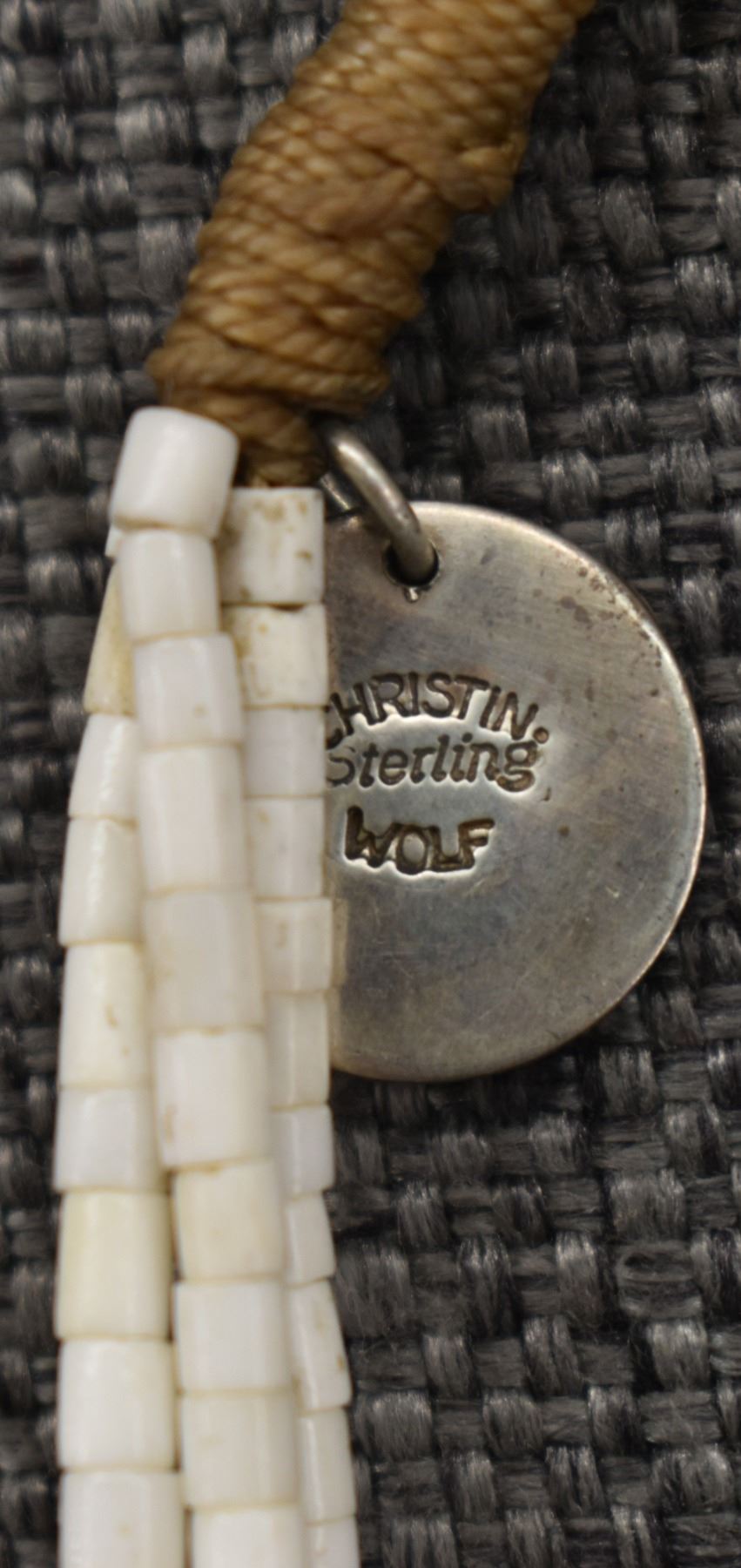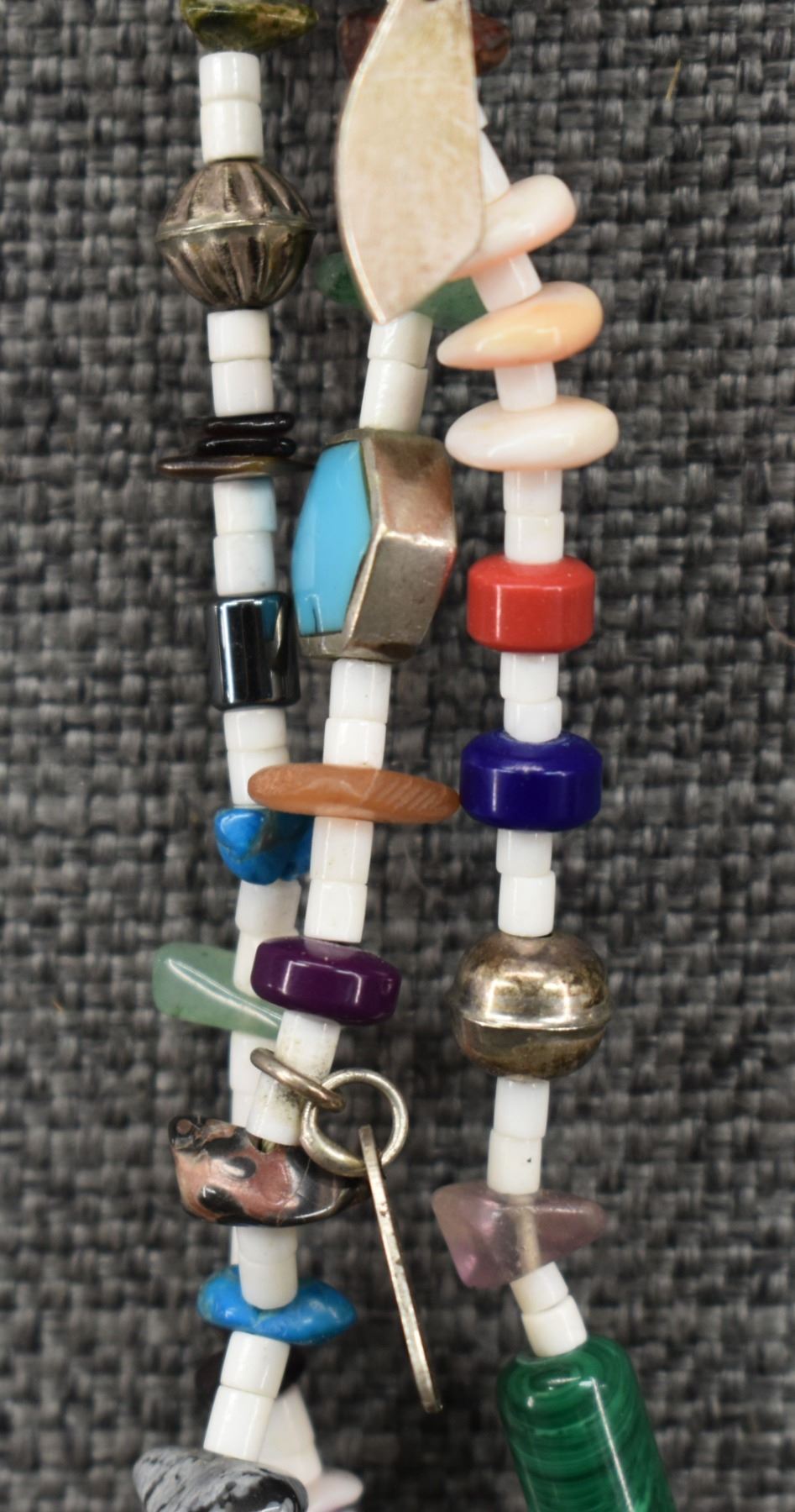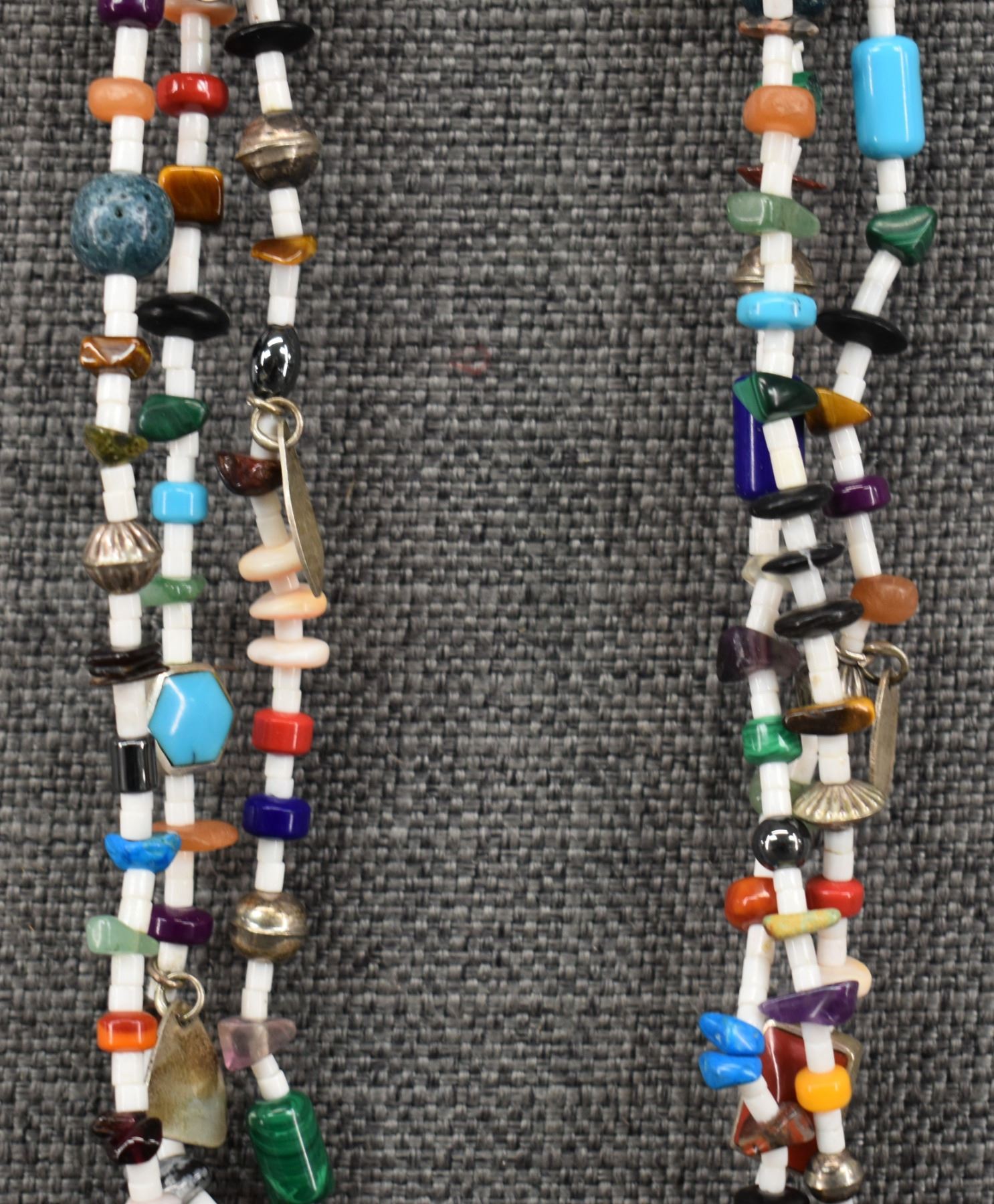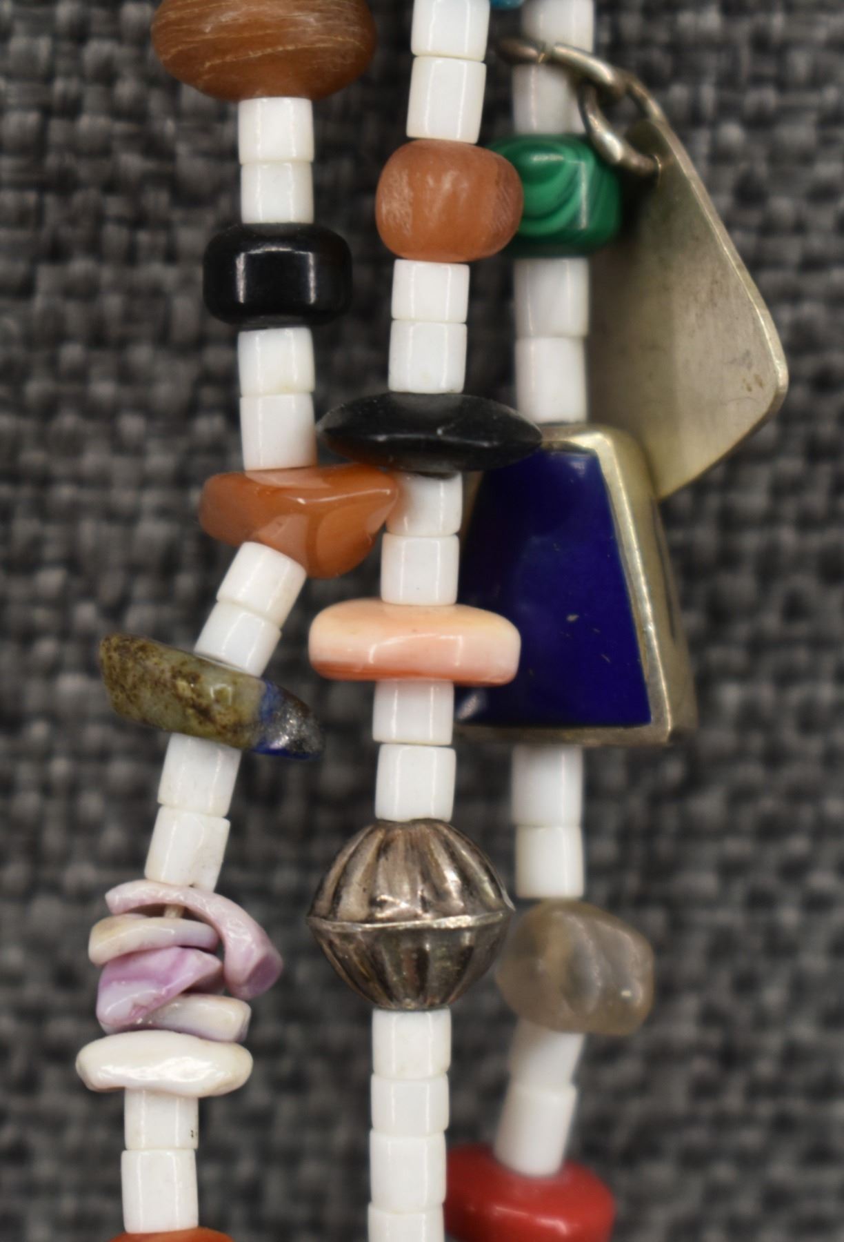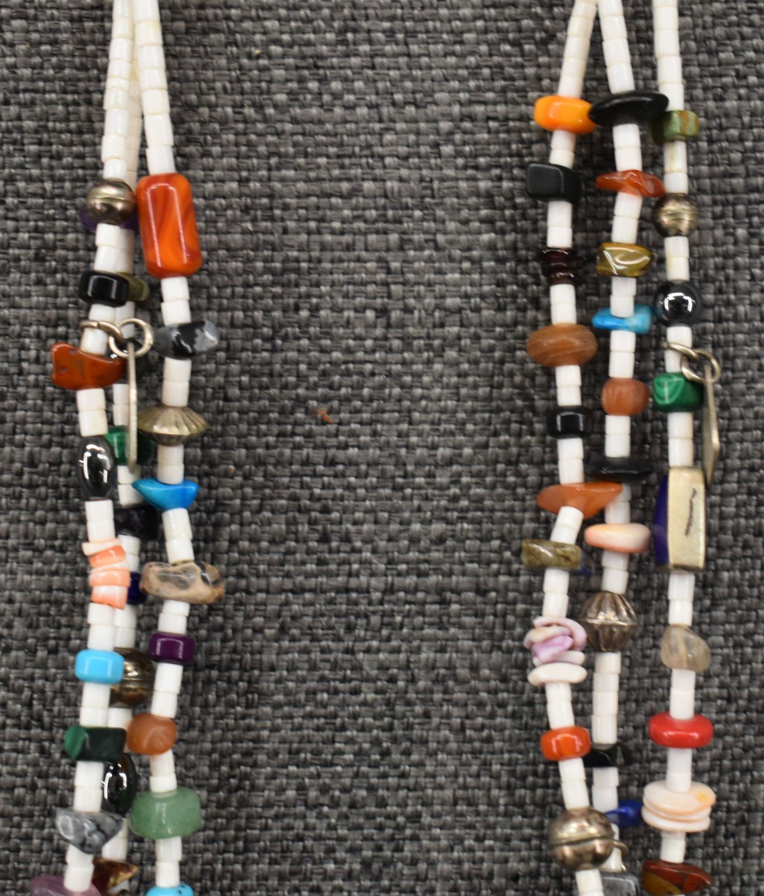 1990's Three strand of shell heishi with various stones and silver beads by Christian Wolf, 30" long