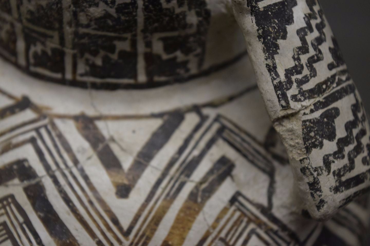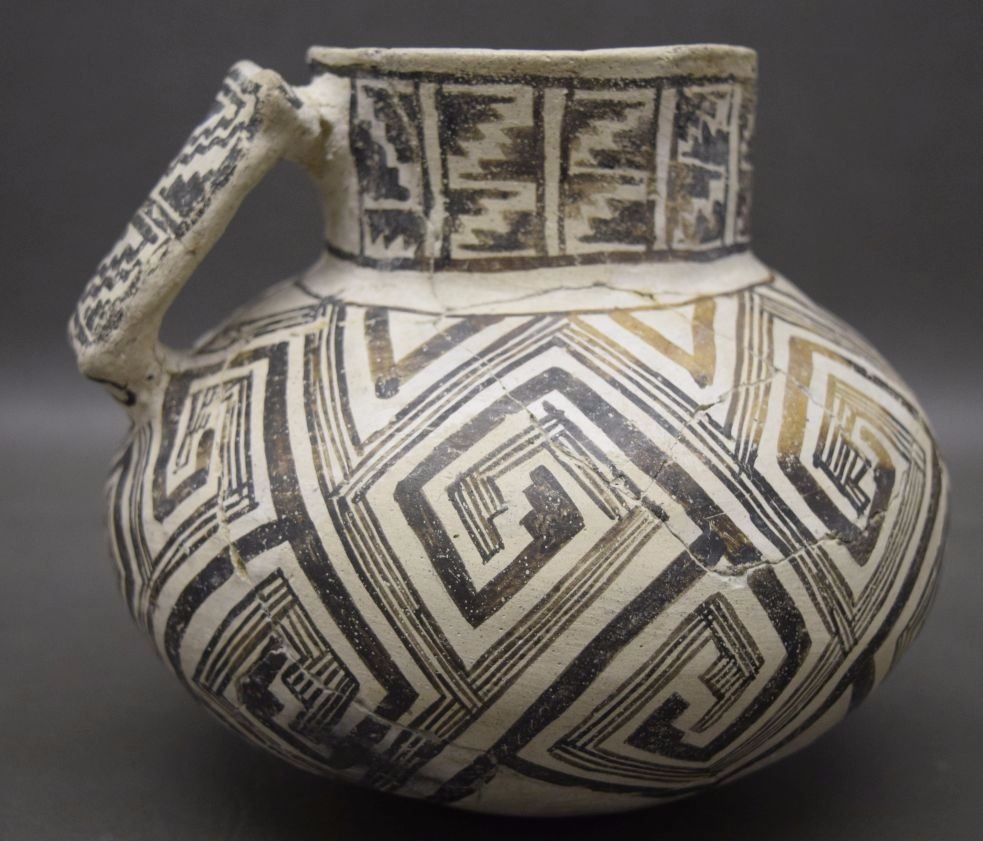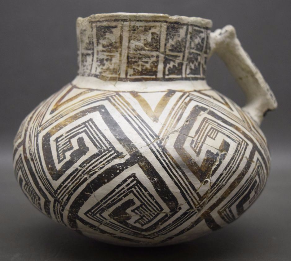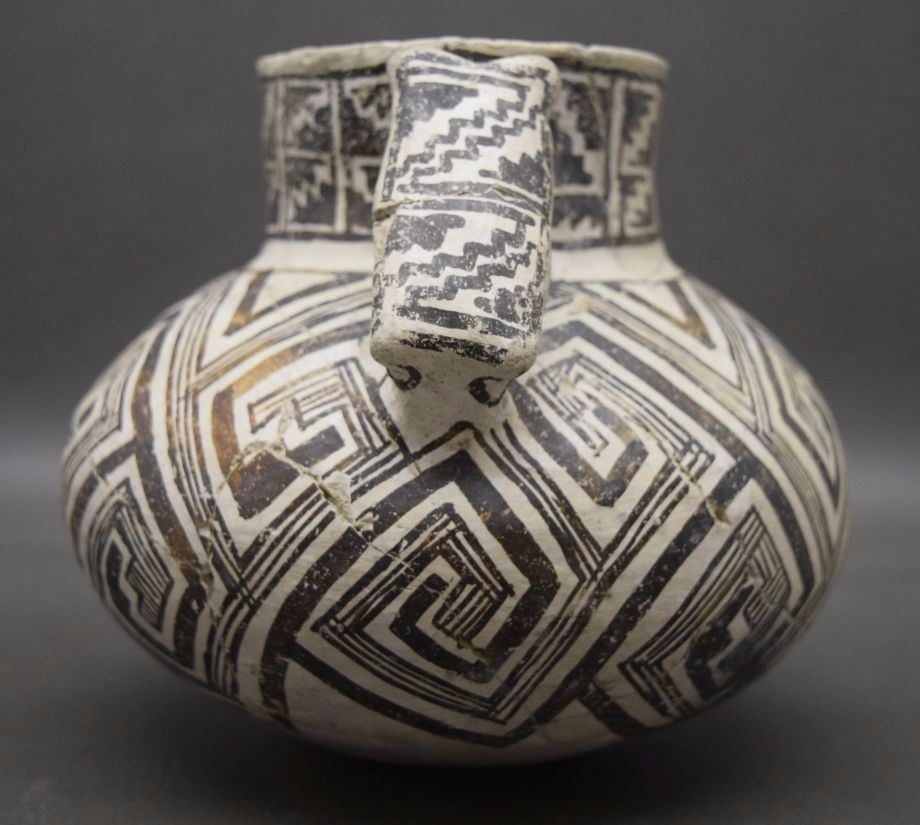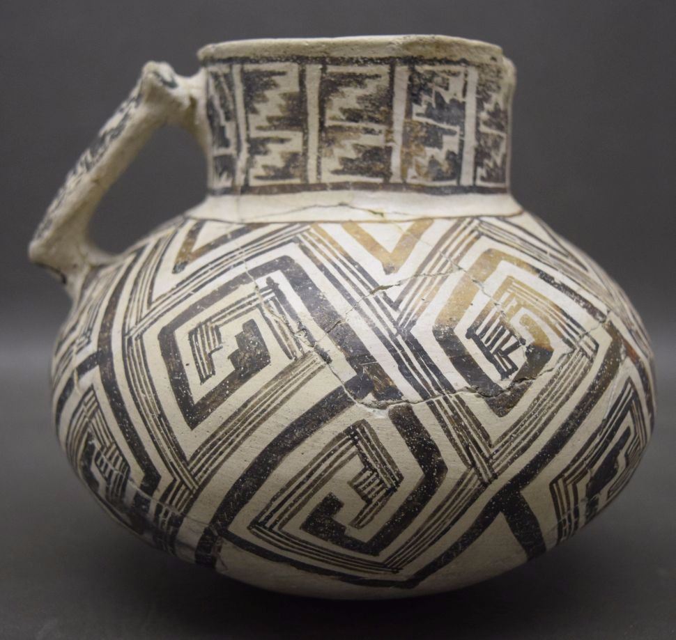 prehistoric pottery pitcher busy black on white painted design been broken and glued has plaster and repaint approx. 10%. 6'' x 7''