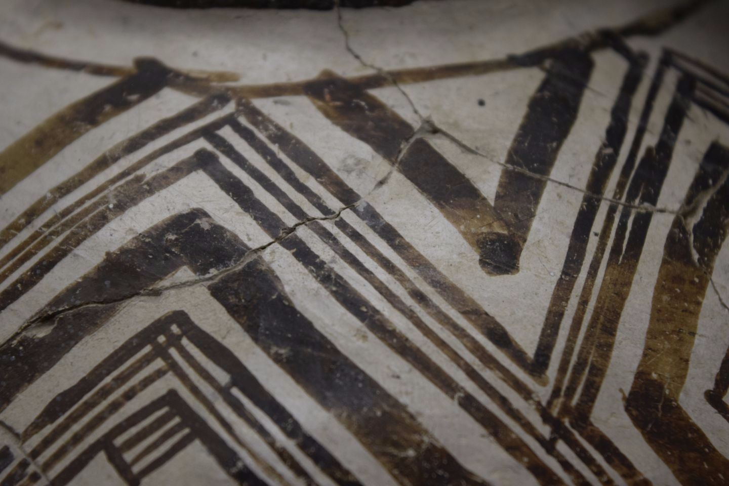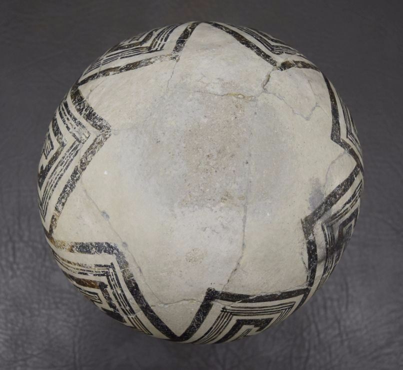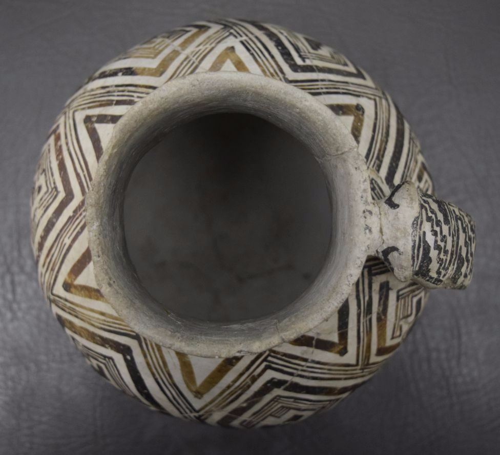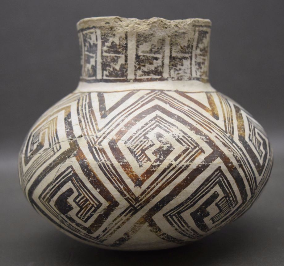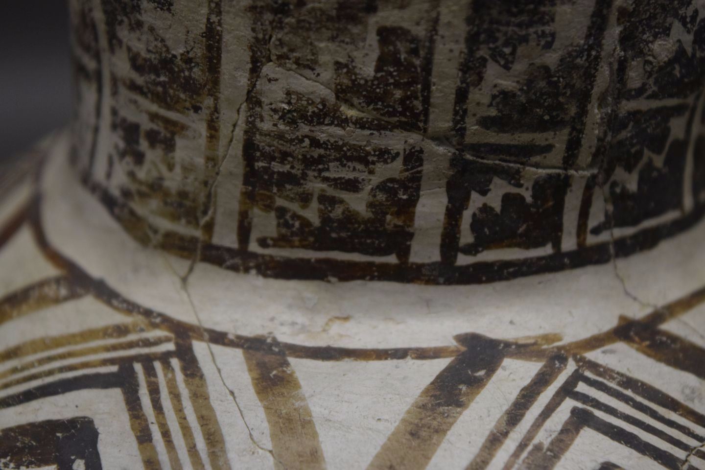 prehistoric pottery pitcher busy black on white painted design been broken and glued has plaster and repaint approx. 10%. 6'' x 7''