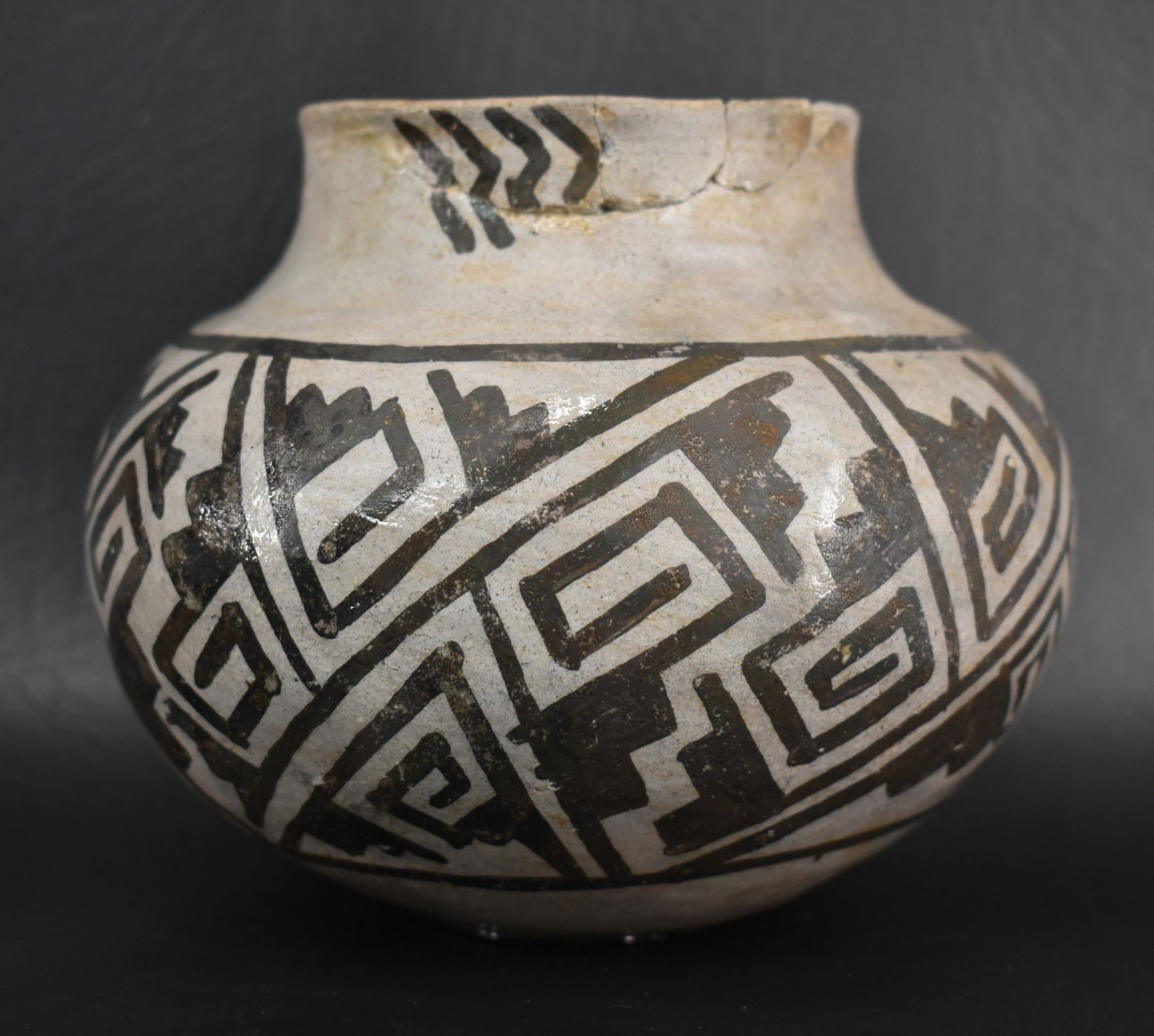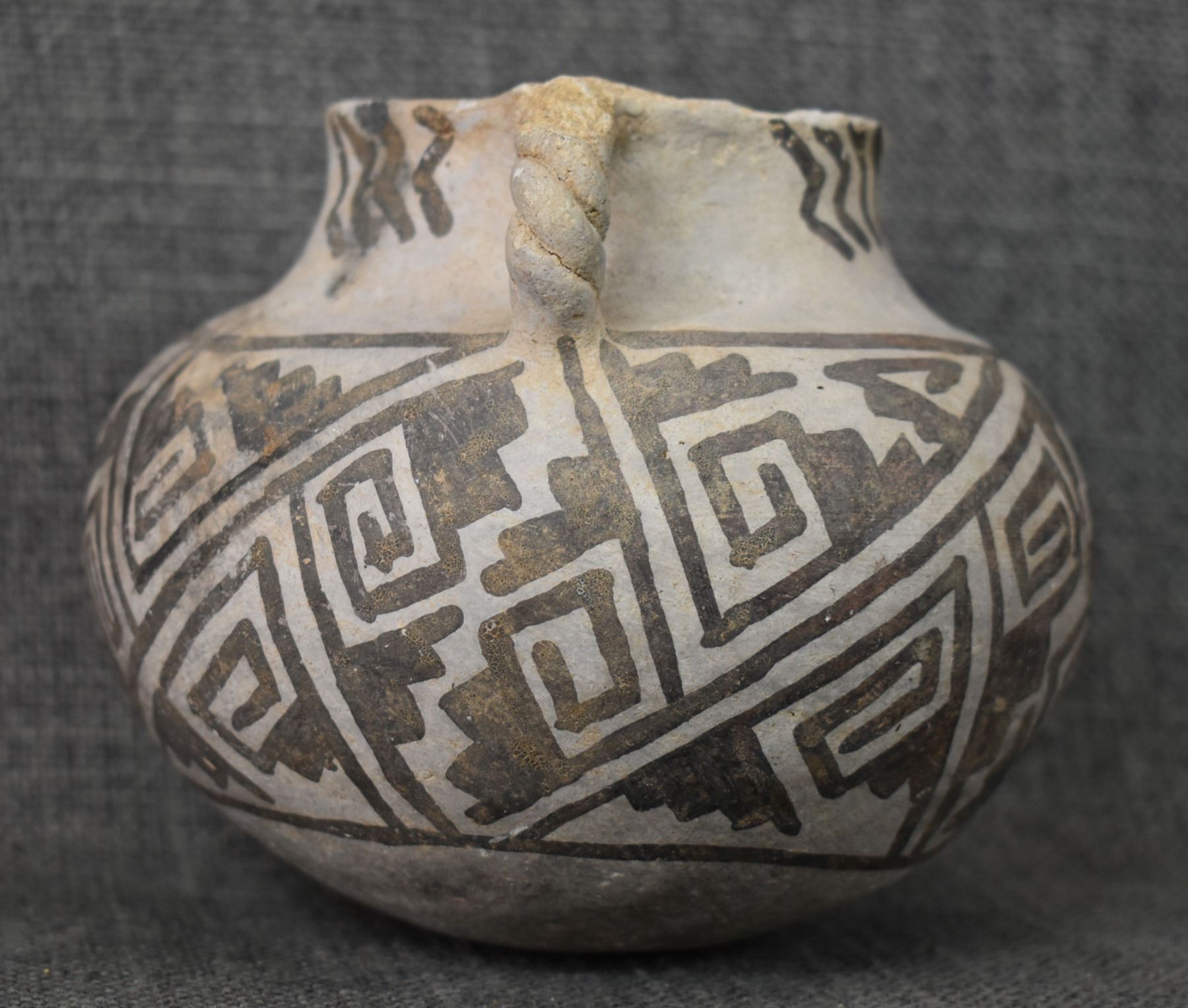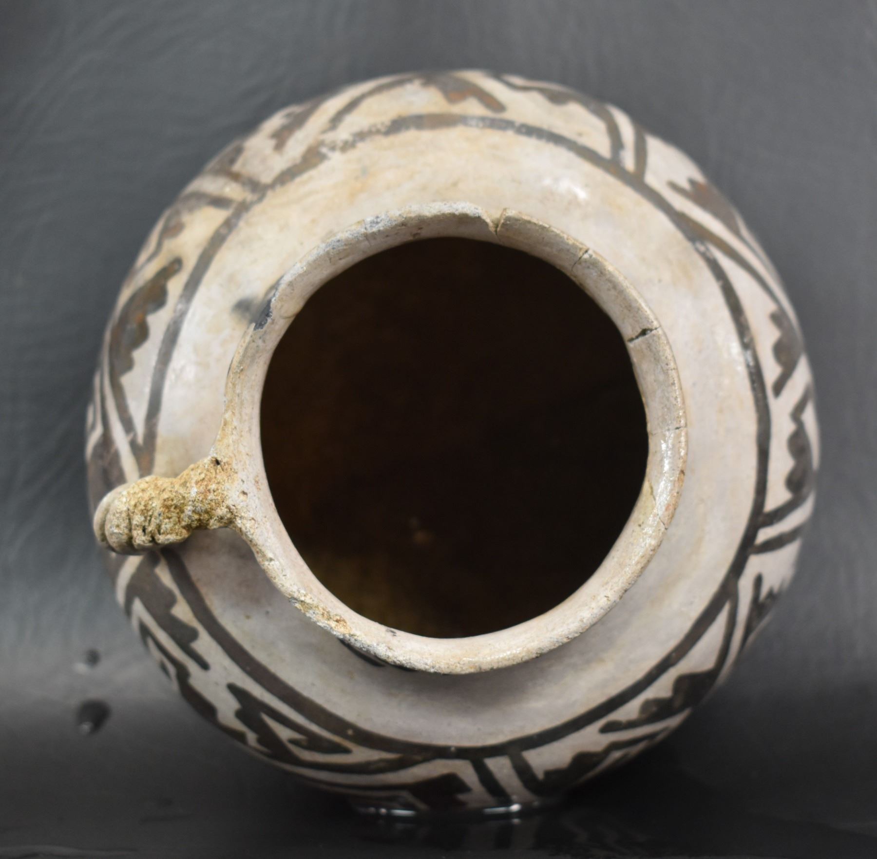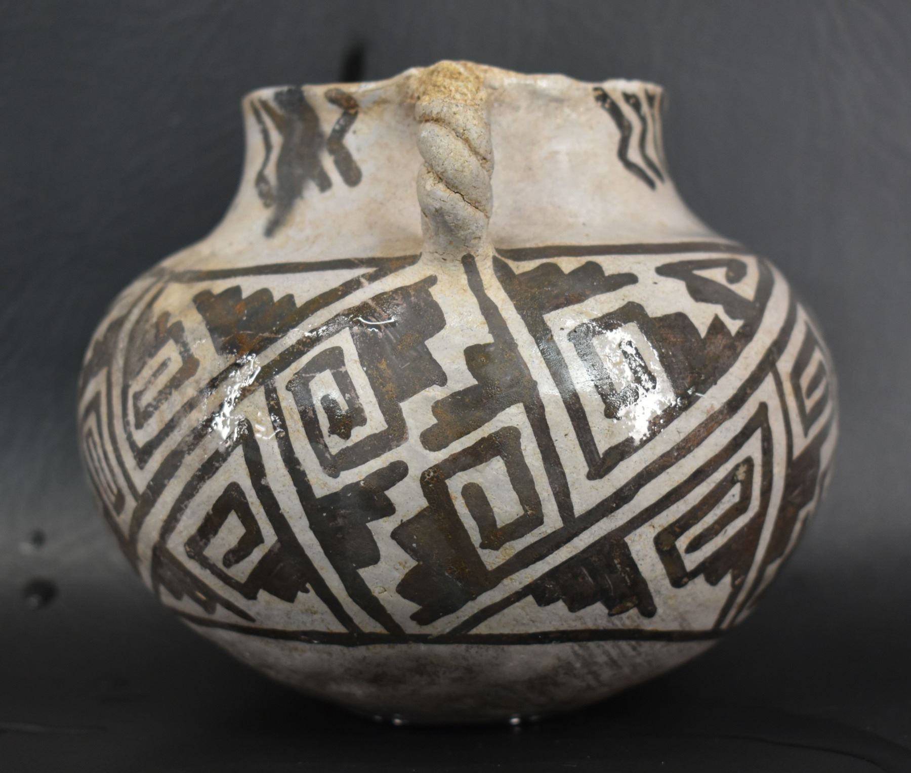 prehistoric Tularosa, hand coiled with black on white painted design 4.5" x 5.25" has been broken and glued