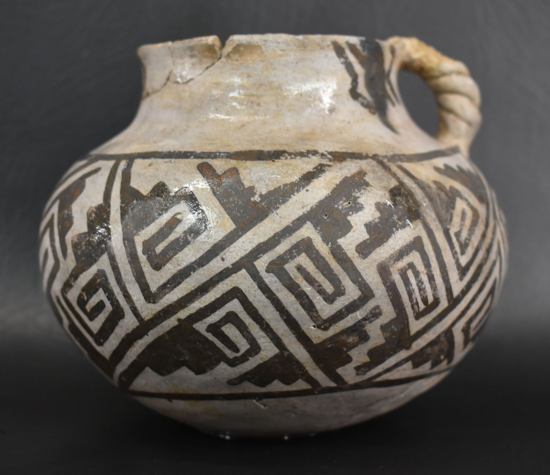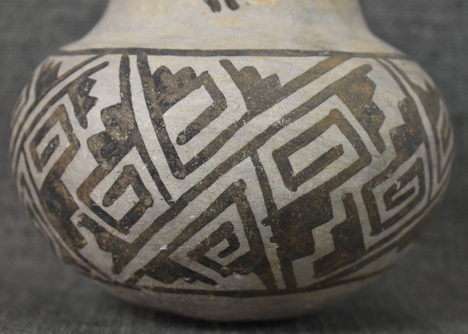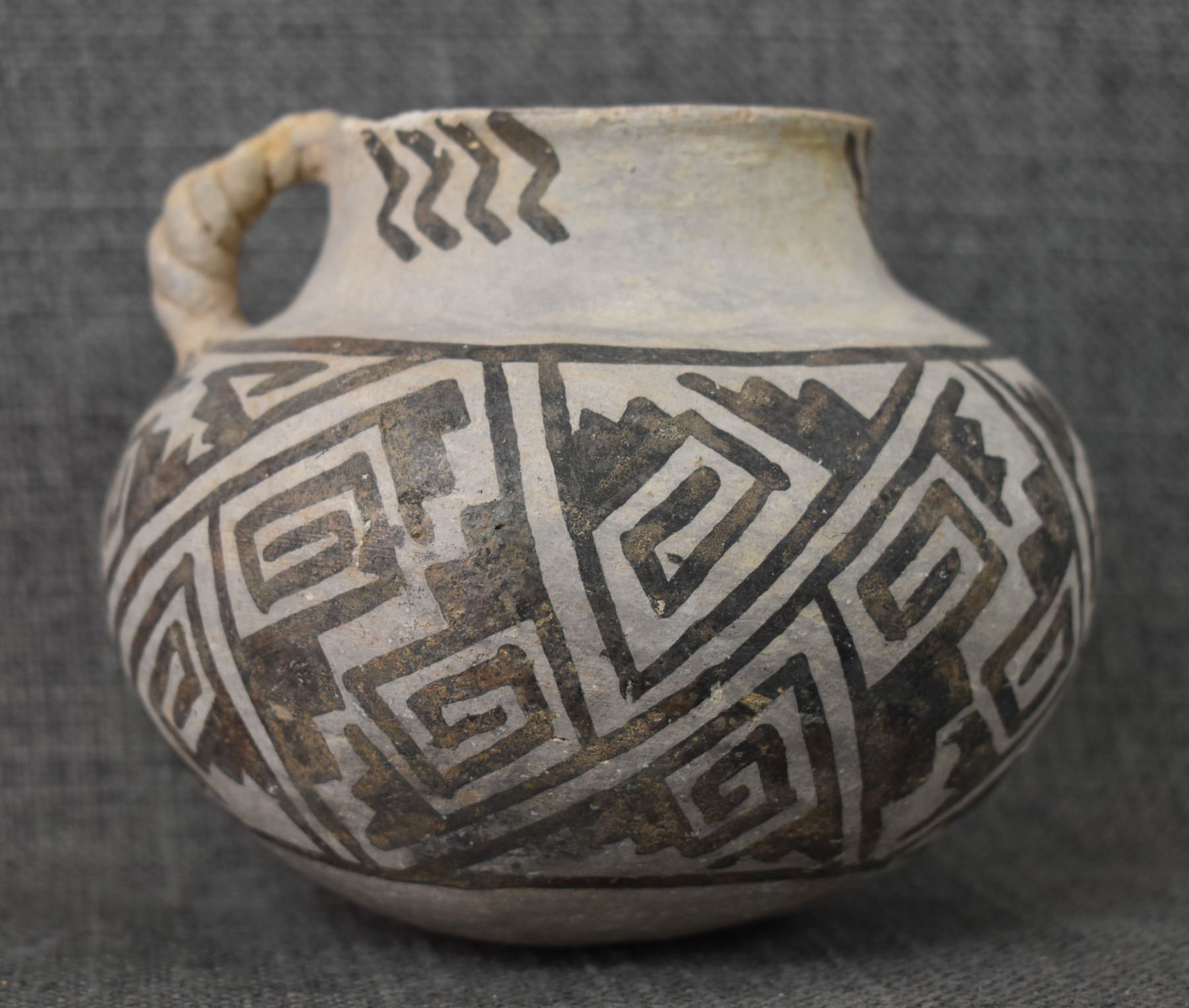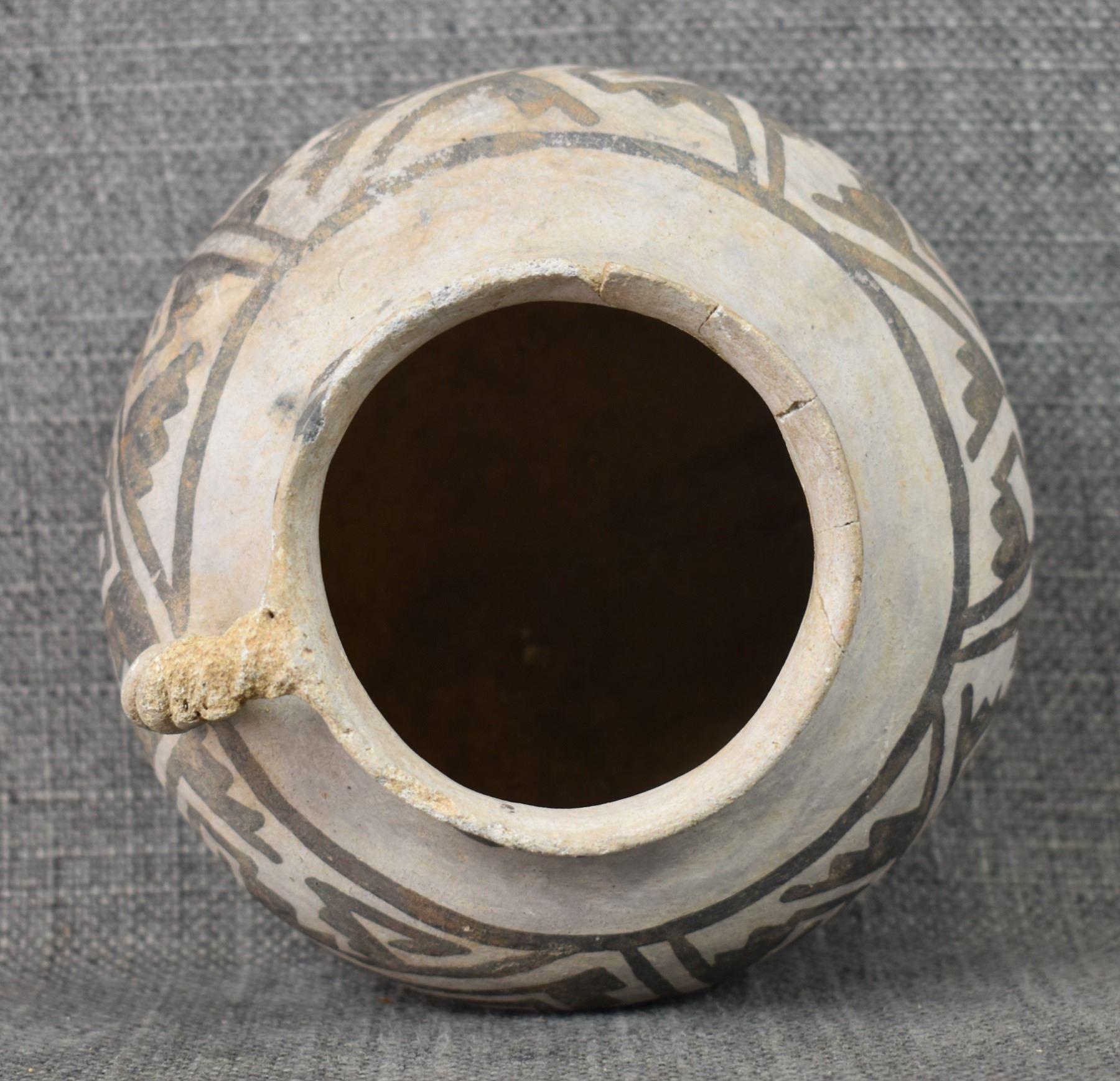 prehistoric Tularosa, hand coiled with black on white painted design 4.5" x 5.25" has been broken and glued