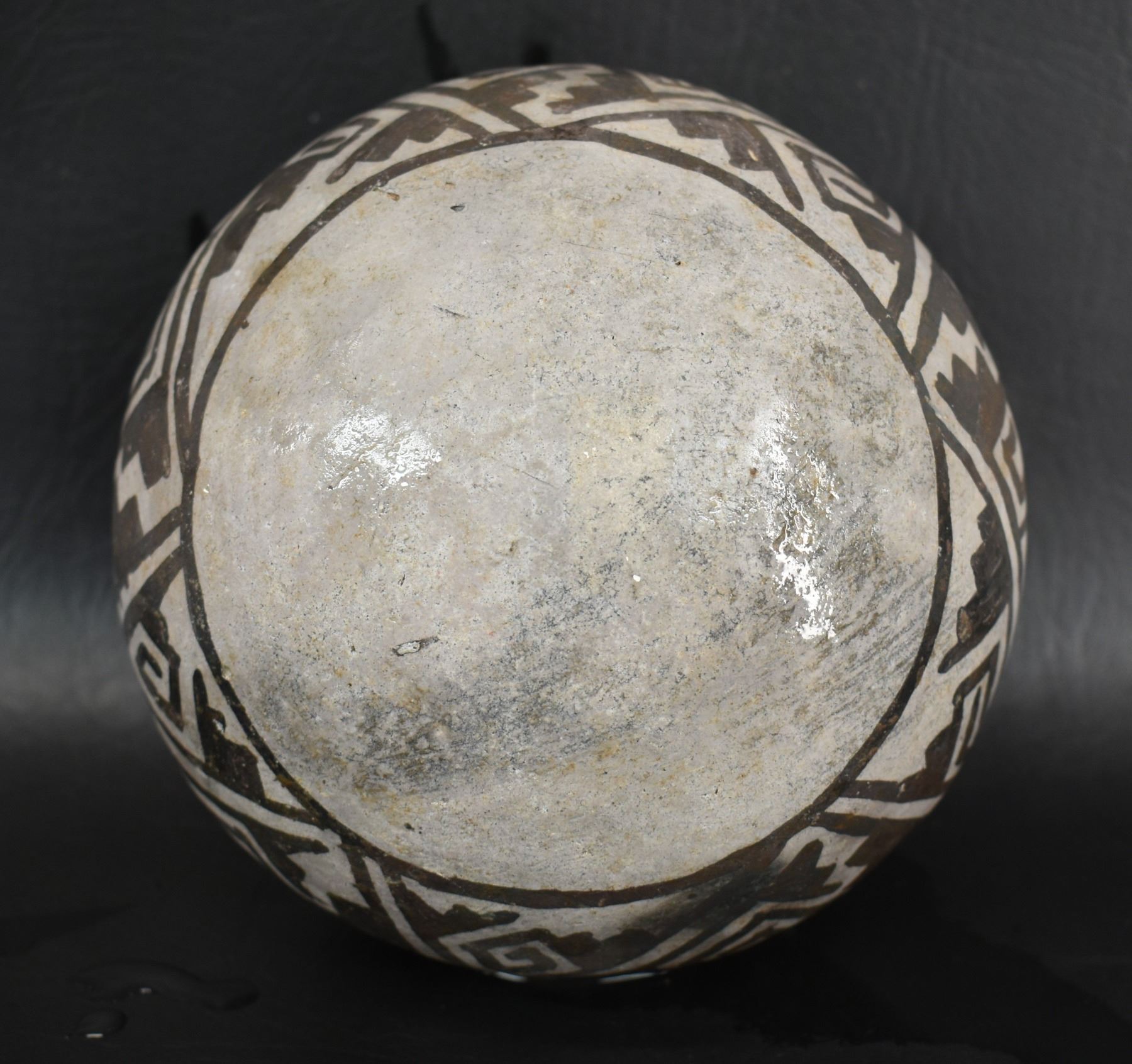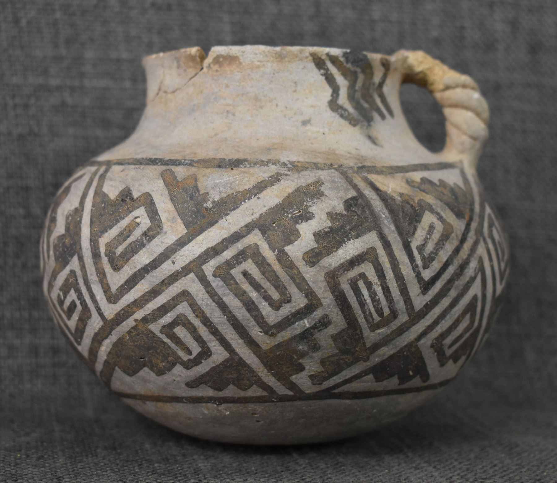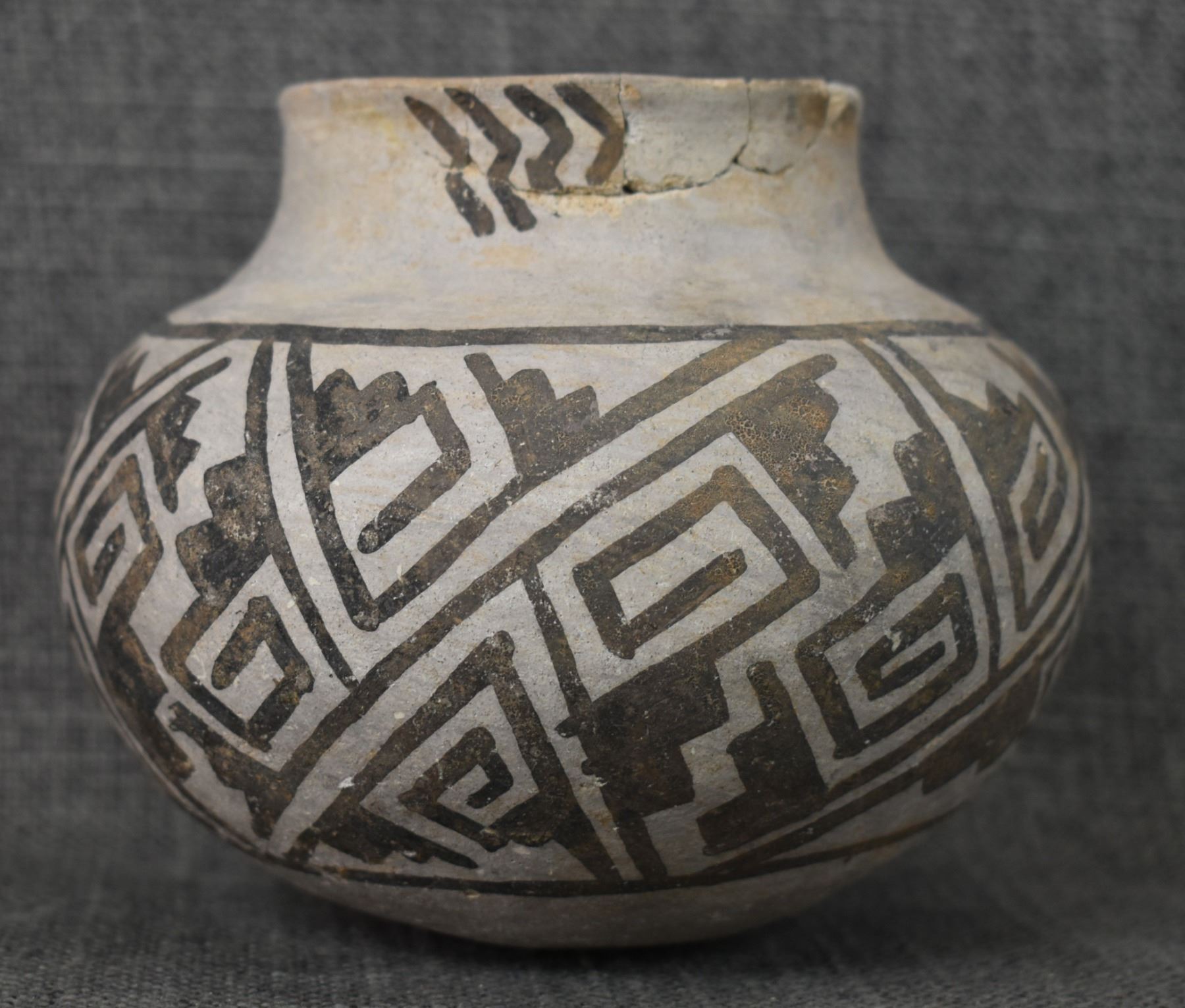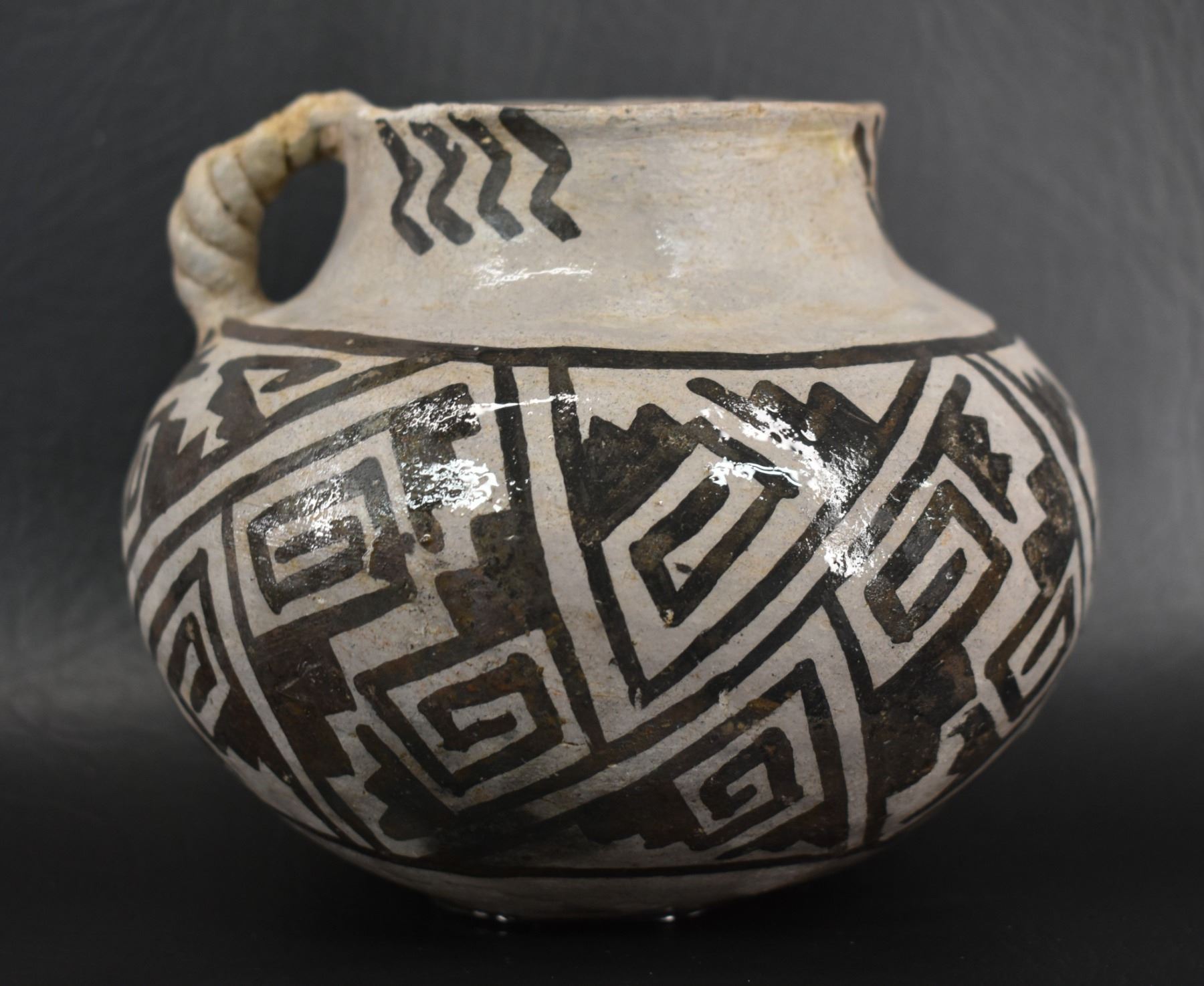 prehistoric Tularosa, hand coiled with black on white painted design 4.5" x 5.25" has been broken and glued