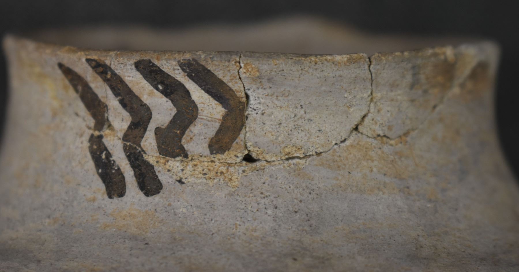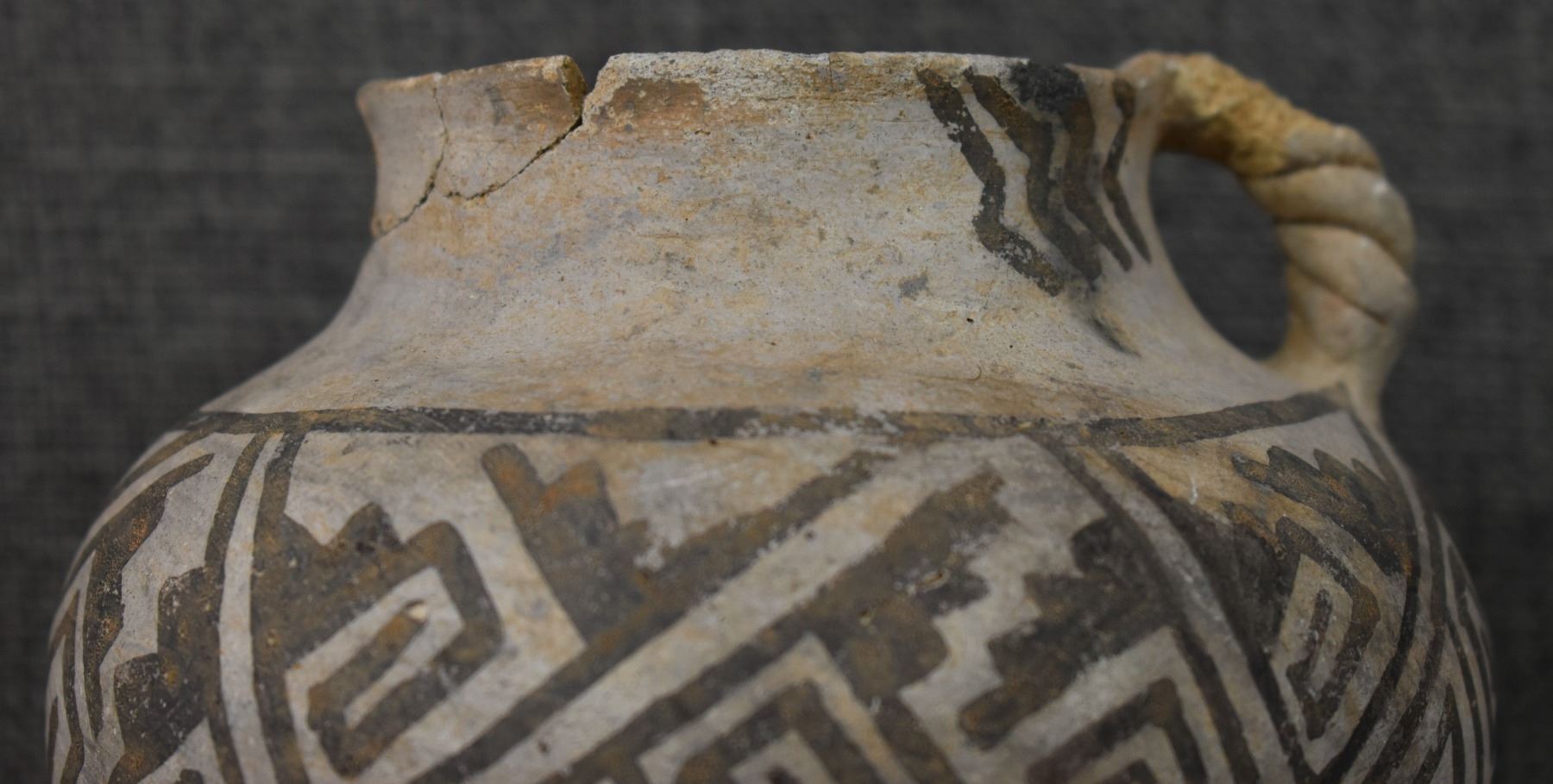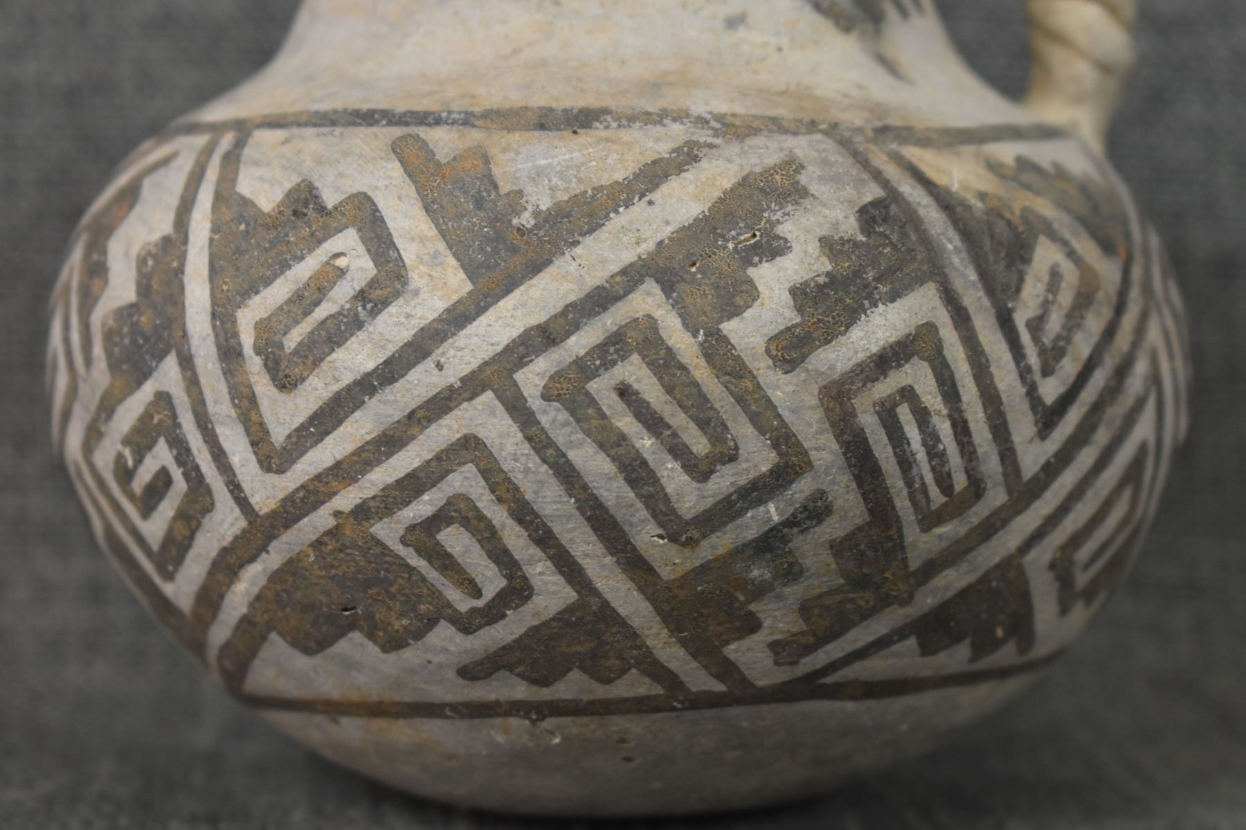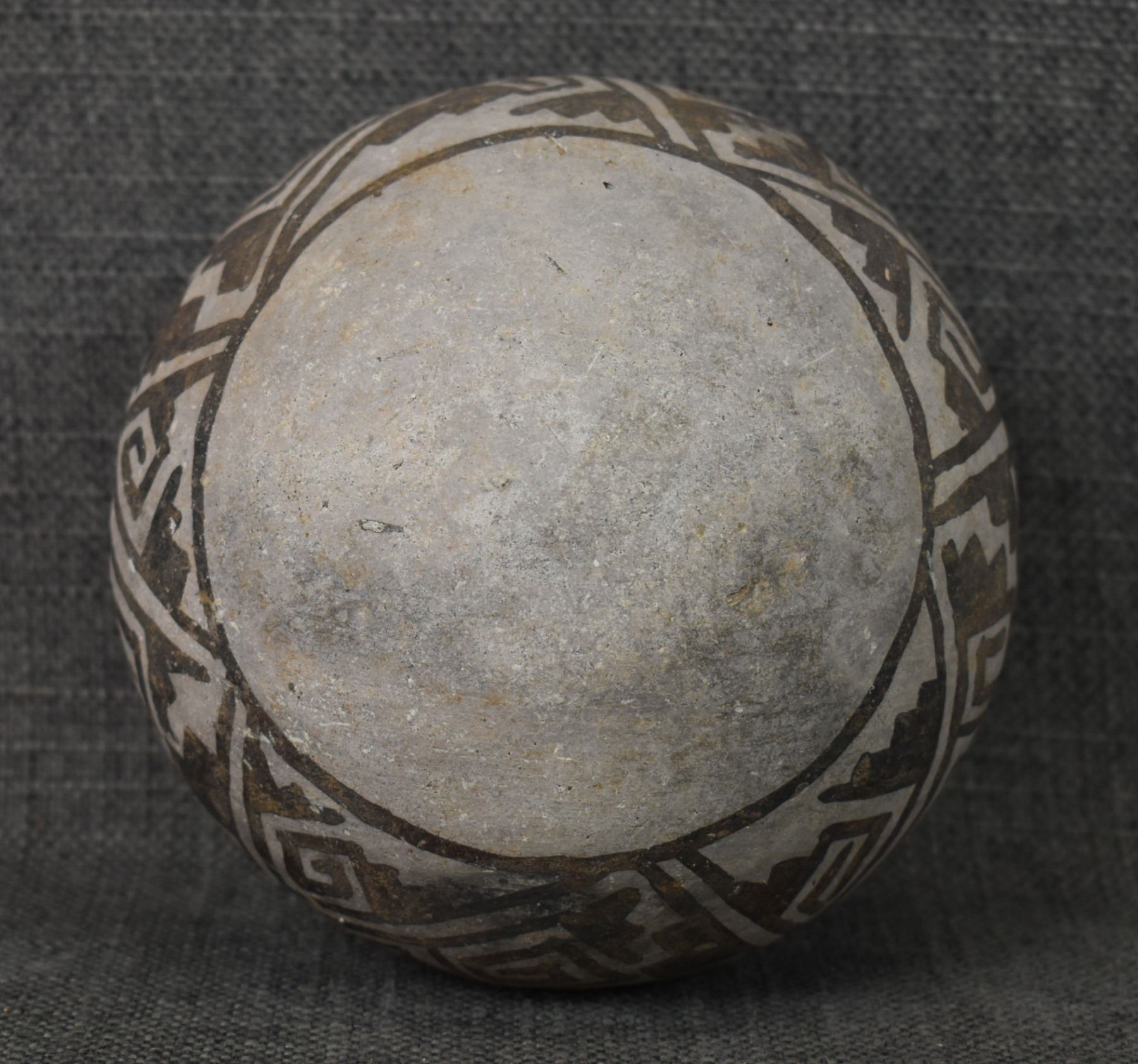 prehistoric Tularosa, hand coiled with black on white painted design 4.5" x 5.25" has been broken and glued