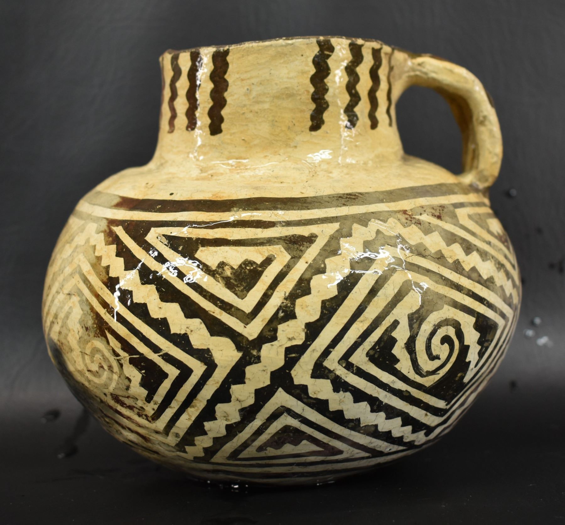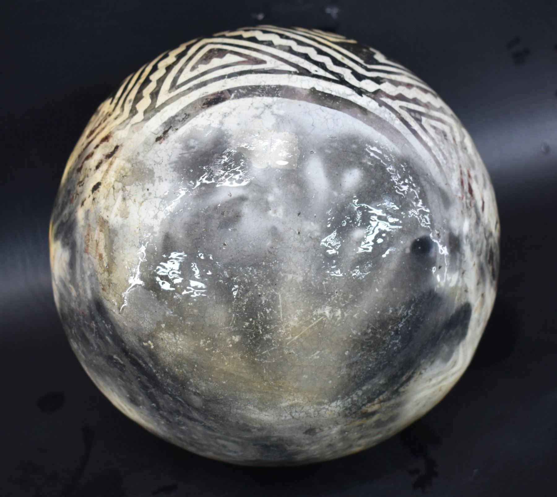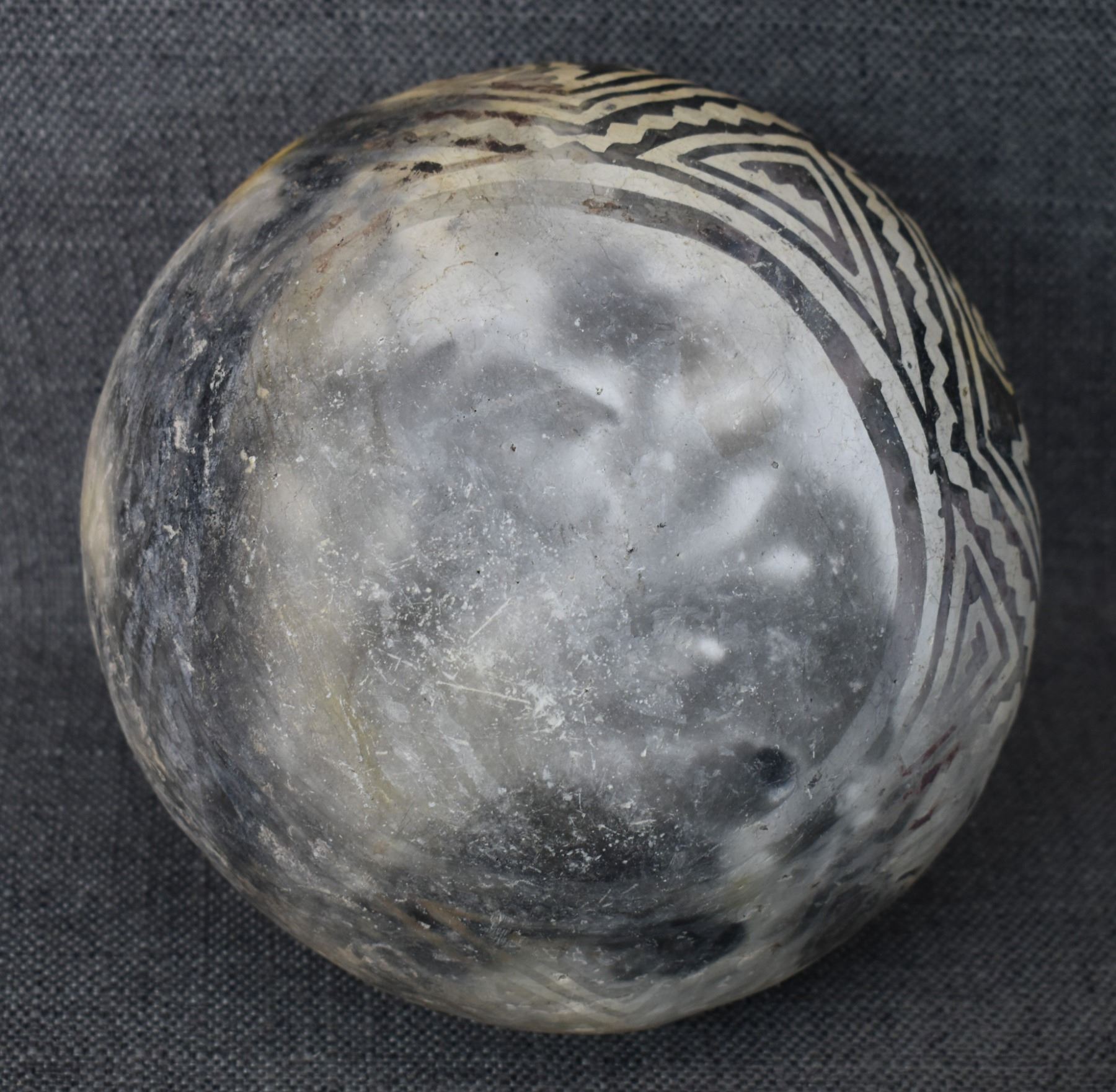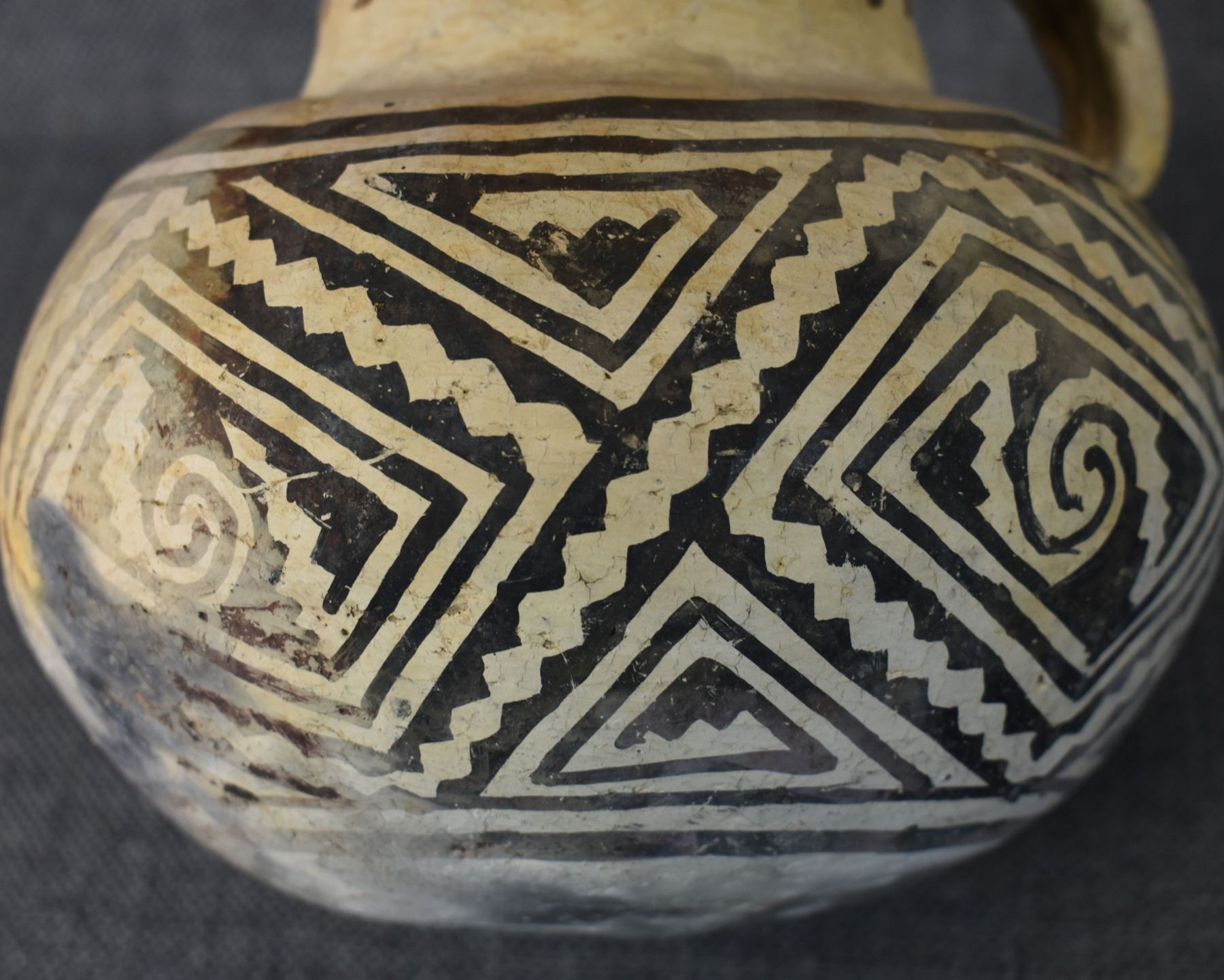 prehistoric Tularosa, hand coiled with black on white painted geometric design, 6.5" x 7" as found condition