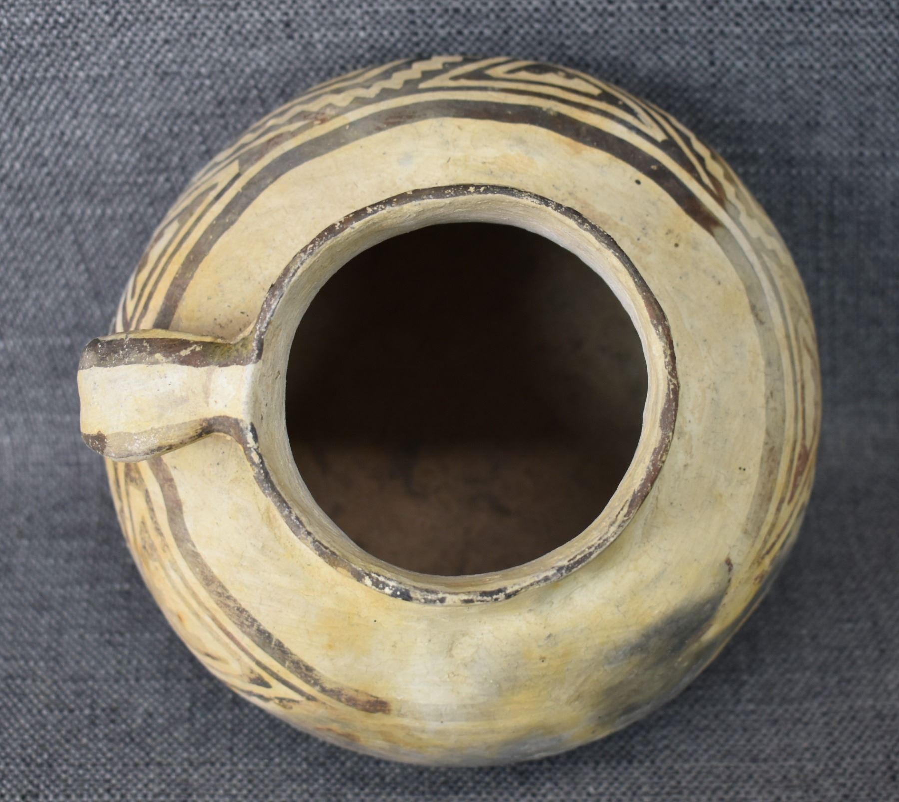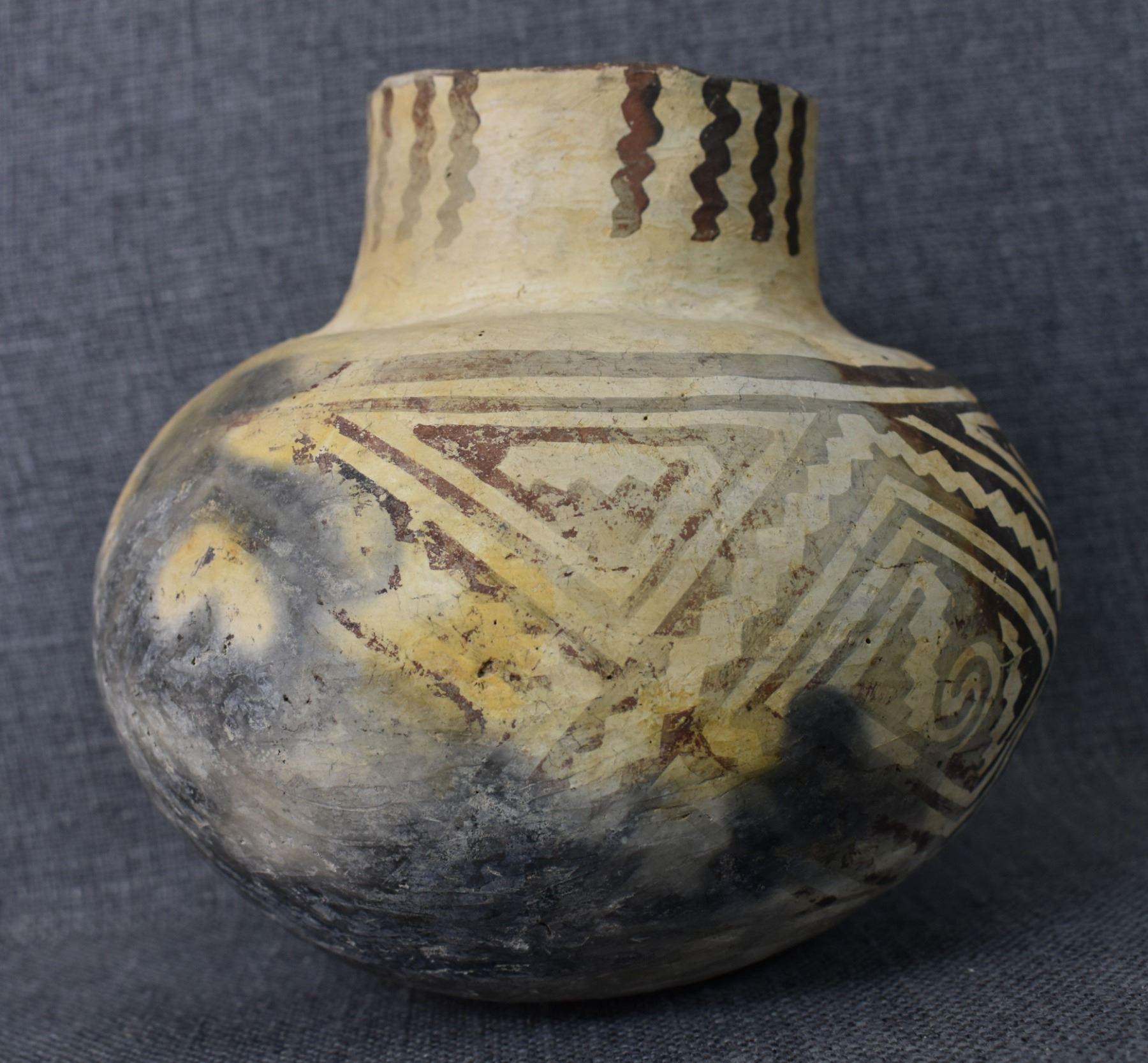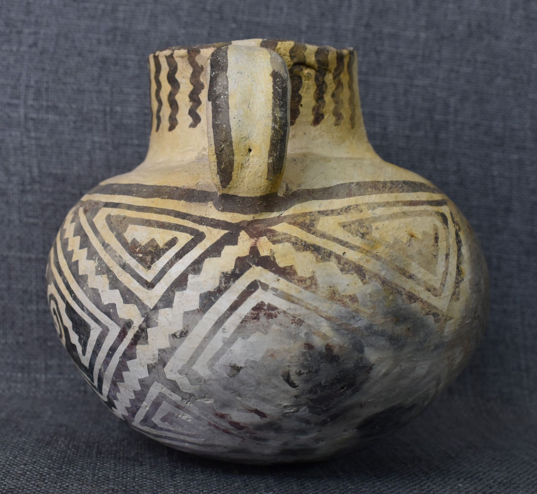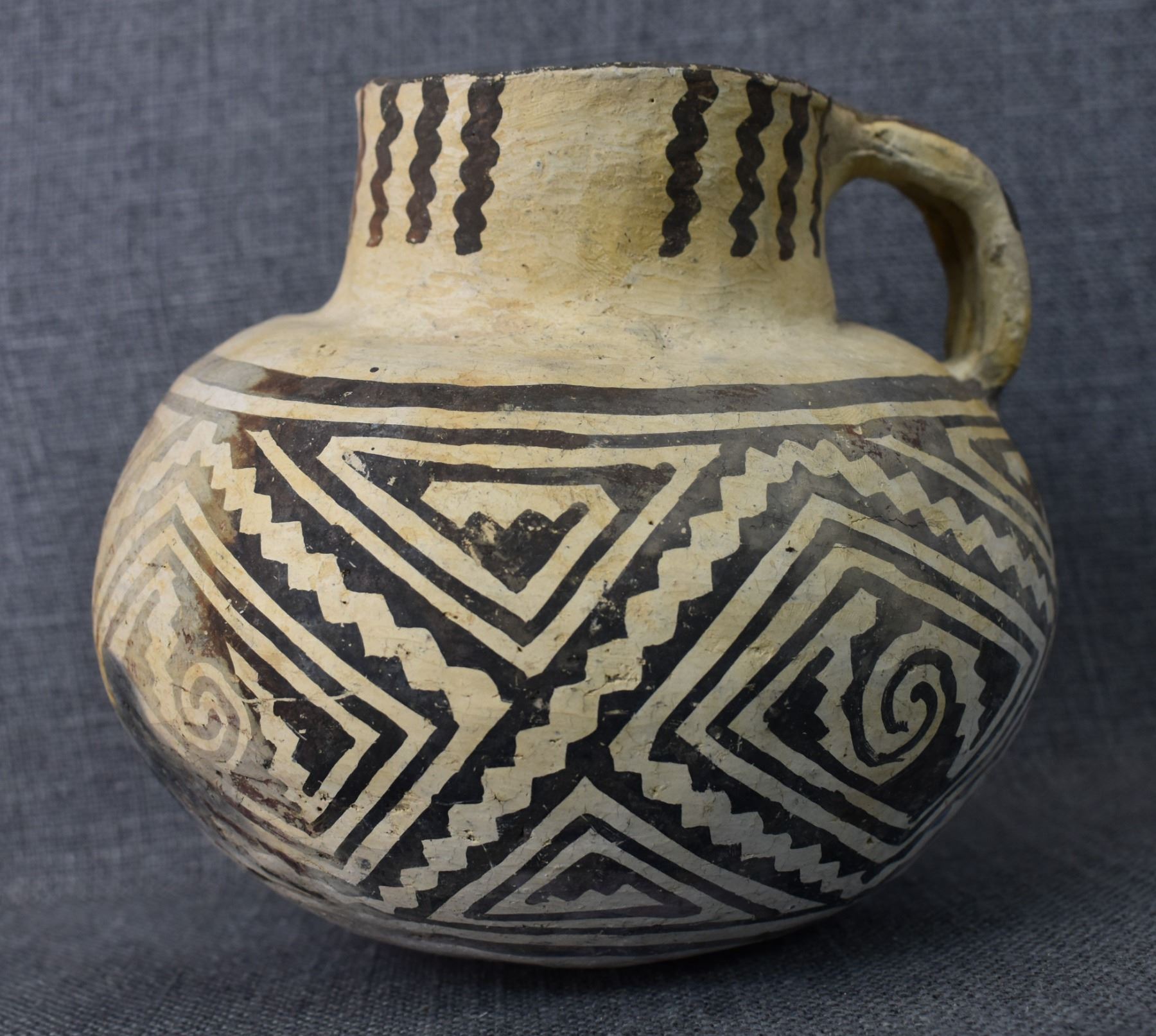 prehistoric Tularosa, hand coiled with black on white painted geometric design, 6.5" x 7" as found condition