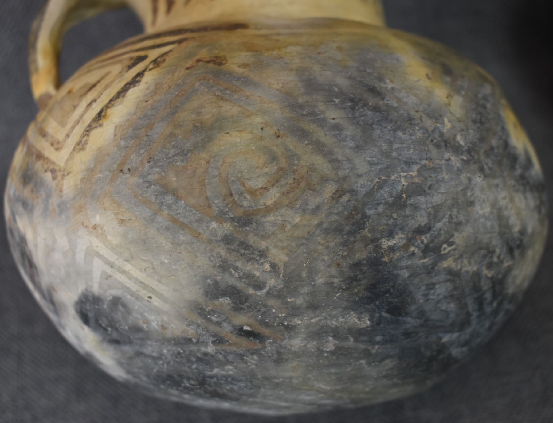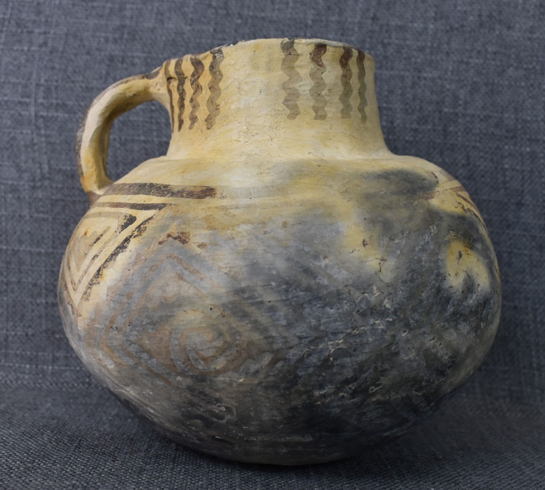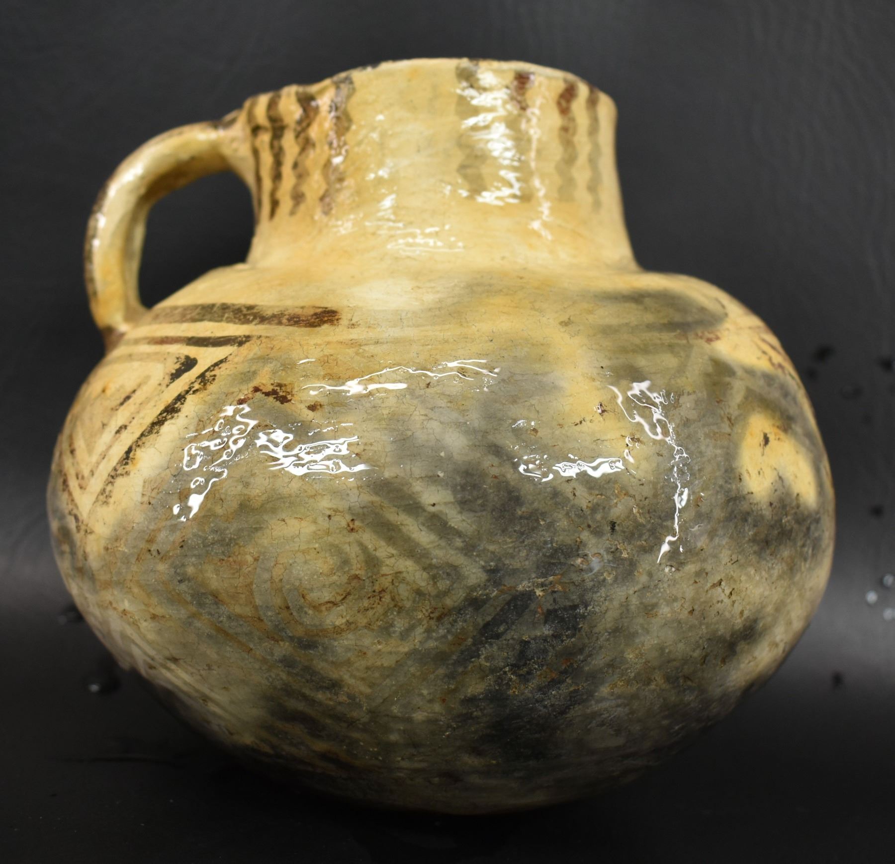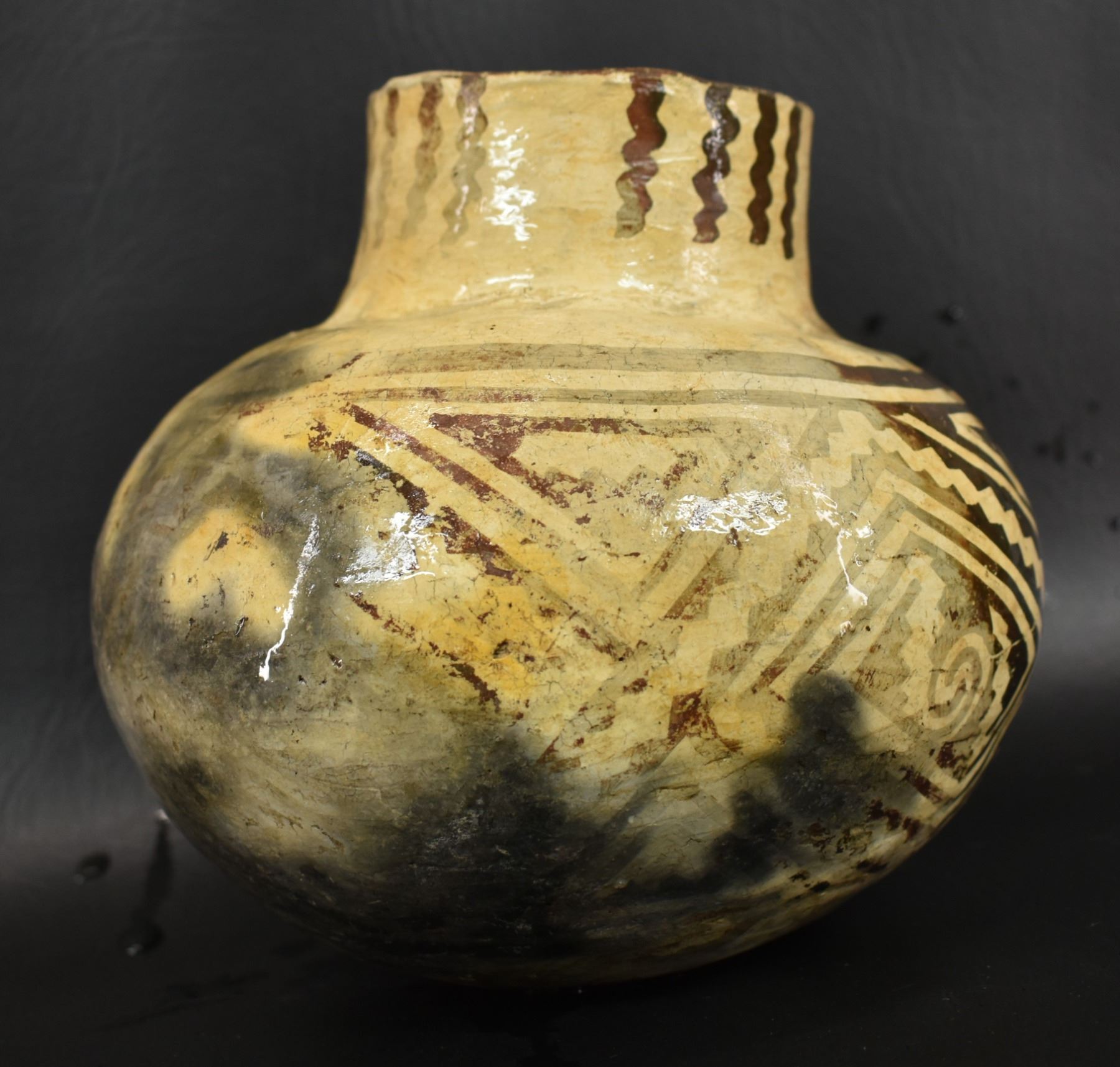 prehistoric Tularosa, hand coiled with black on white painted geometric design, 6.5" x 7" as found condition