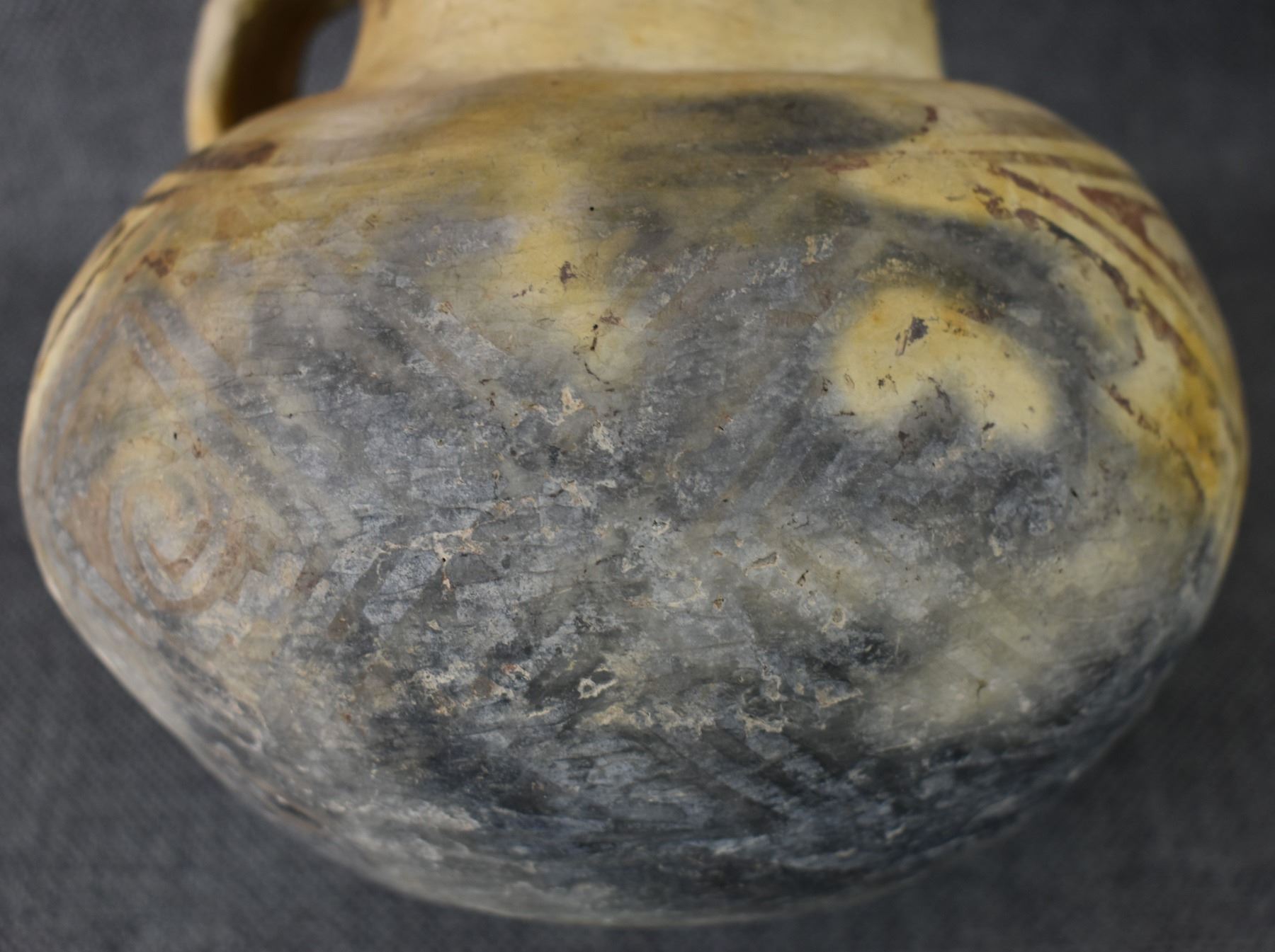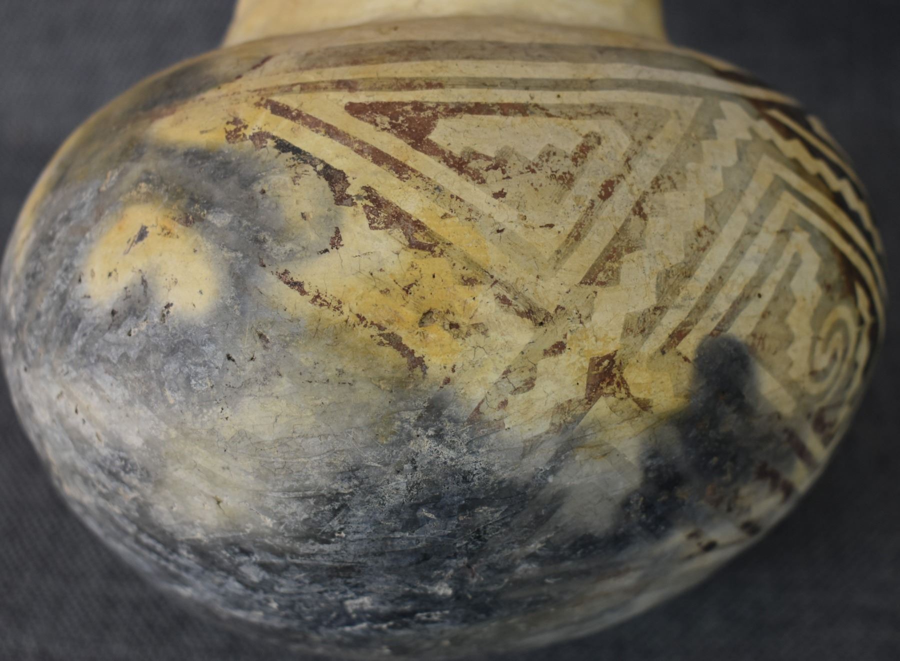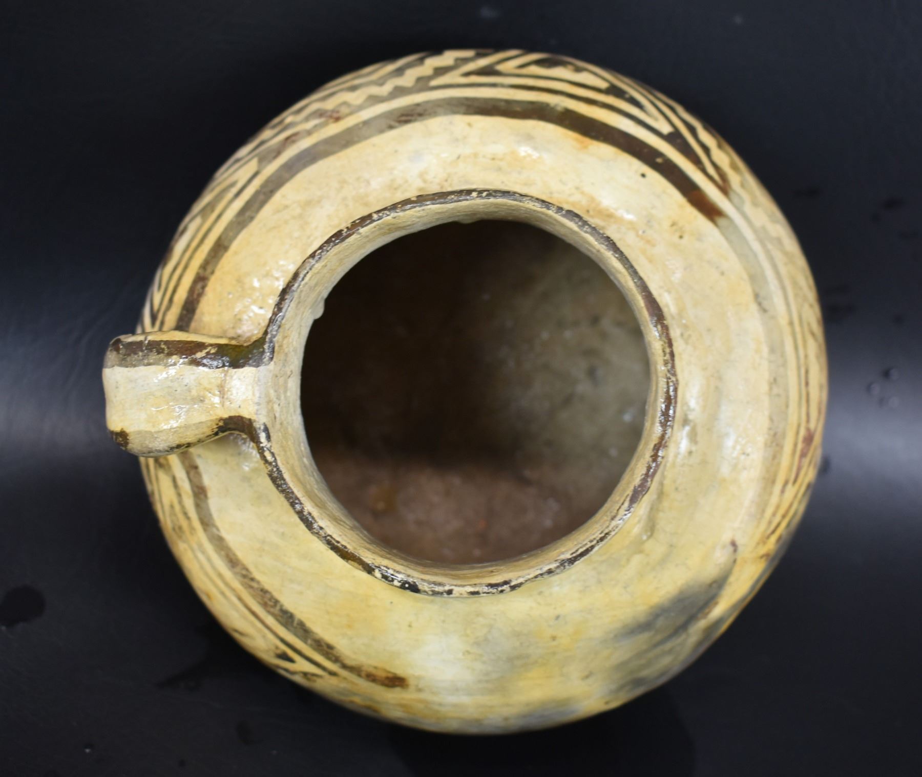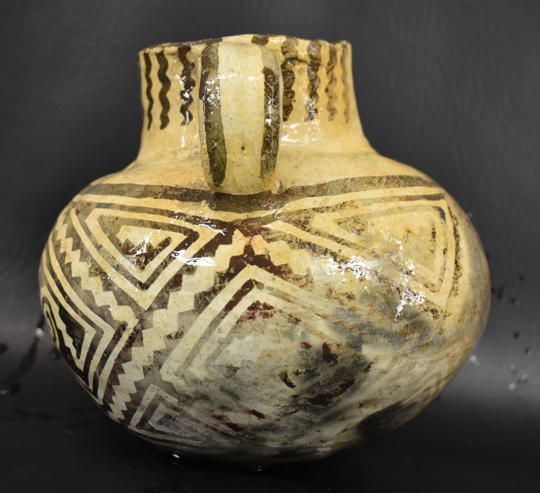 prehistoric Tularosa, hand coiled with black on white painted geometric design, 6.5" x 7" as found condition