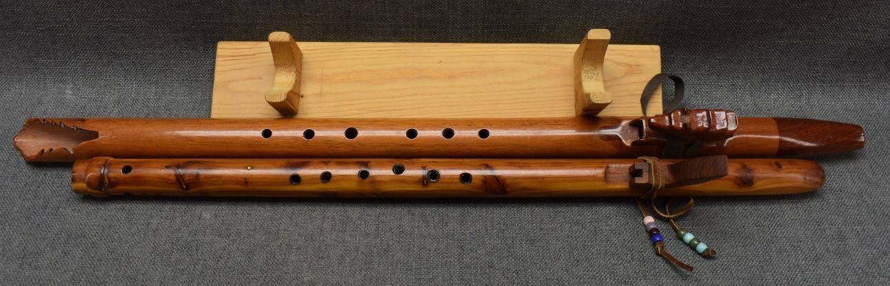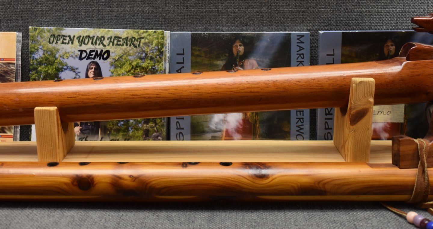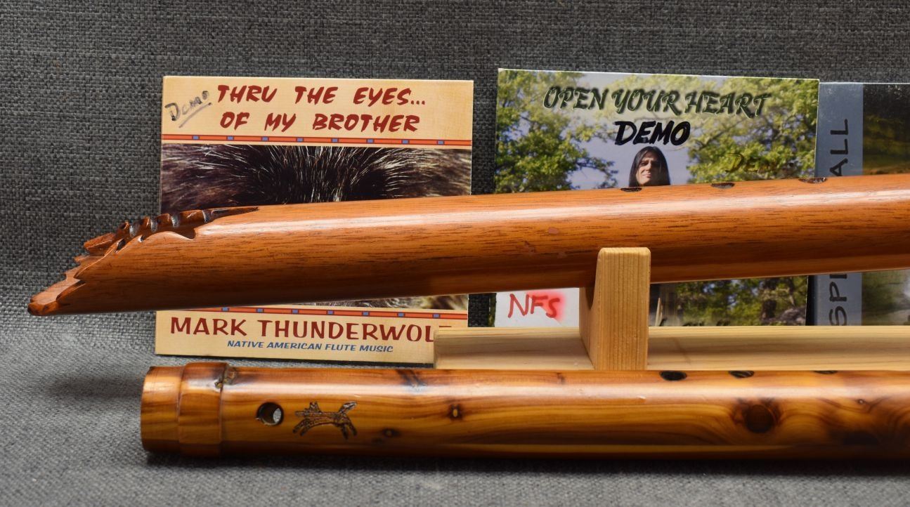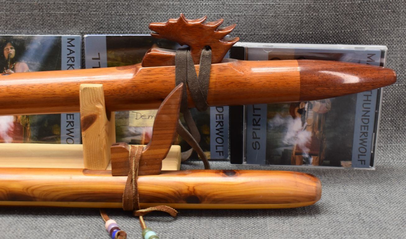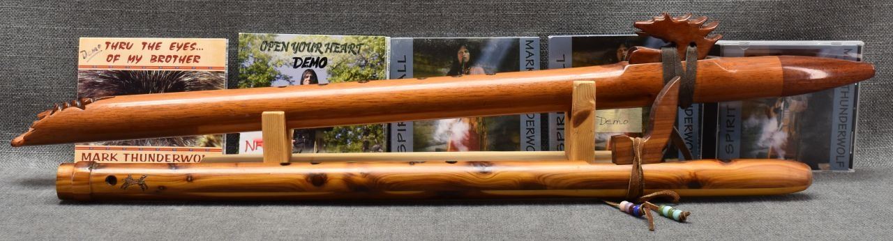 two decorative flutes with Mark Thunderwolf CDs, One flute signed MadMax D. longest 35"