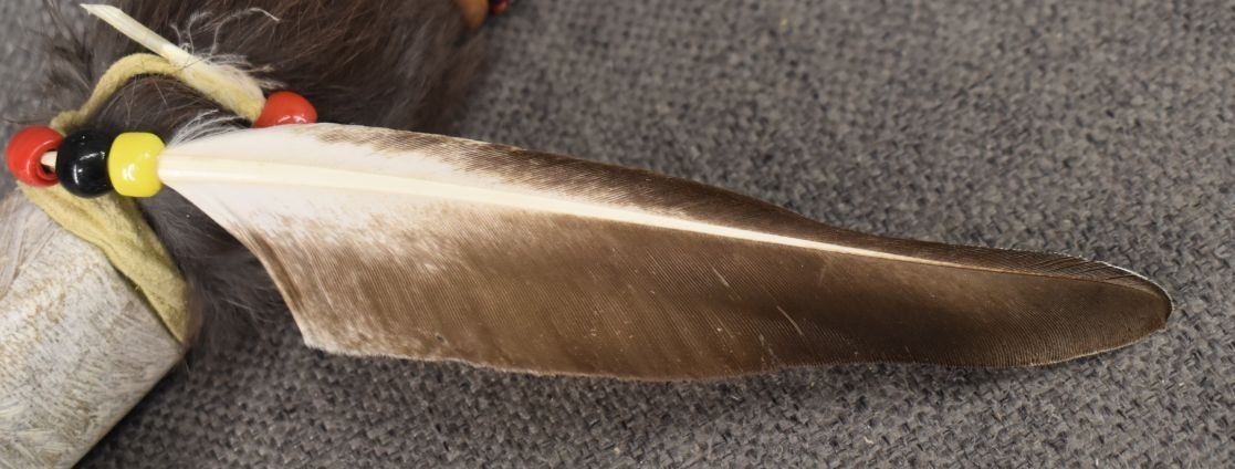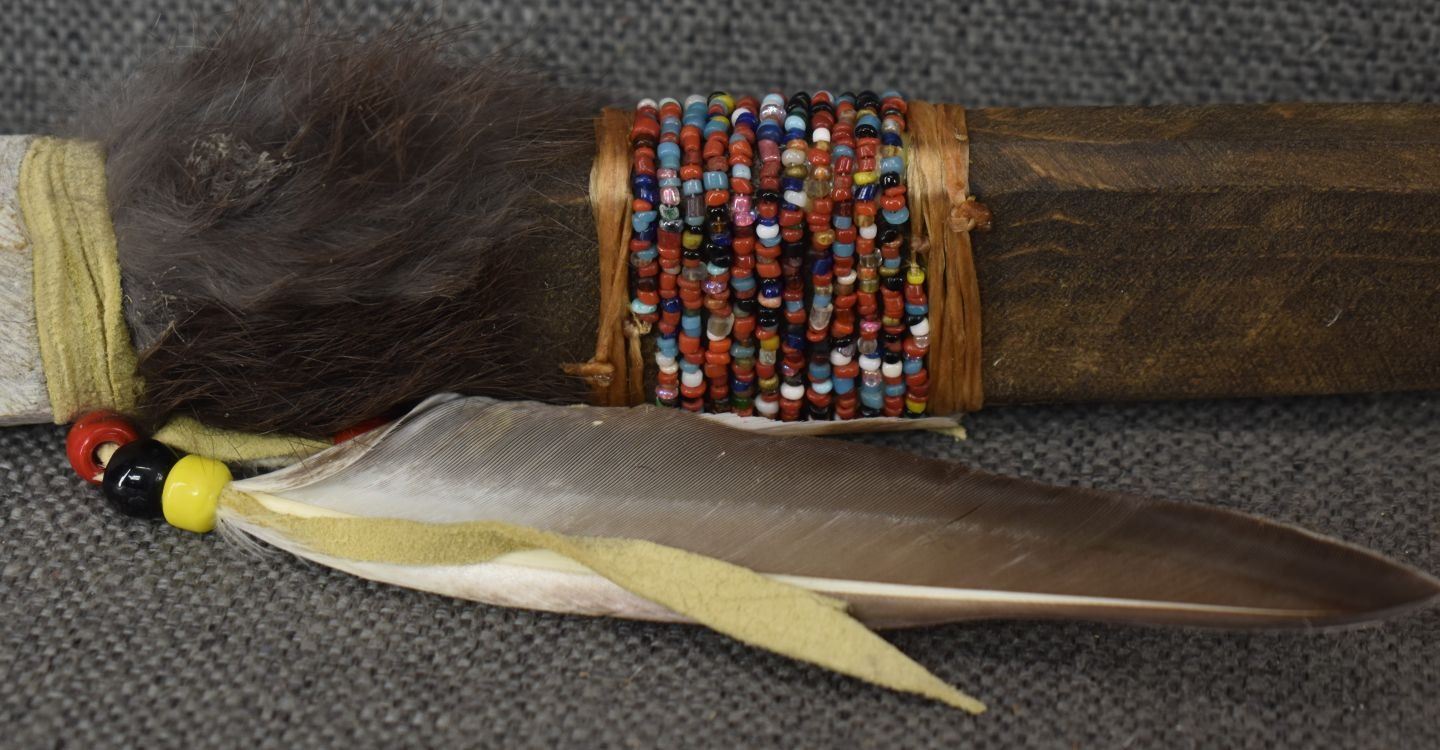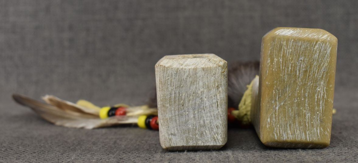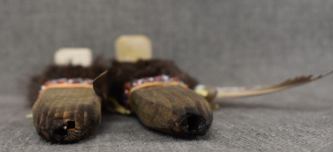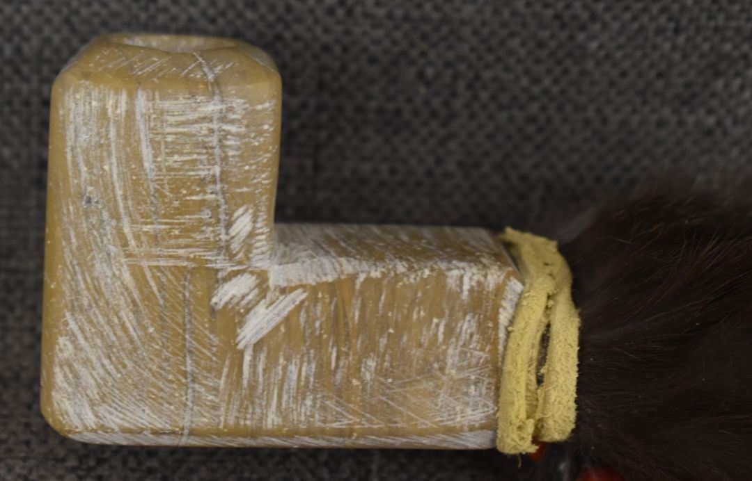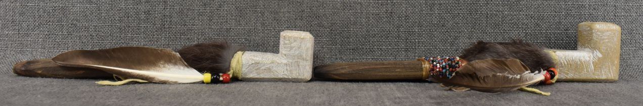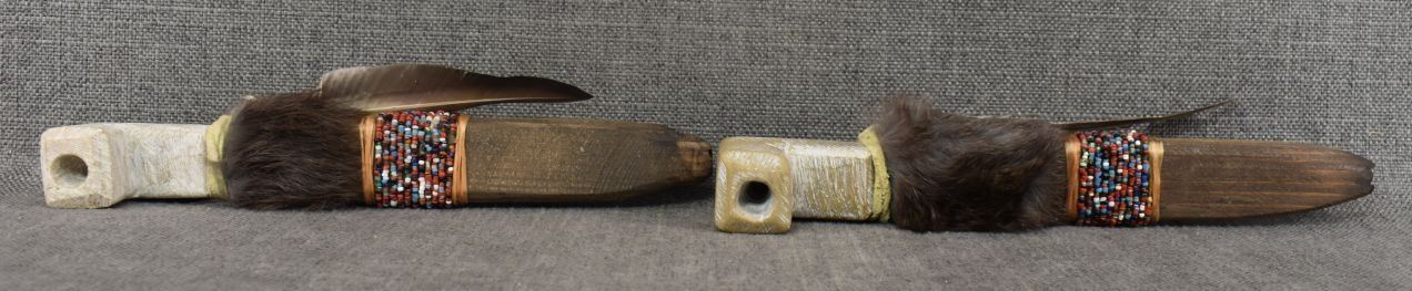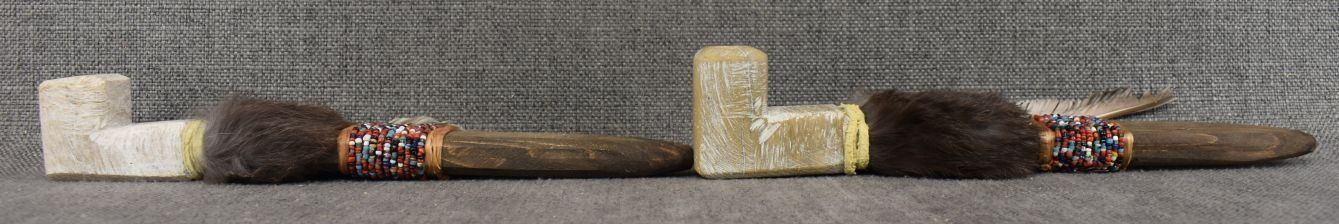 two decorative piece pipes Stone bowl wood stem with hide and beads. 2" x 11.5"