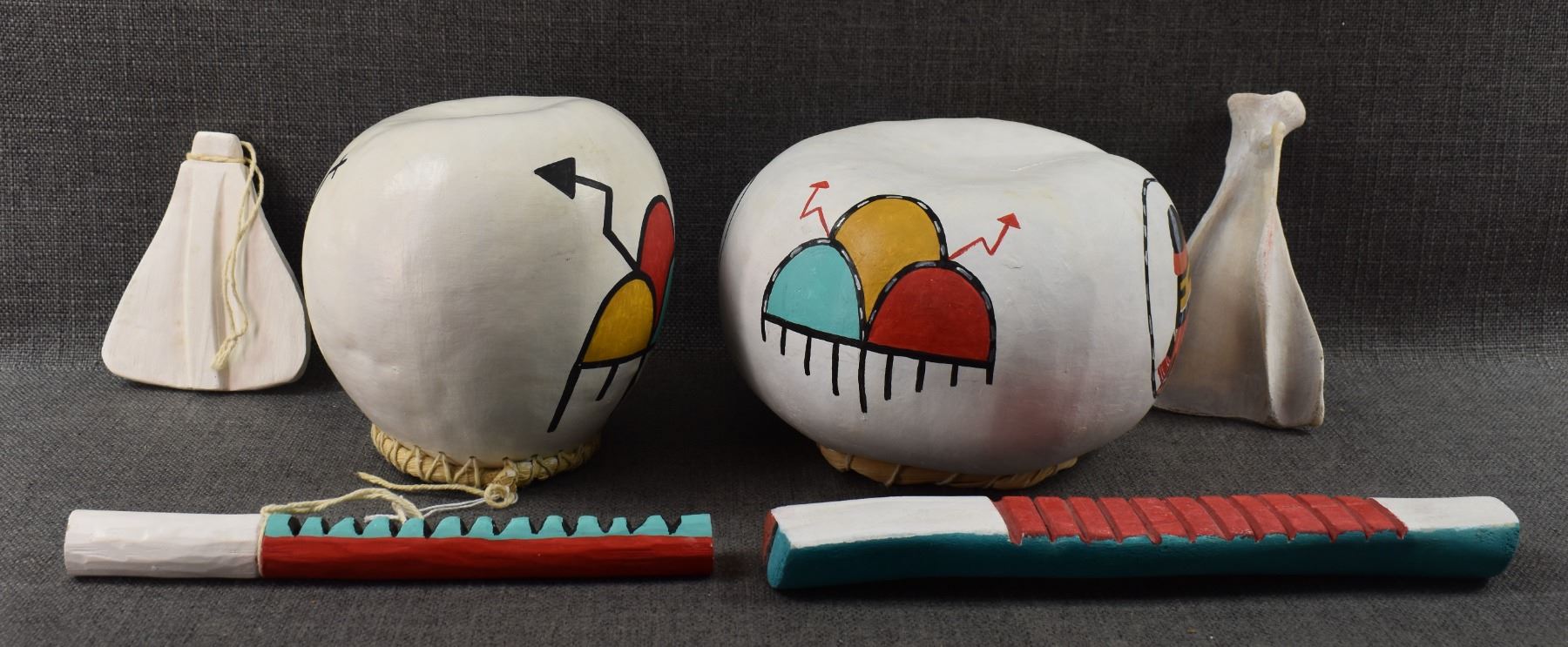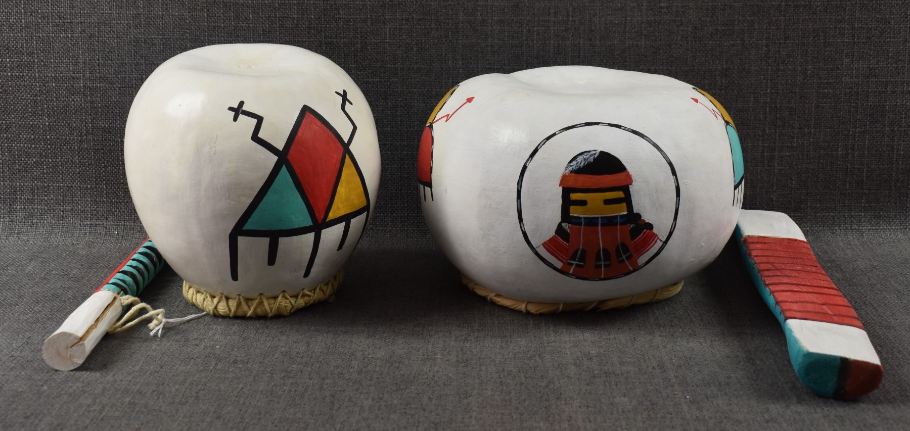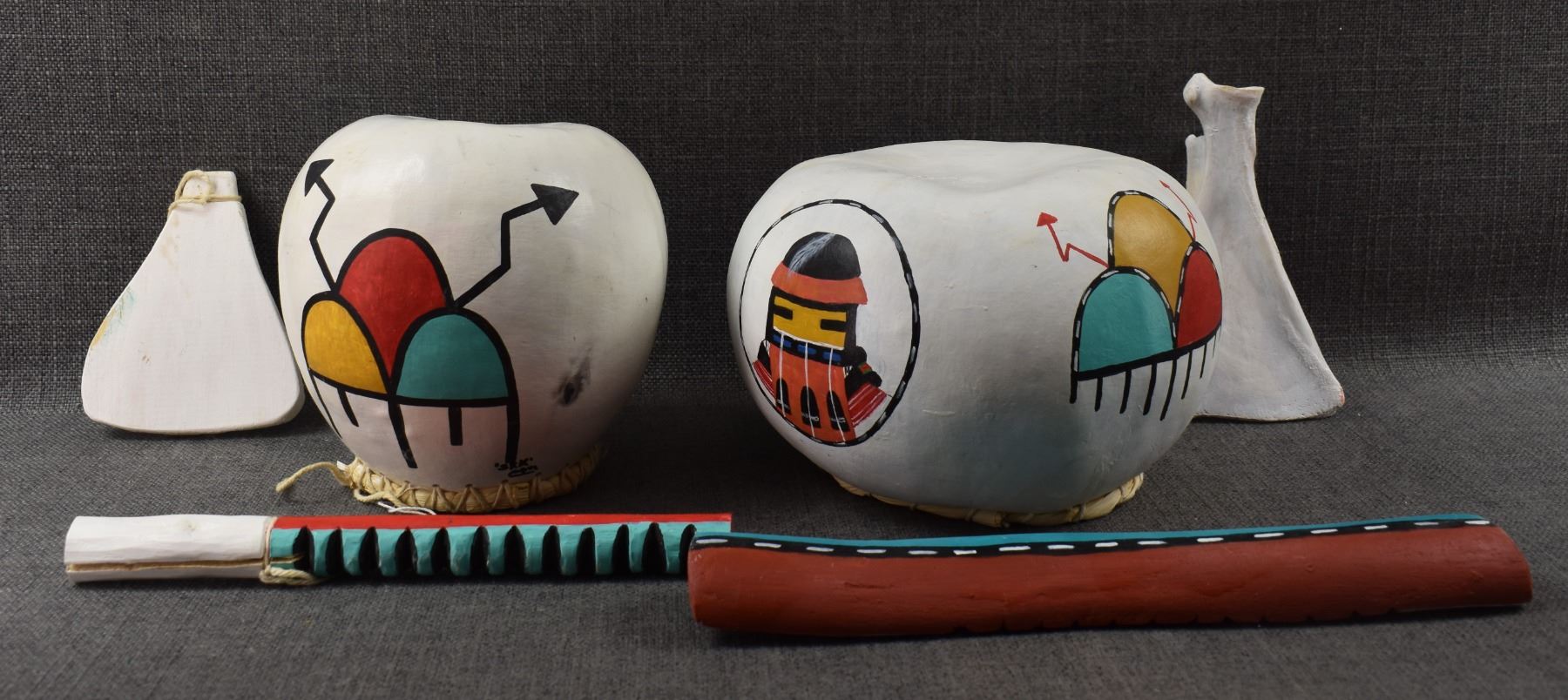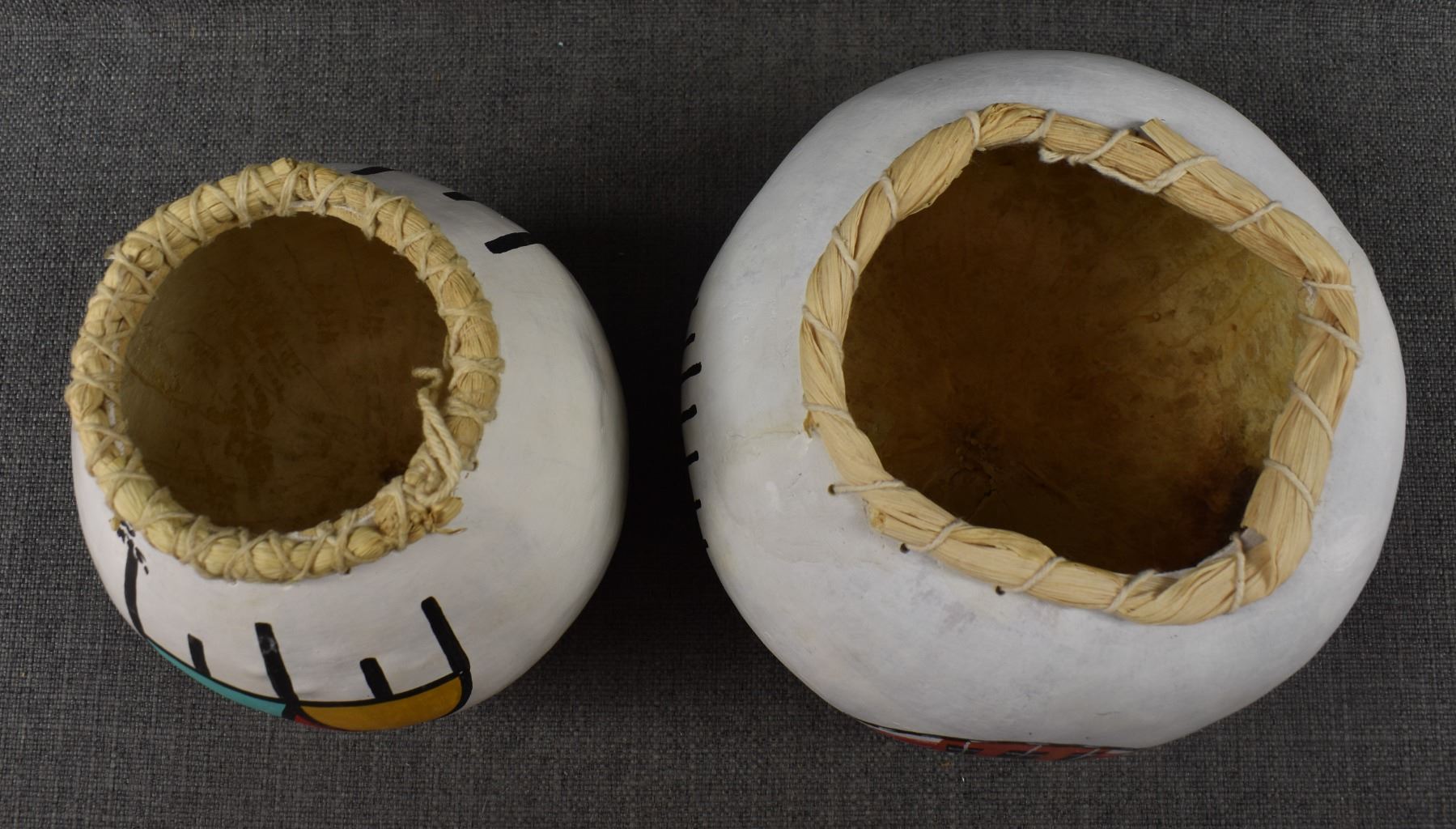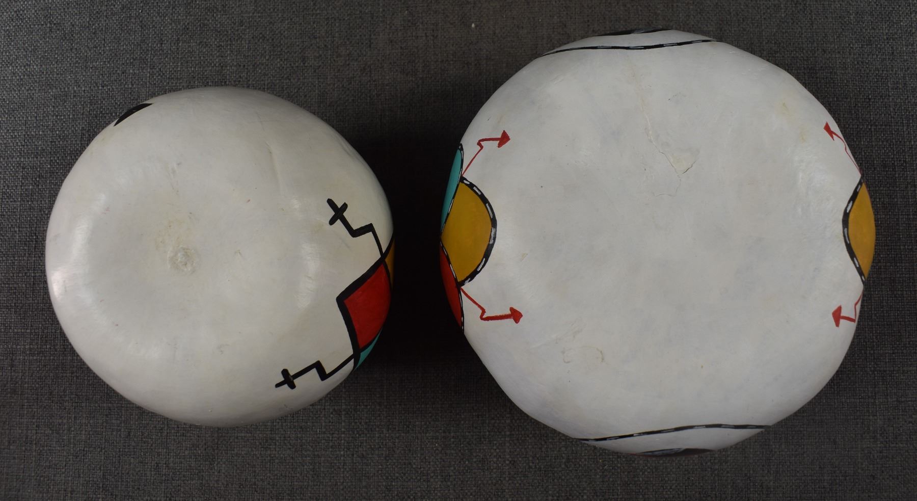 1980's Hopi polychrome resonator sets. One signed SRK. Largest gourd 5.5" x 8 "