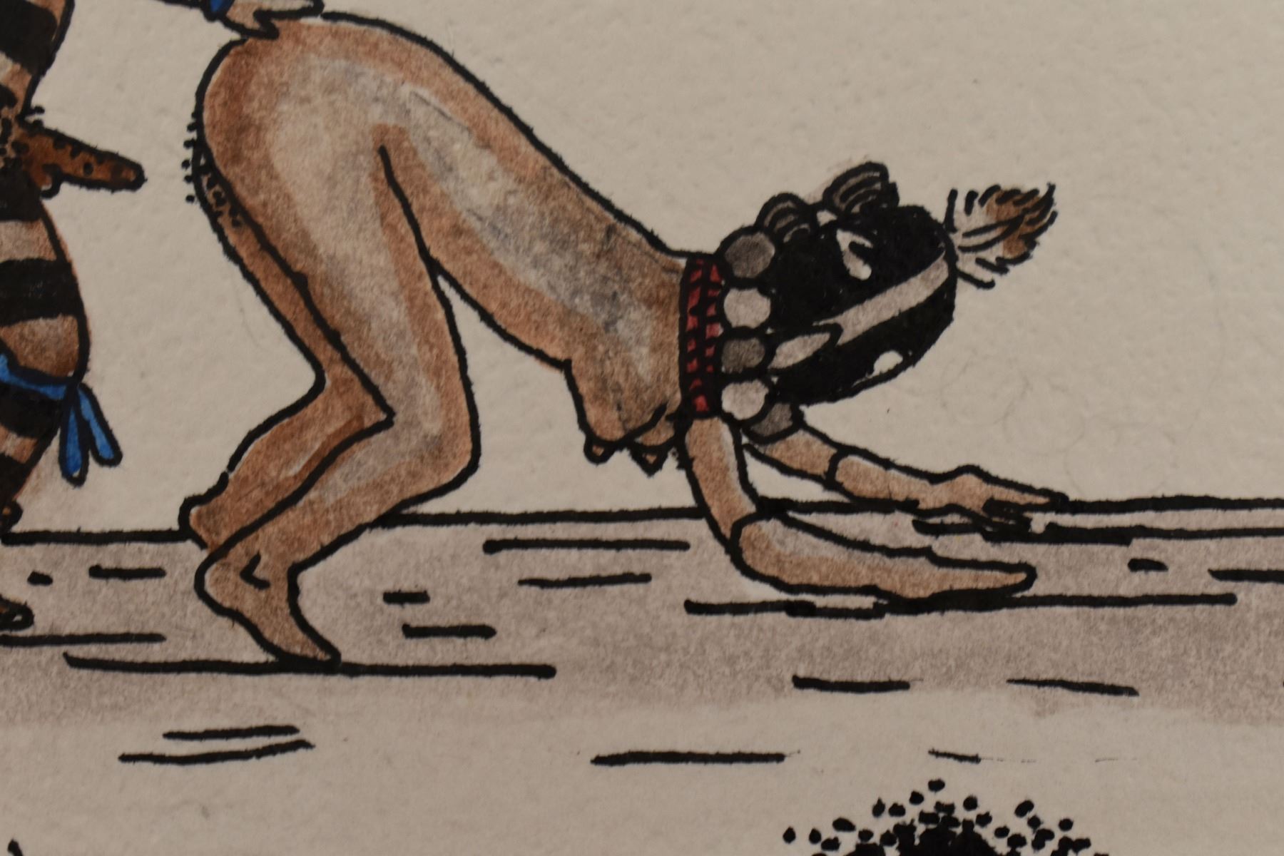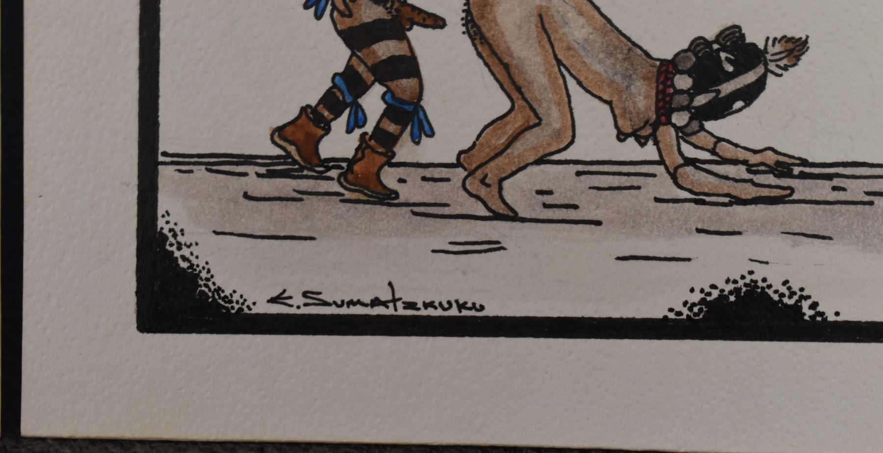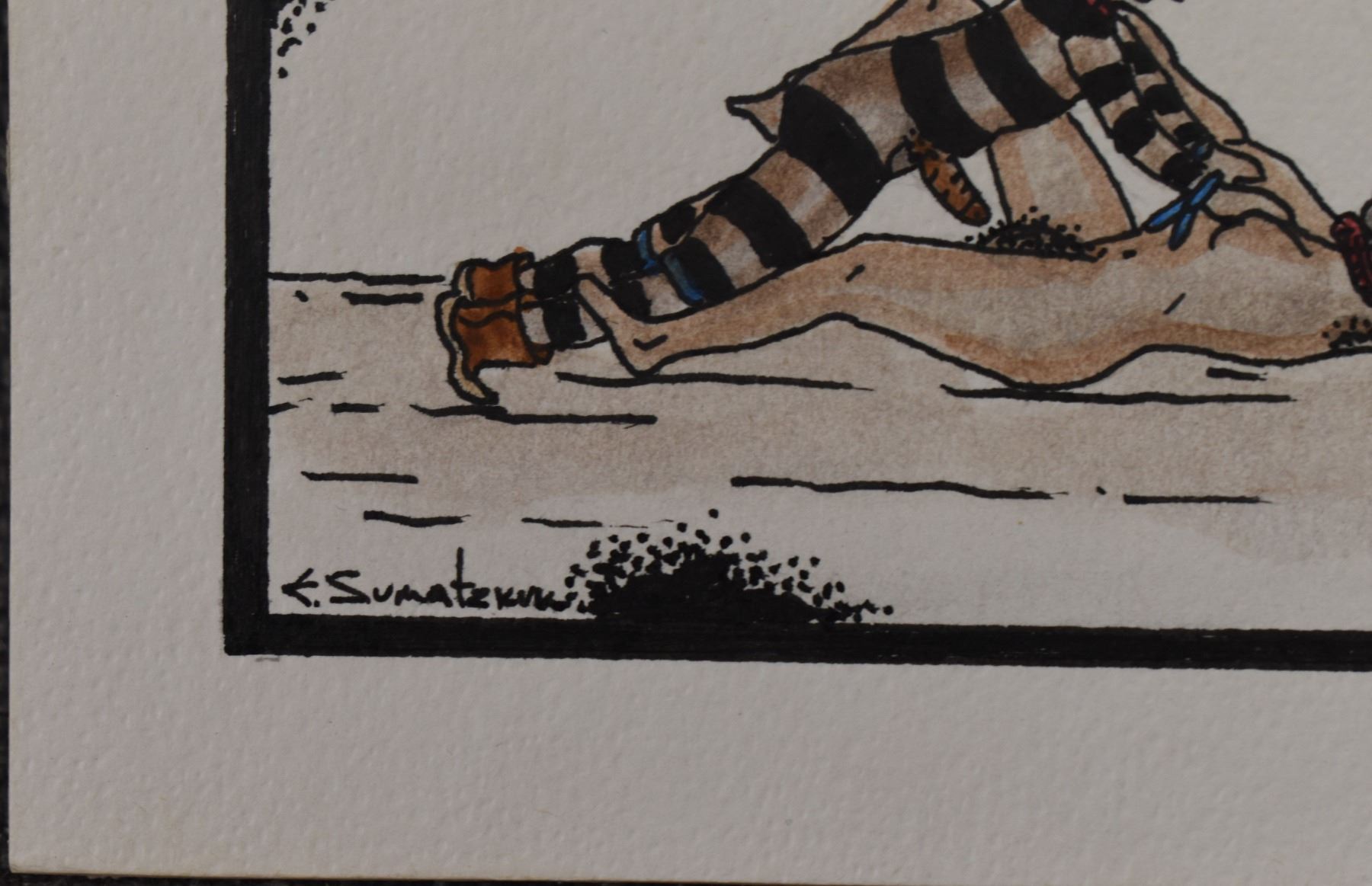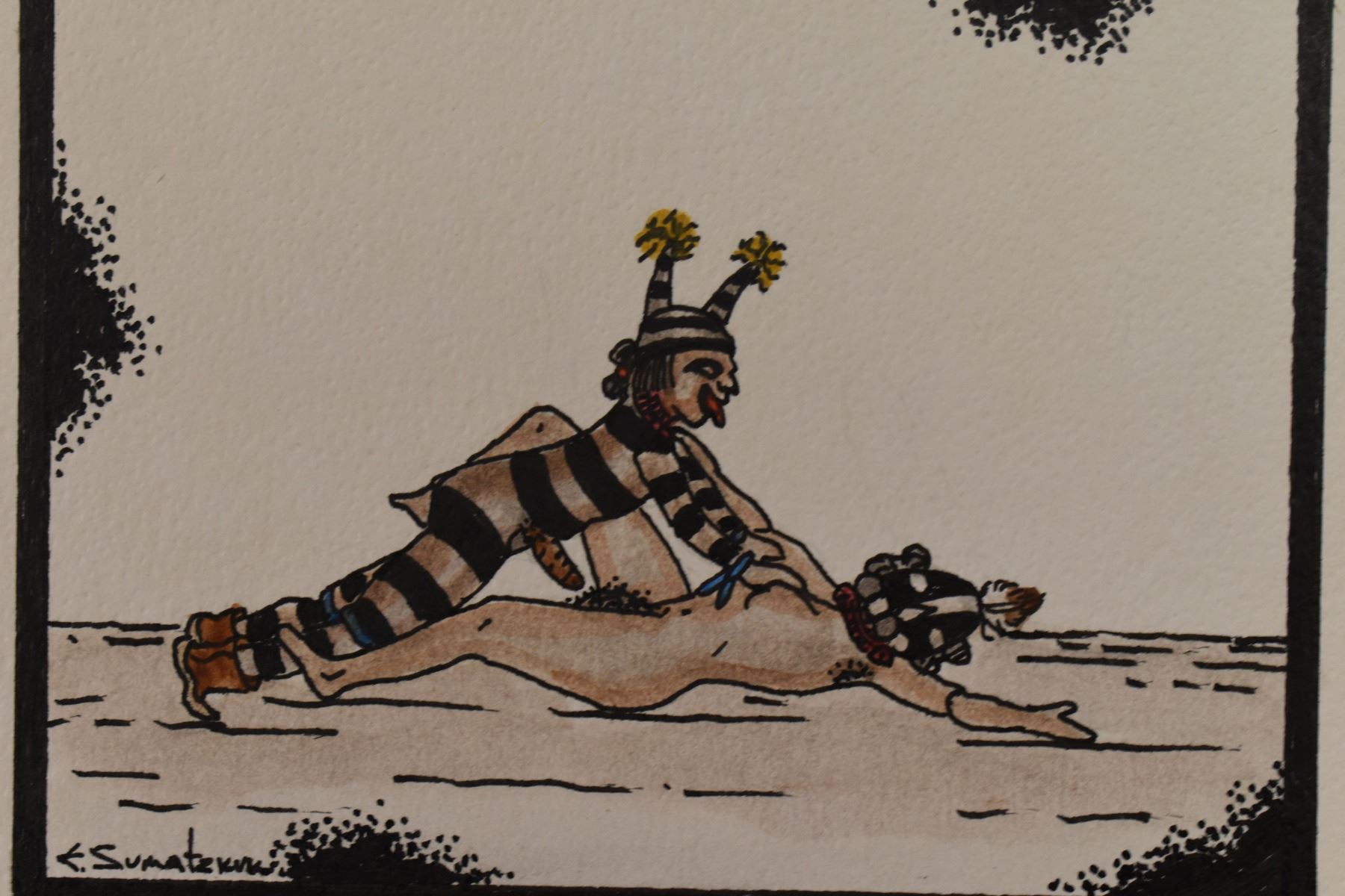 1980's Hopi. Original painting depicting kosharis . Signed E. sumatzkuku. 4'' x 5''