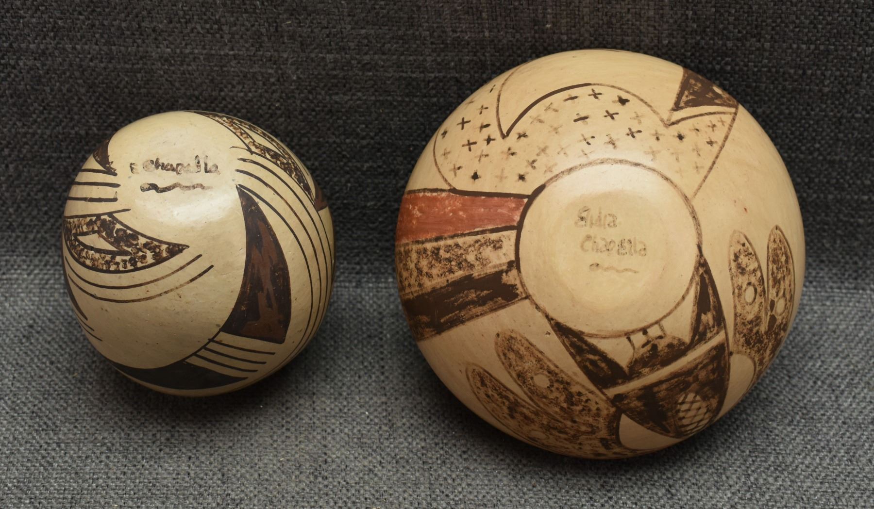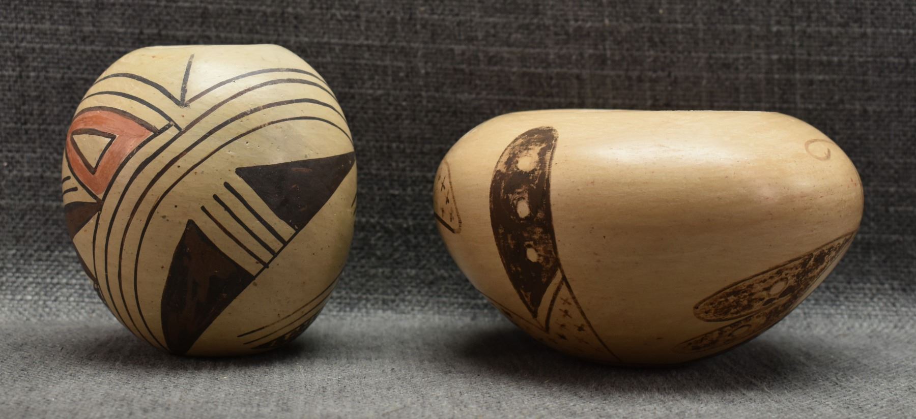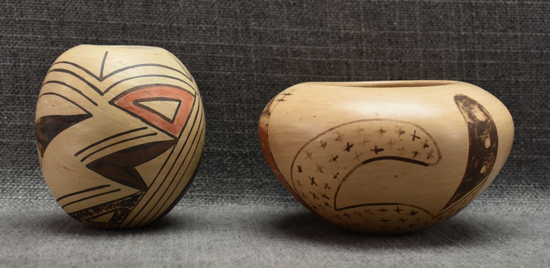 1970's Hopi. Hand coiled and painted design pottery bowls 3'' x 5.5'' and 4'' x 3.5'' both signed Elida Chapella
