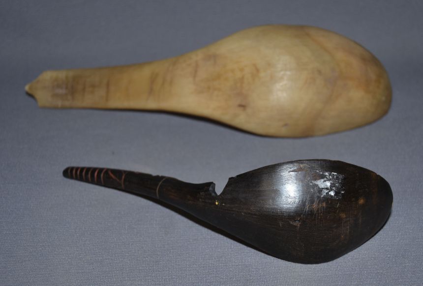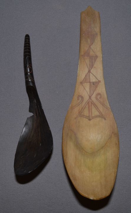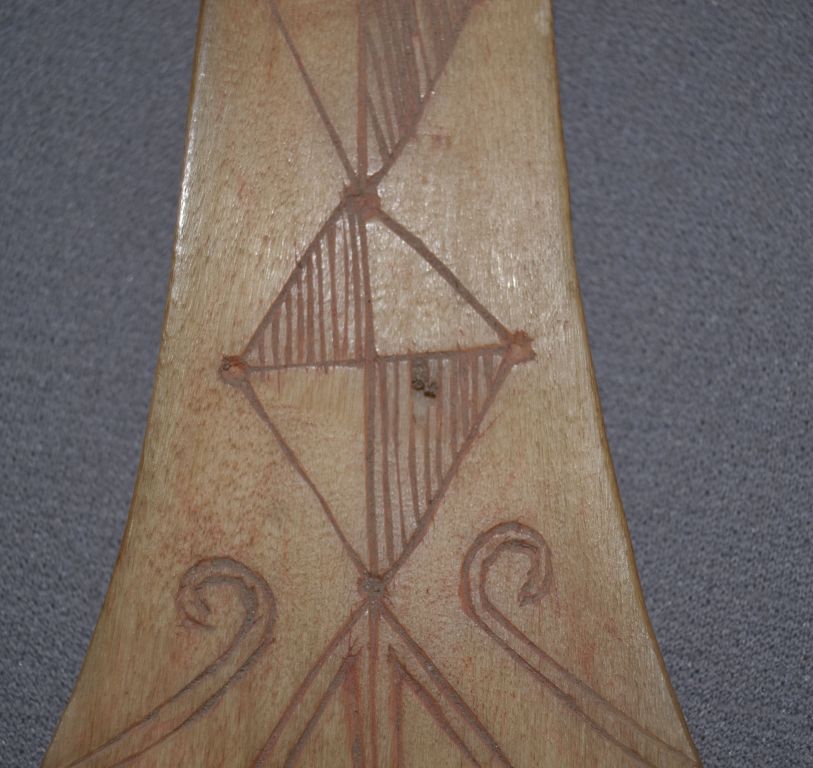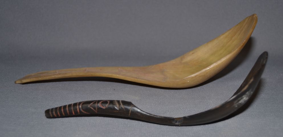 1960's hand carved NWC style with chip 7" x 2" Mexican horn spoon with geometric design 10" x 3"