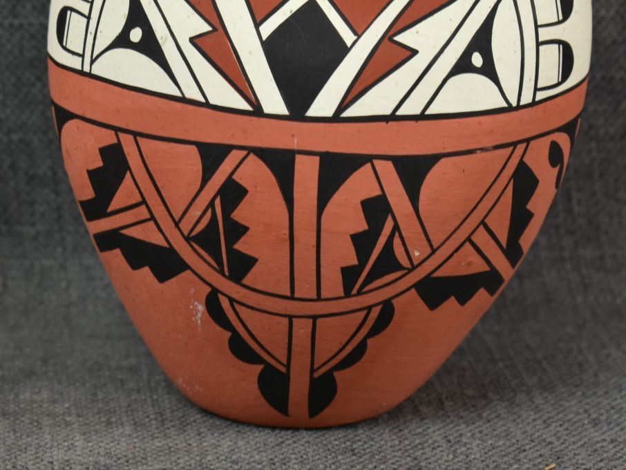 1970-80's Jemez, hand coiled with polychrome painted design 4.25" x 7.5" 1980's wedding vase signed 9" x 6"