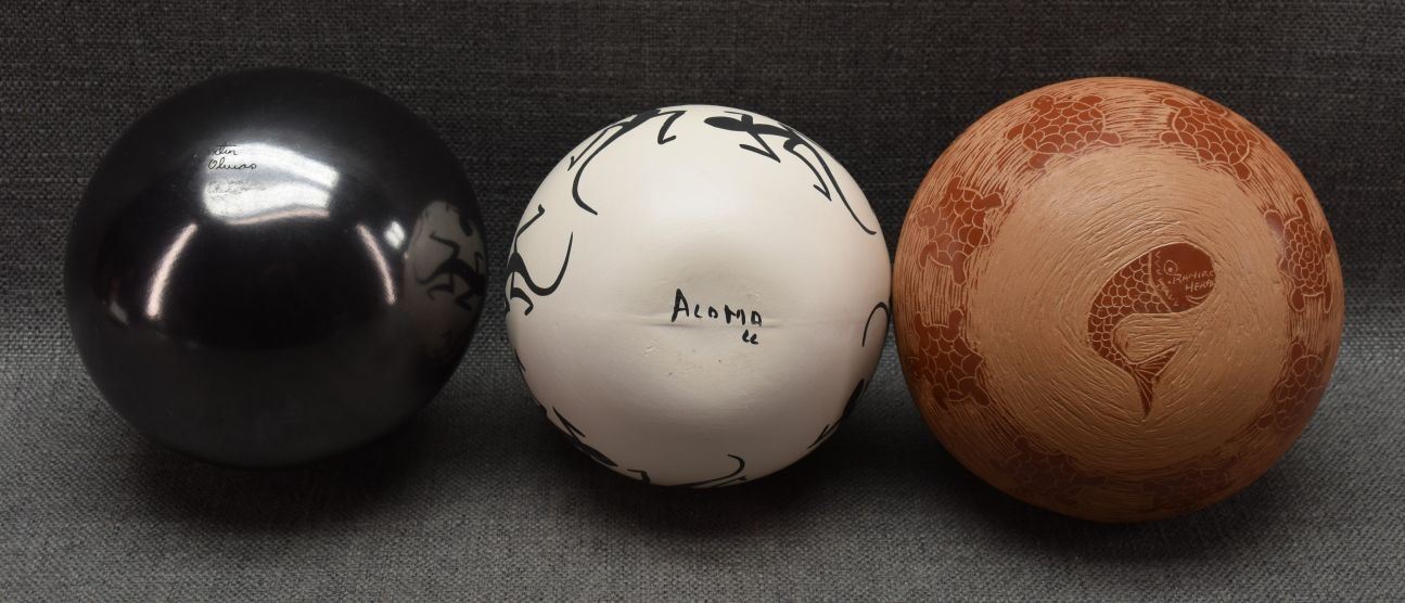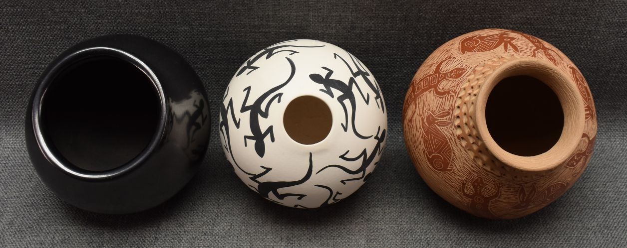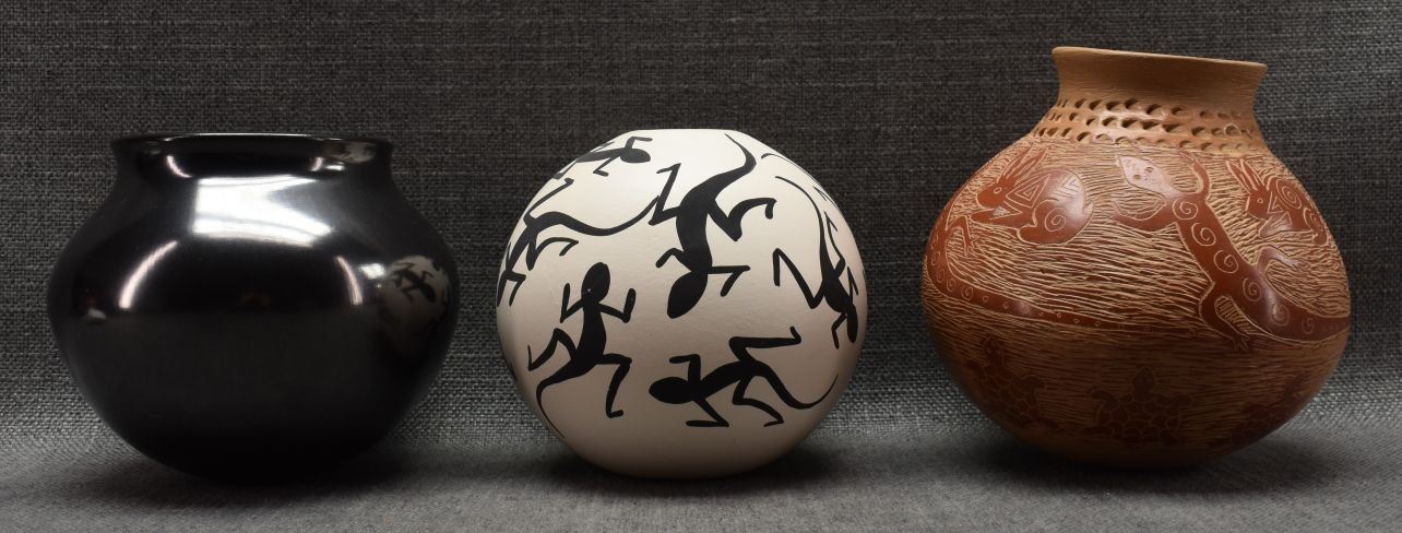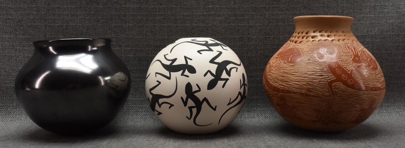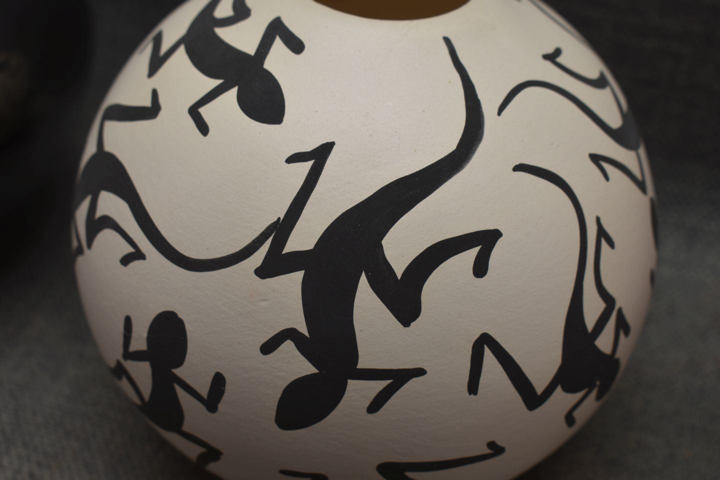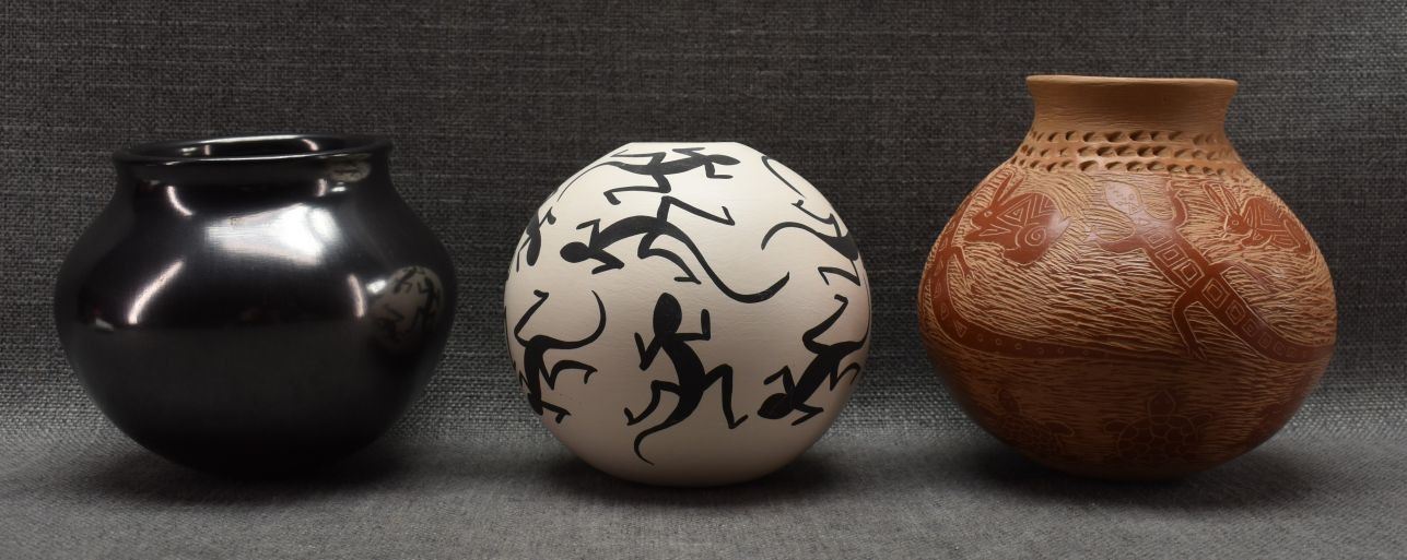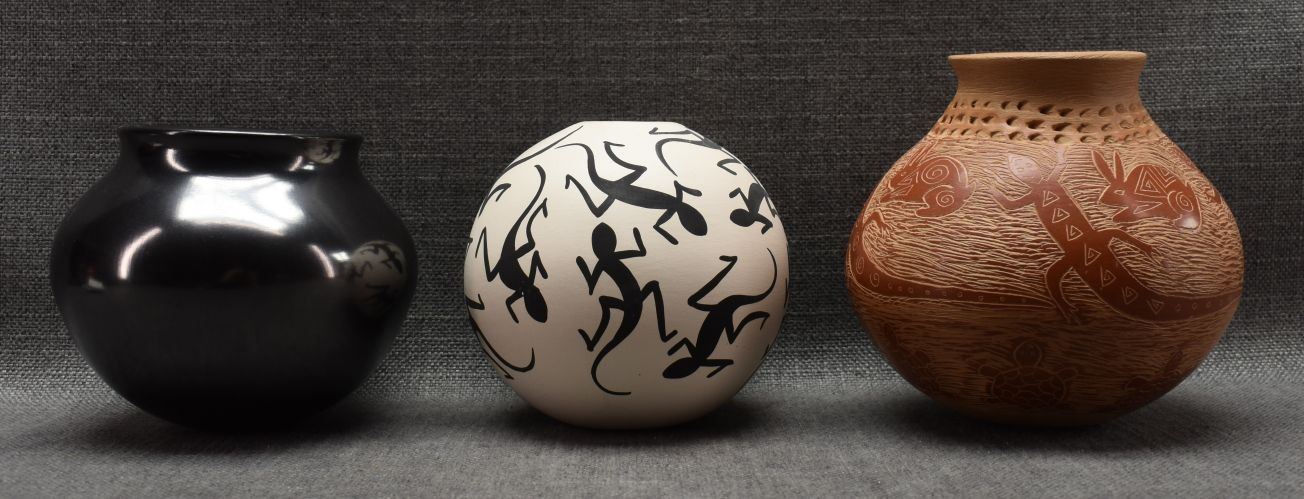 two Mata Ortiz pottery jars/one Acoma pottery jar, Mata Ortiz polished black Mantin Oluais, carved with animal design Signed Ramiro Heras, Acoma black on white depicting lizards signed, Largest 6.5"x5.5"