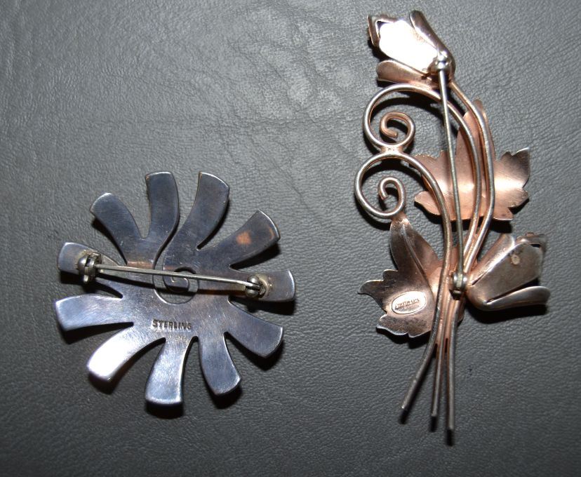 1950's sterling silver one floral with glass settings 3" other tall cut out sun design with geometric symbol inside1.75" dia