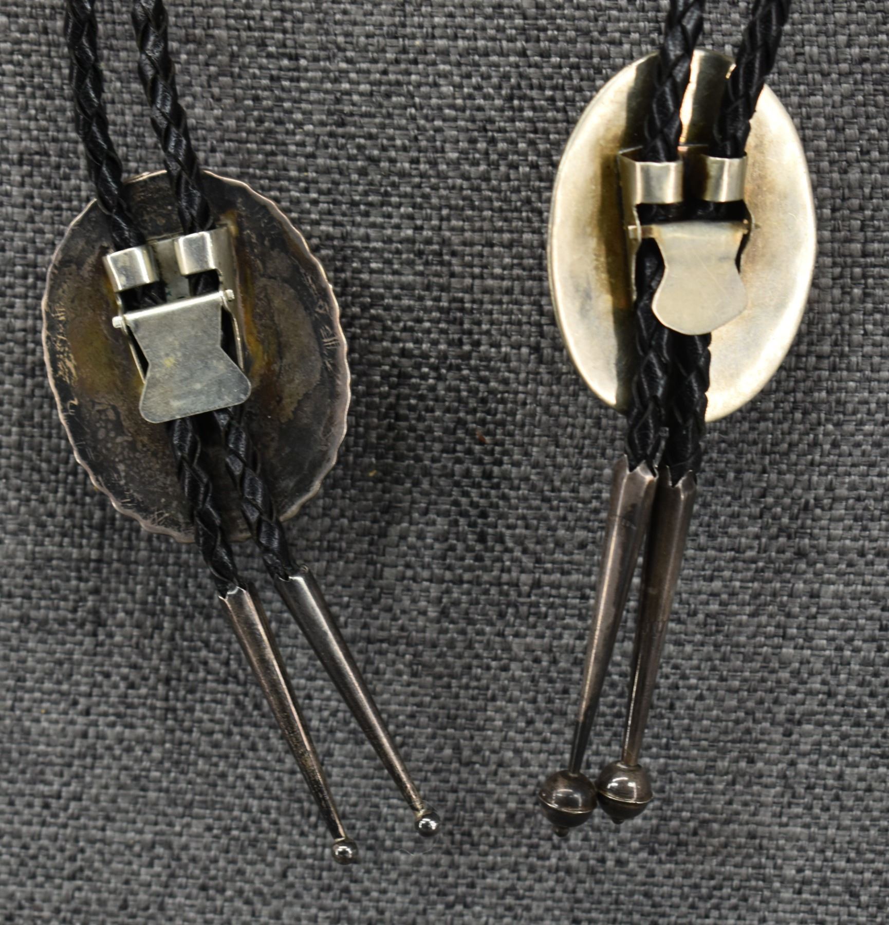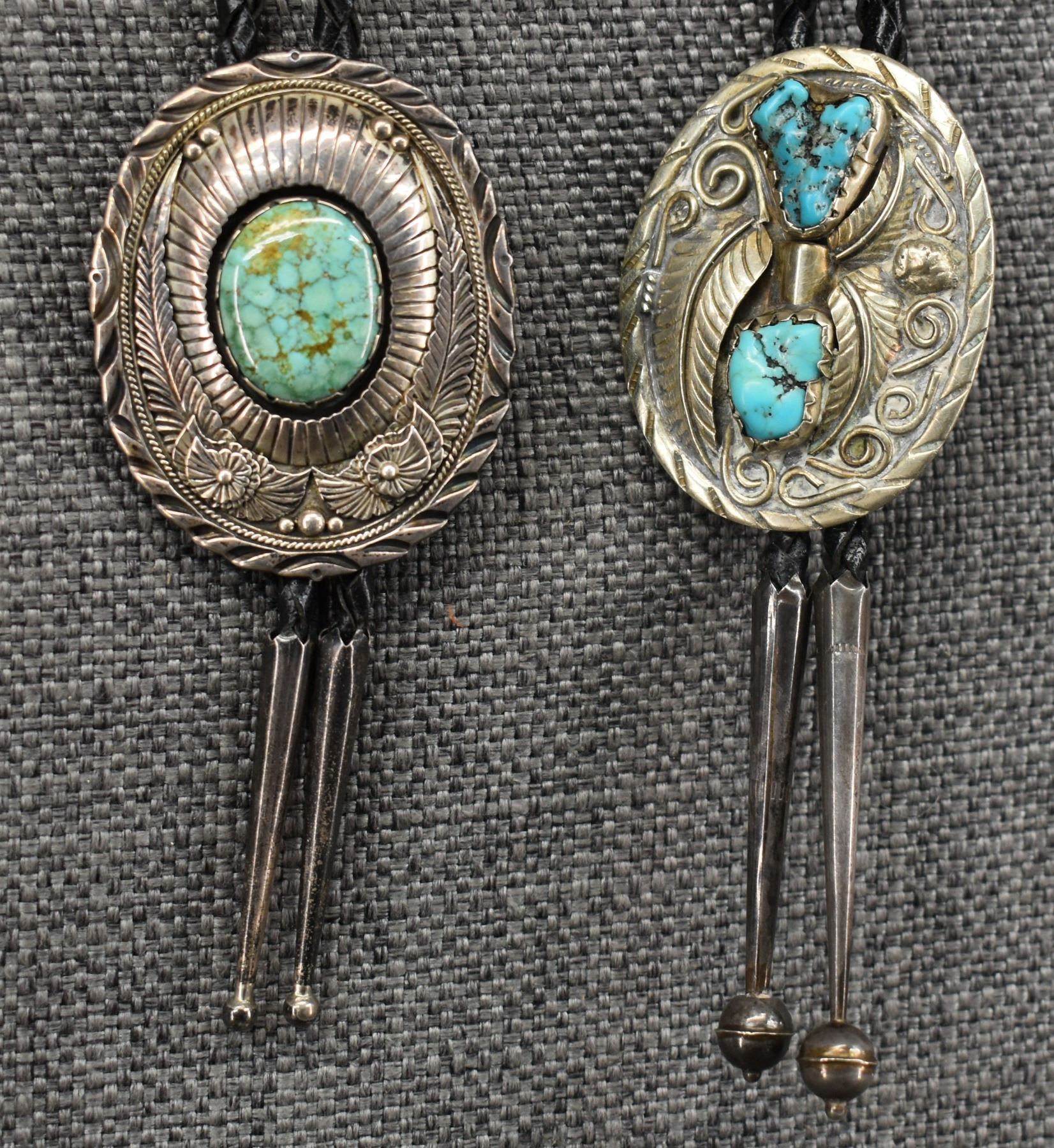 1970-80's Sterling silver stamped design with turquoise 2" x 1.75" total weight 39 grams. 1980's Navajo nickel silver and turquoise 2" x 1.5"