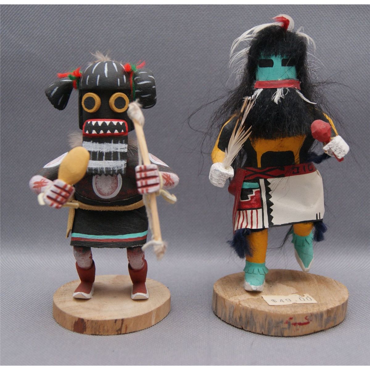 1980s-90s hand carved and painted, long hair signed R.W. 5" tall, warrior maiden signed but unreadable 4.25" tall
