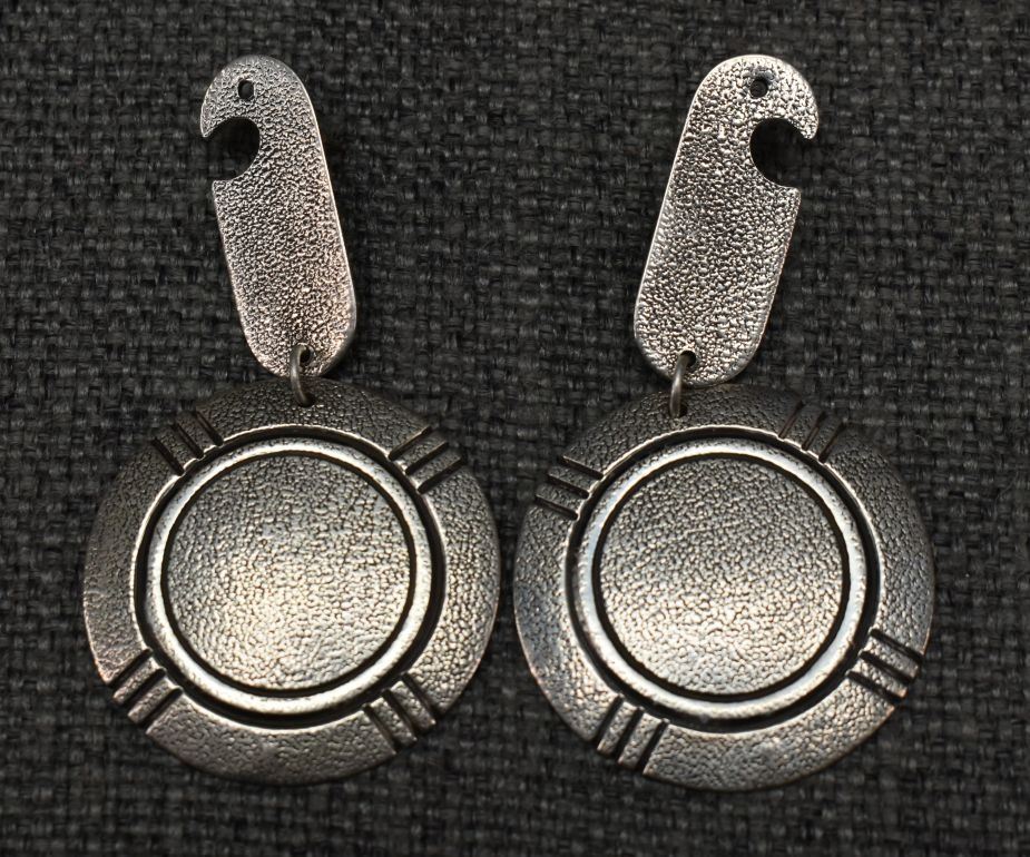 1990's Navajo, sterling silver signed P, 2.75" x 1.5". Sterling silver sand cast cutout design signed TJF 3" long