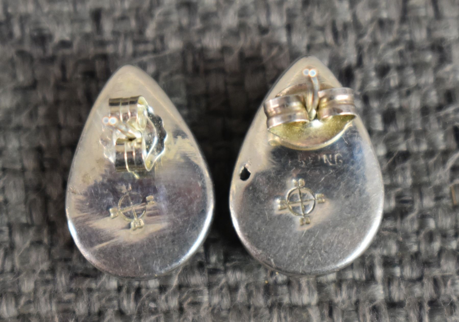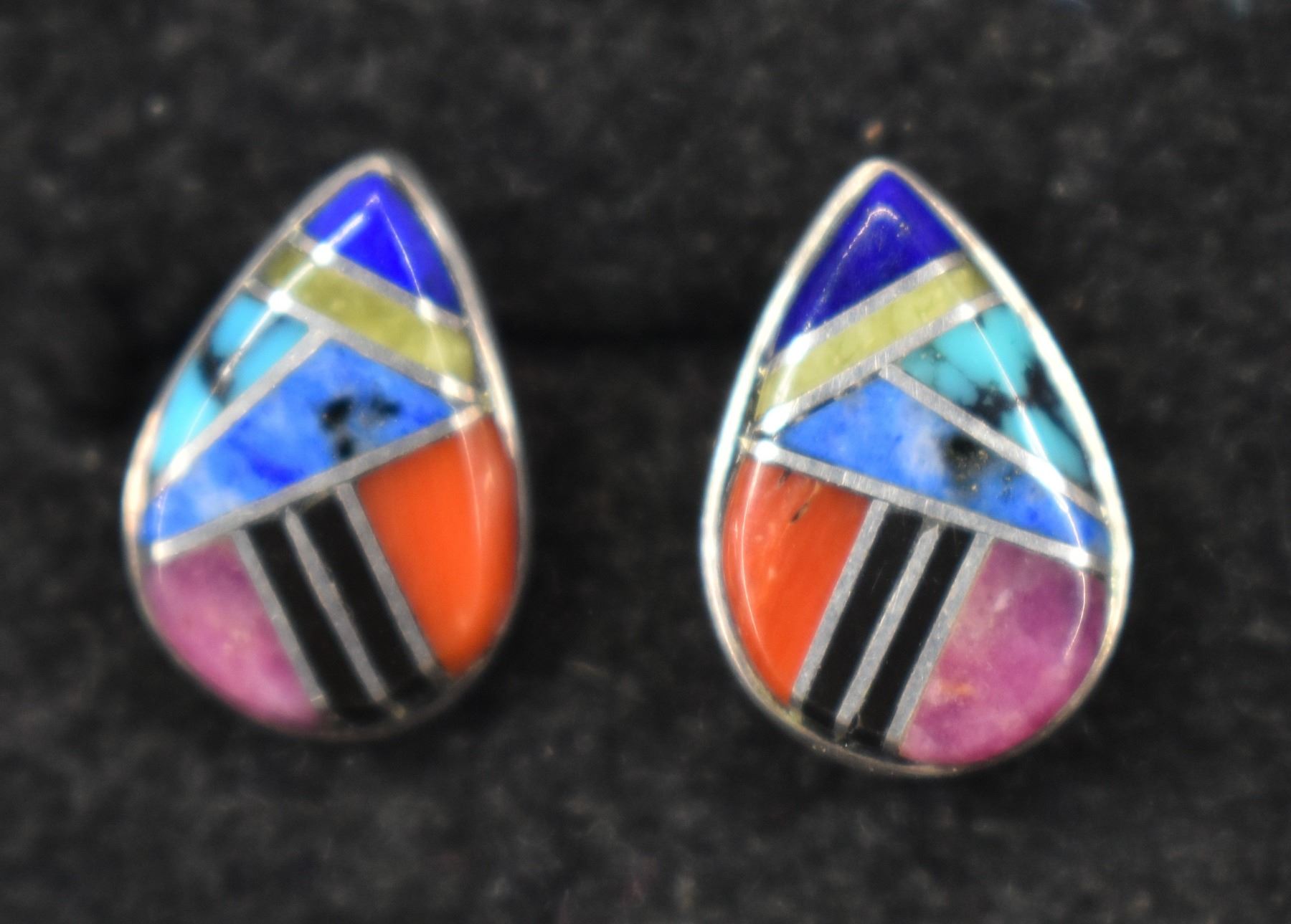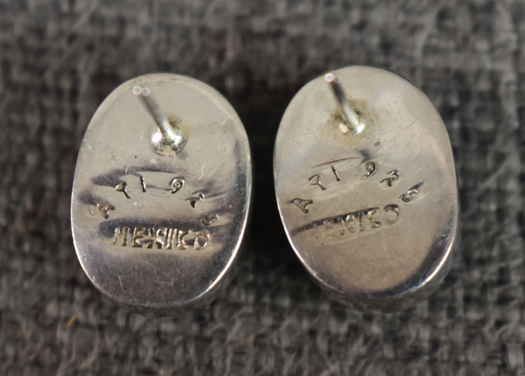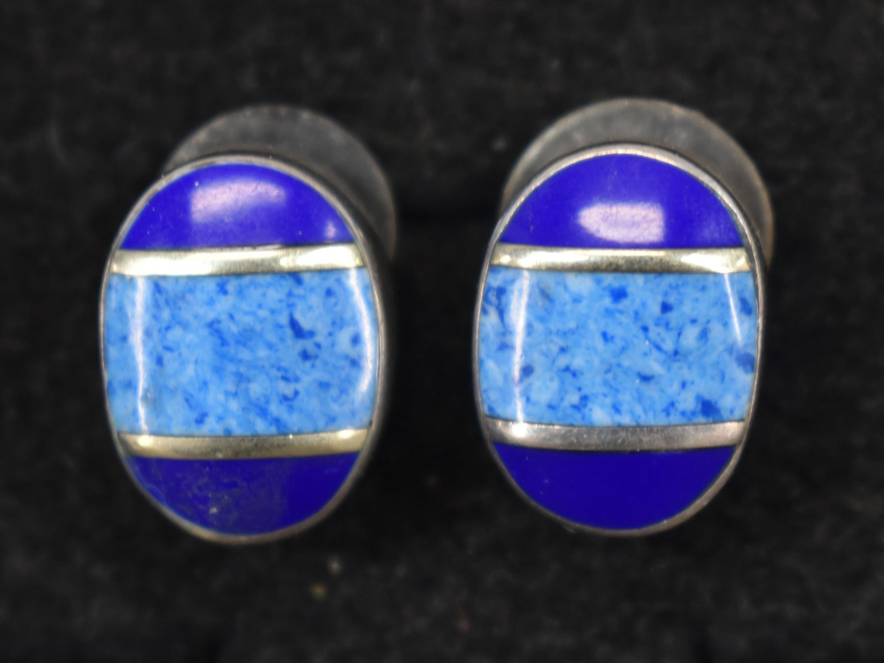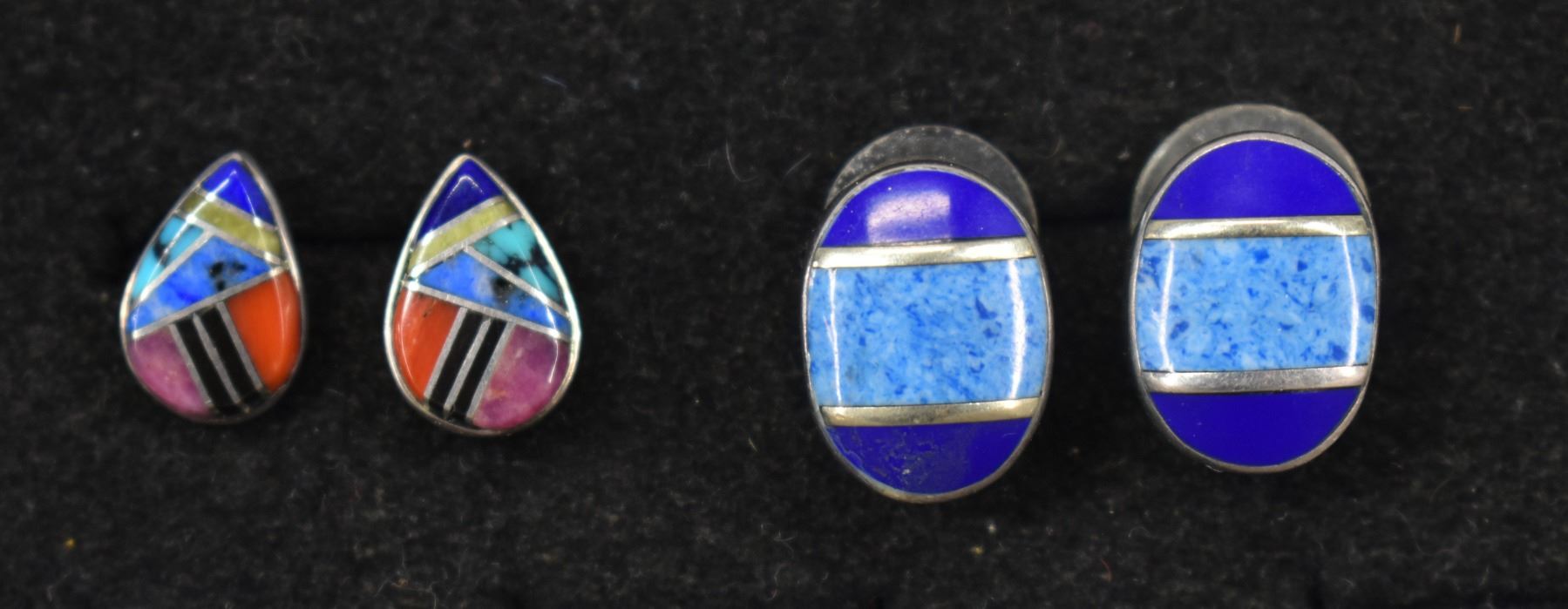 sterling silver with channel inlaid stones one marked Mexico .75" x .5" other signed with hallmark .5" x .25" total weight 15 grams