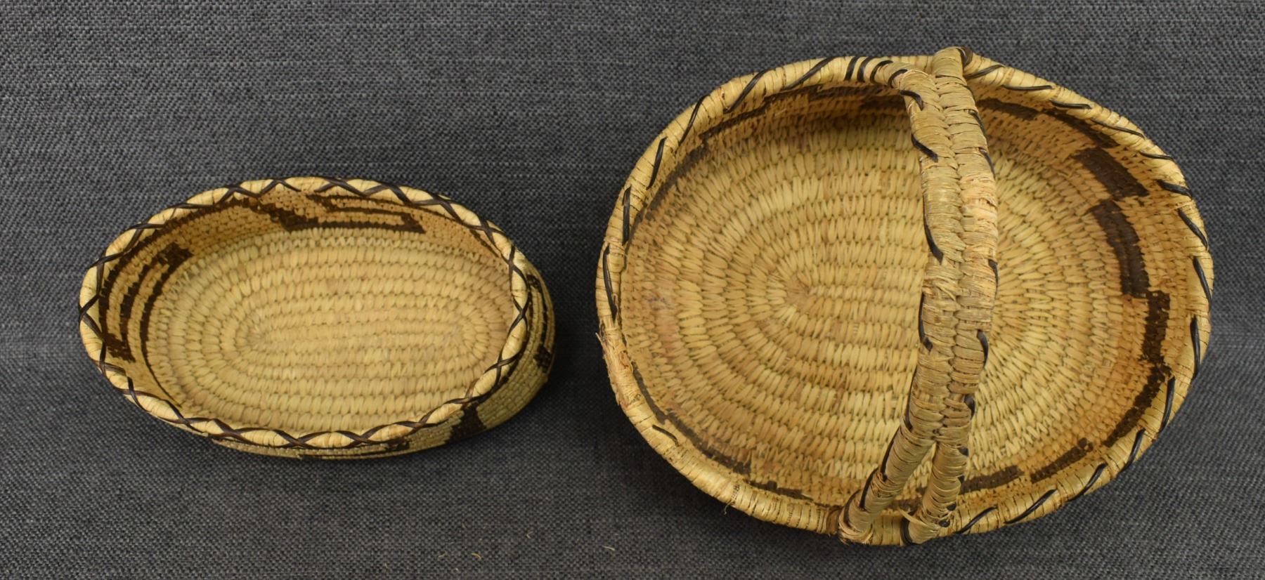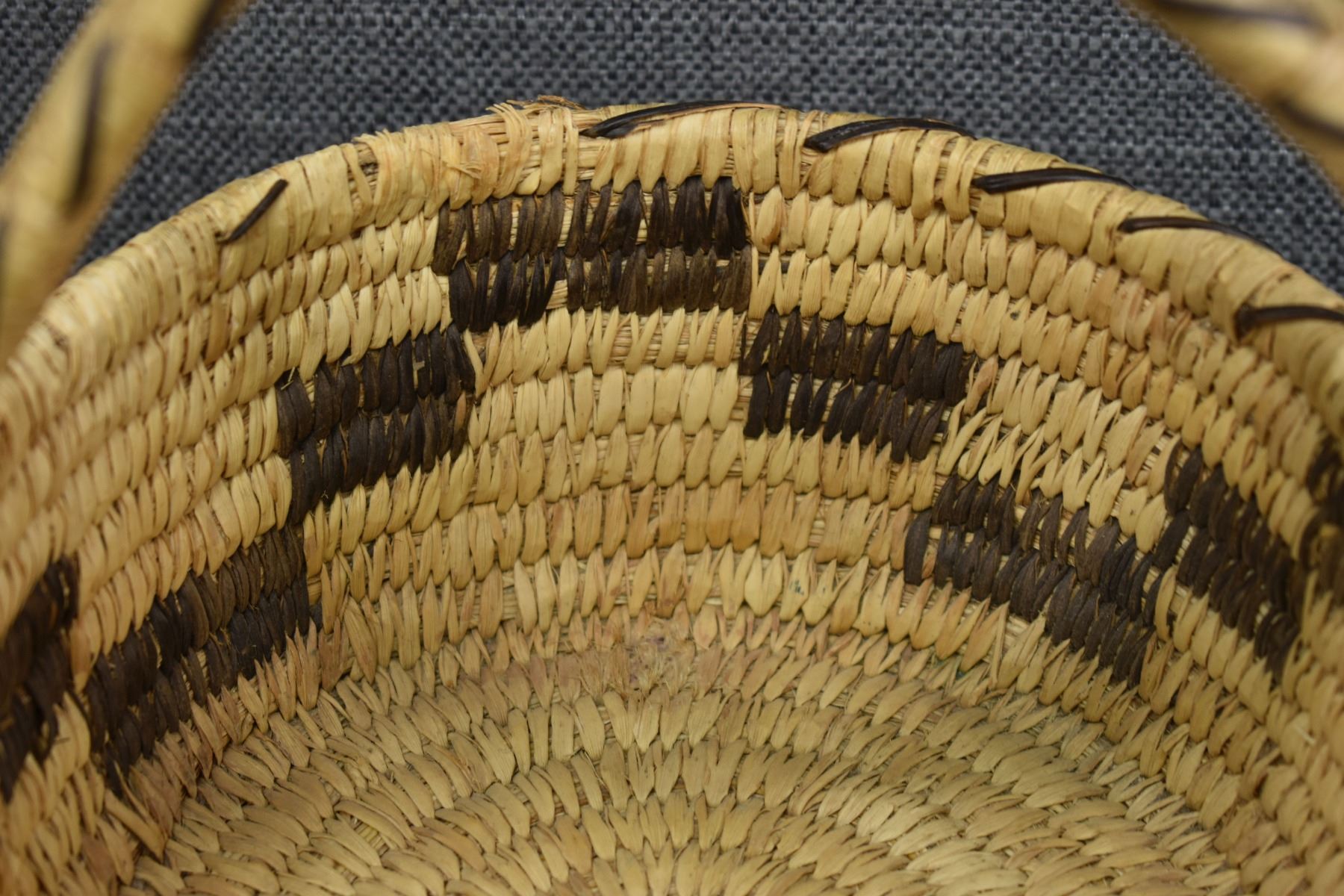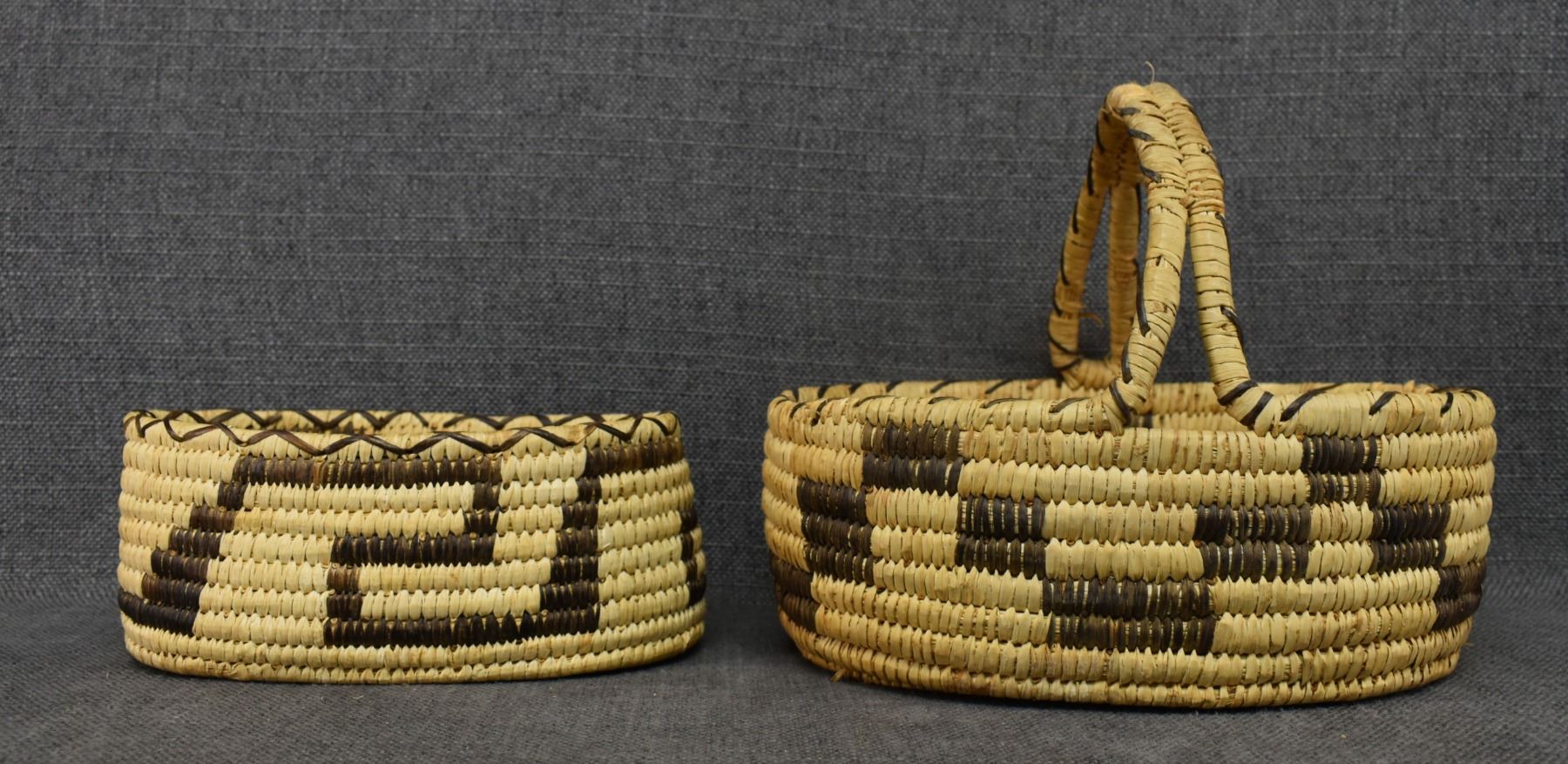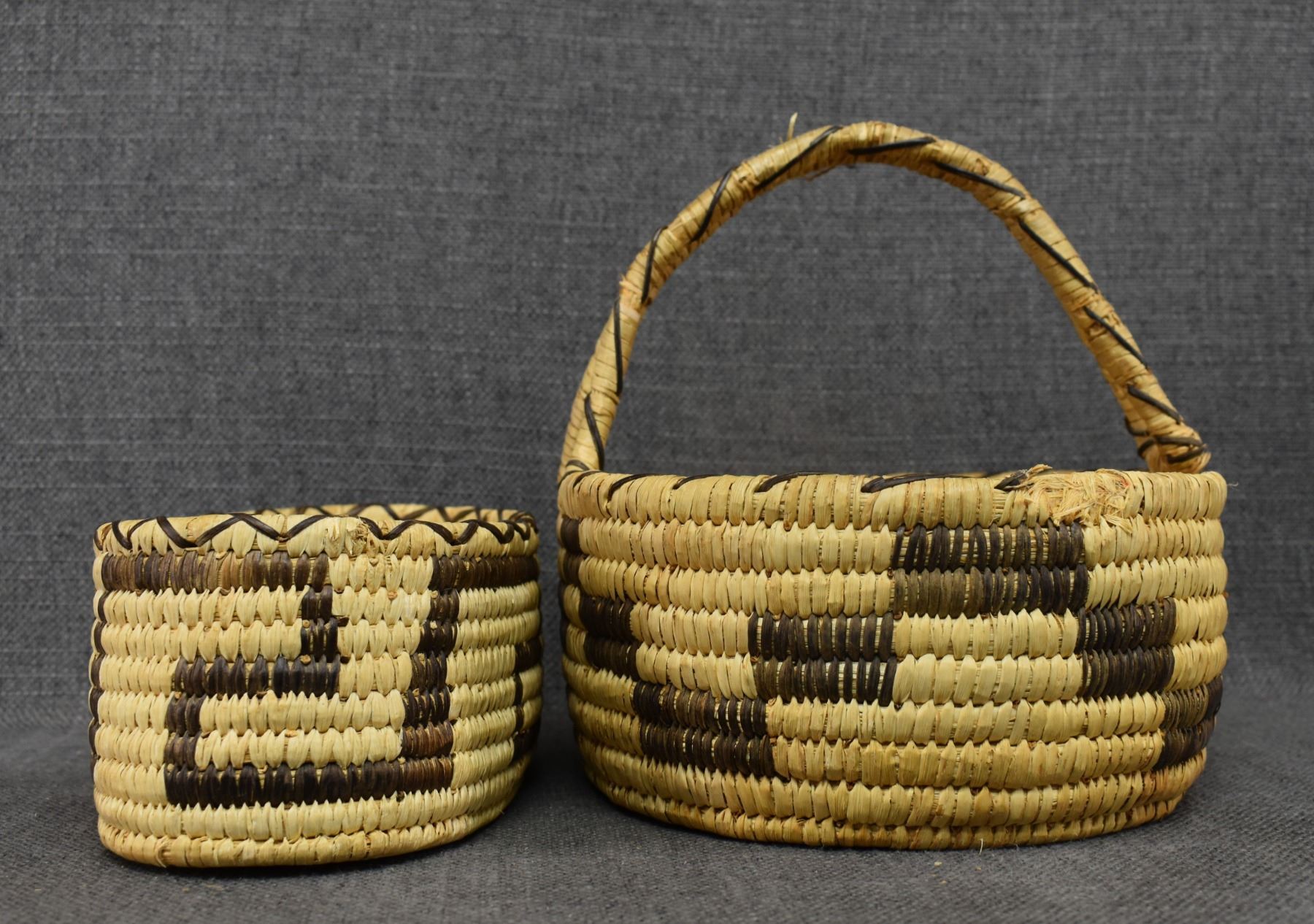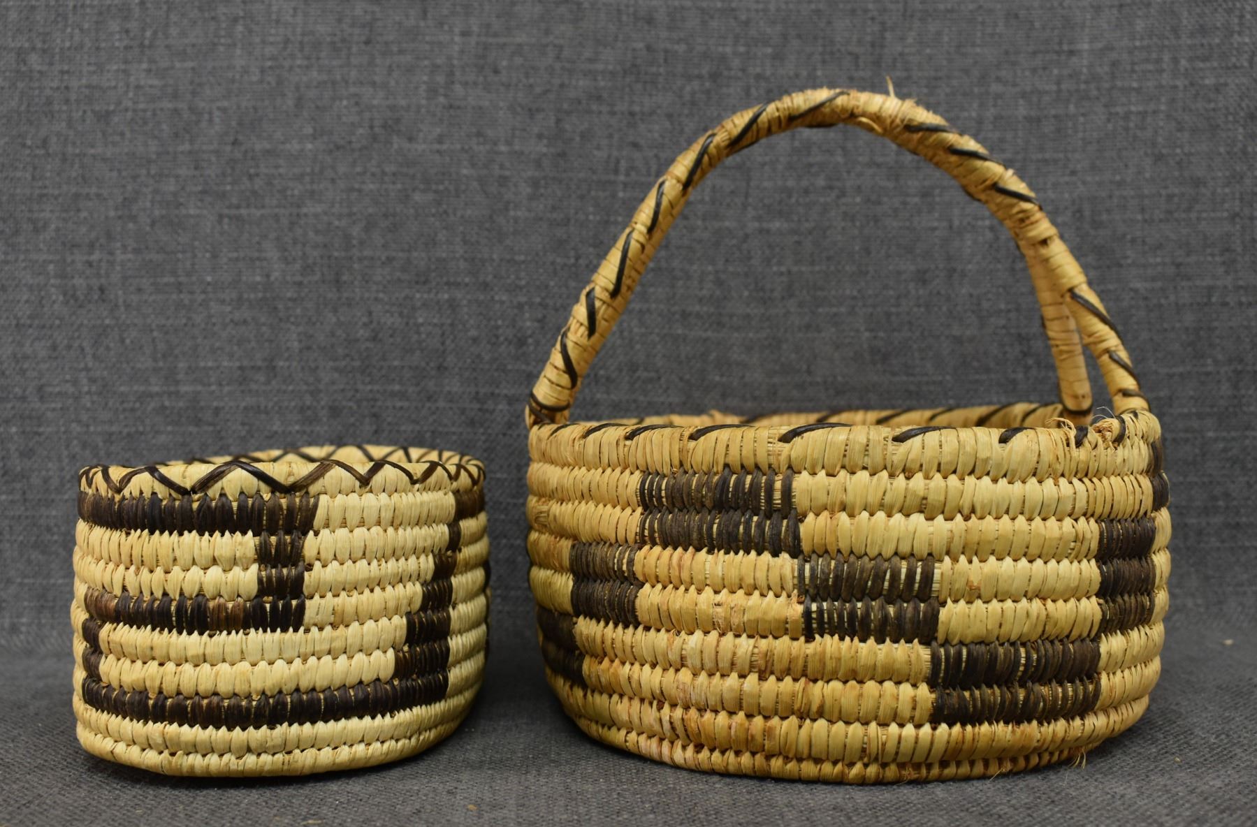 1970's Papago hand coiled baskets with geometric design. Basket 8" x 7.5" x 9.5" has stich loss, bowl 3" x 4.5" x 7"