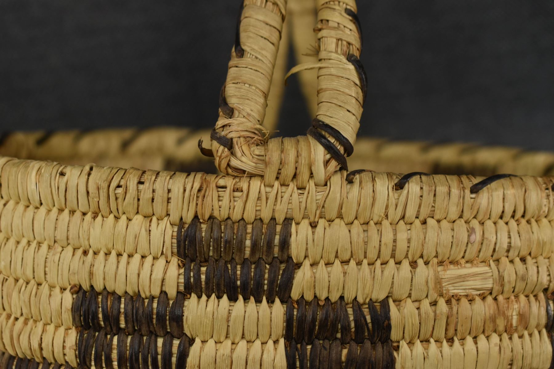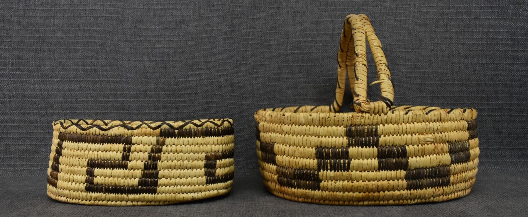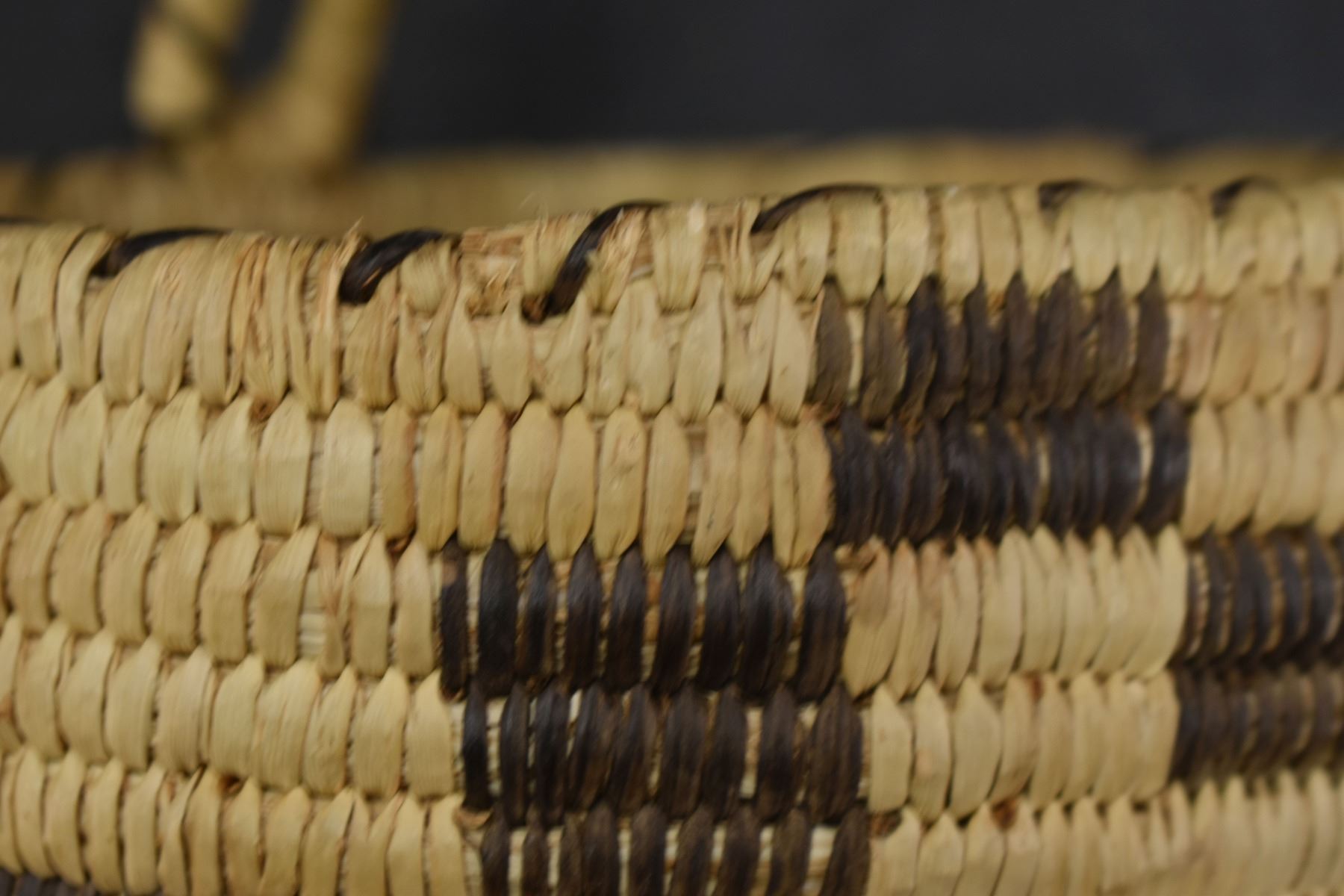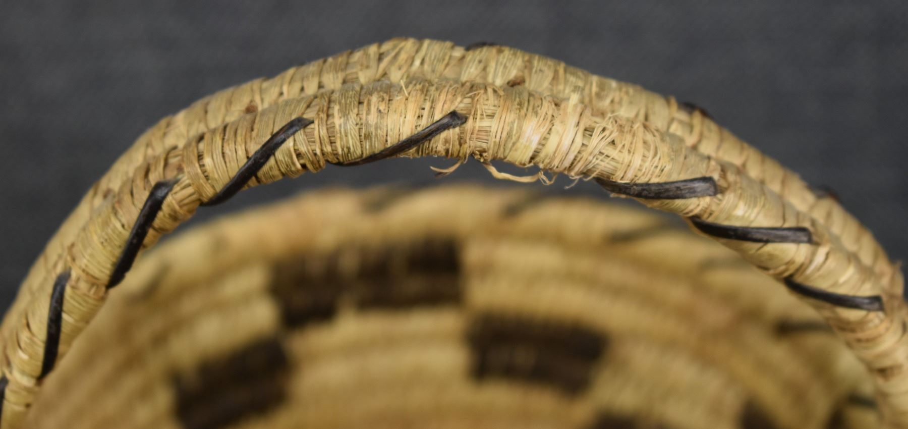 1970's Papago hand coiled baskets with geometric design. Basket 8" x 7.5" x 9.5" has stich loss, bowl 3" x 4.5" x 7"