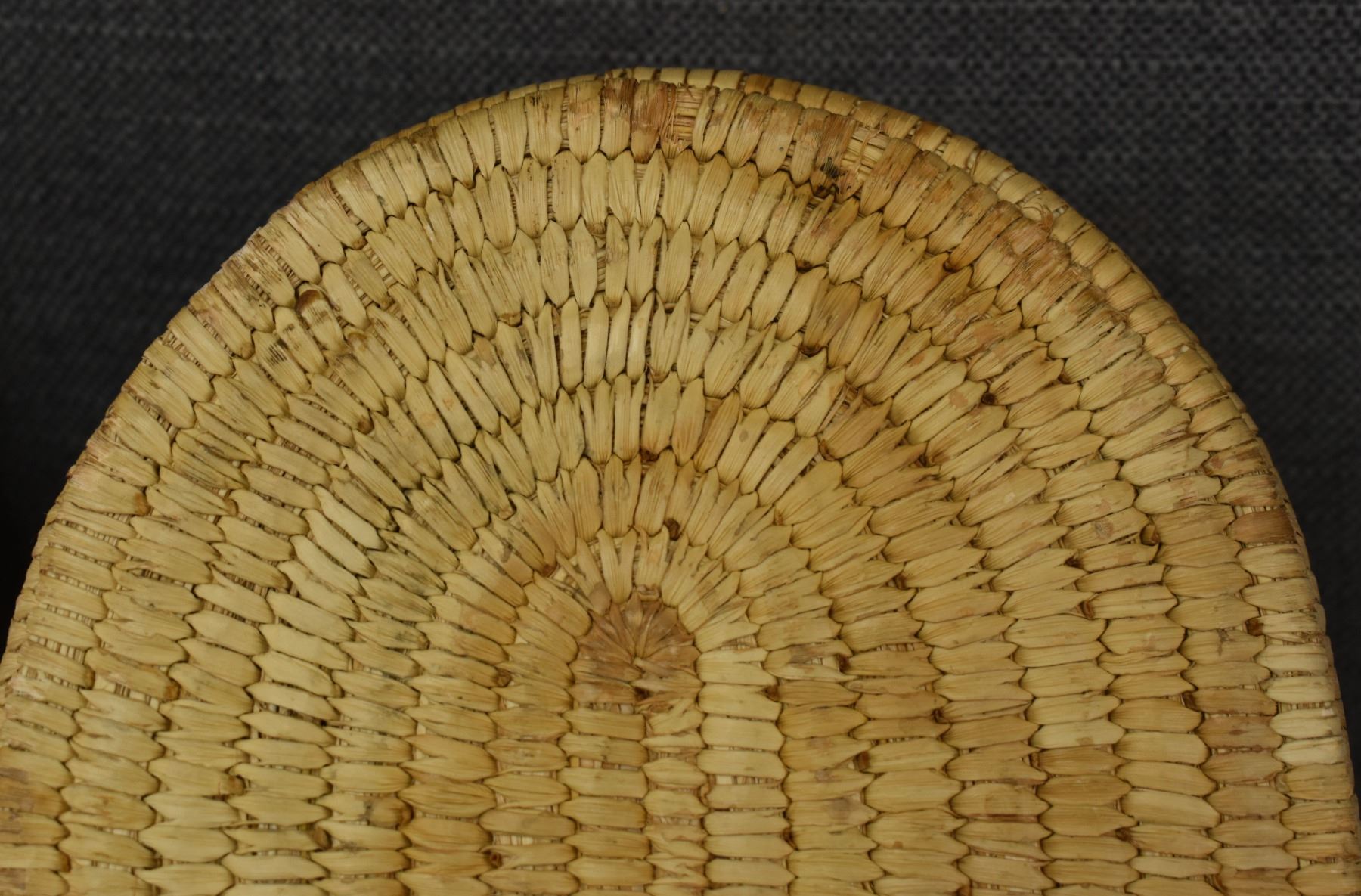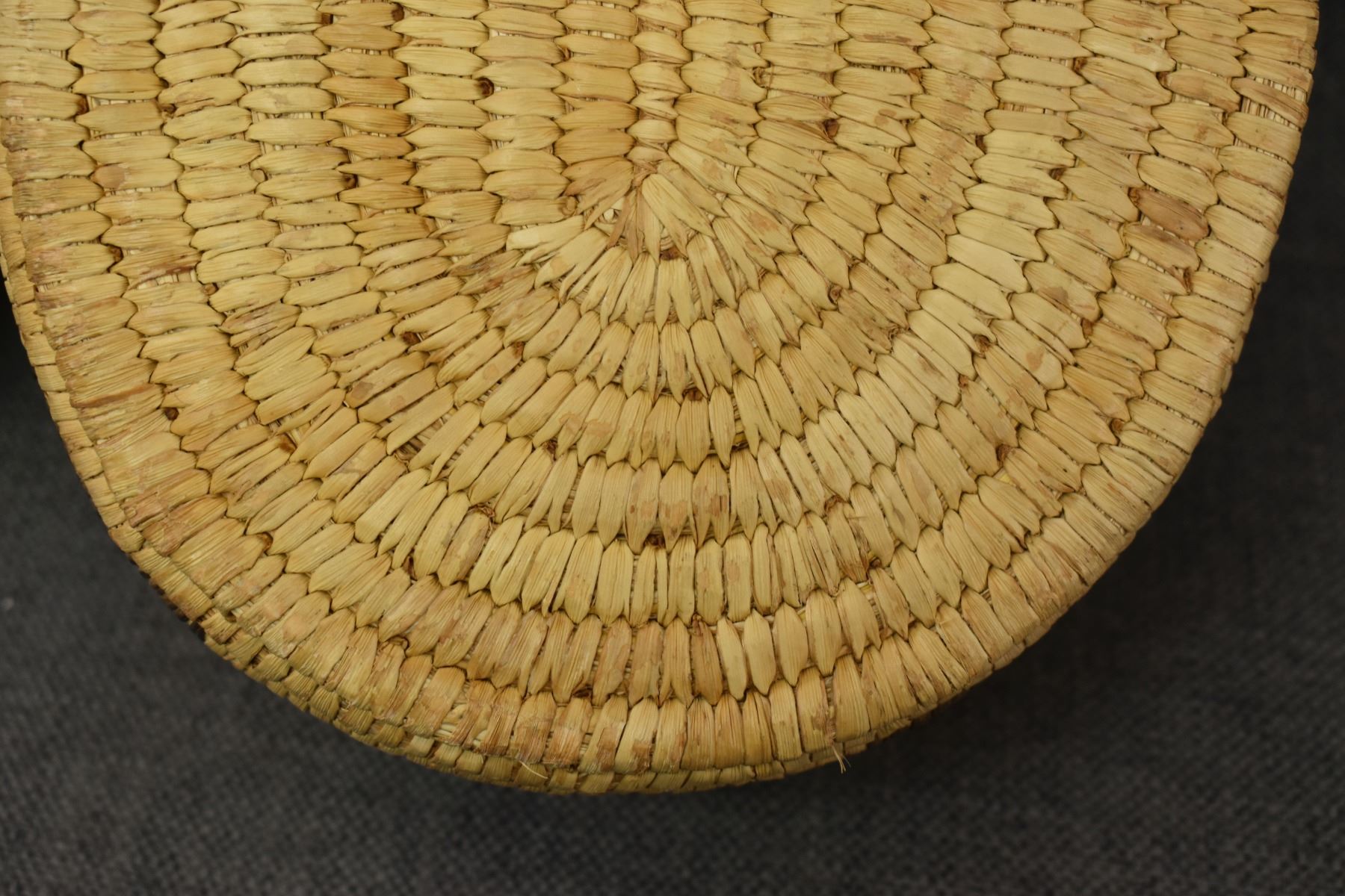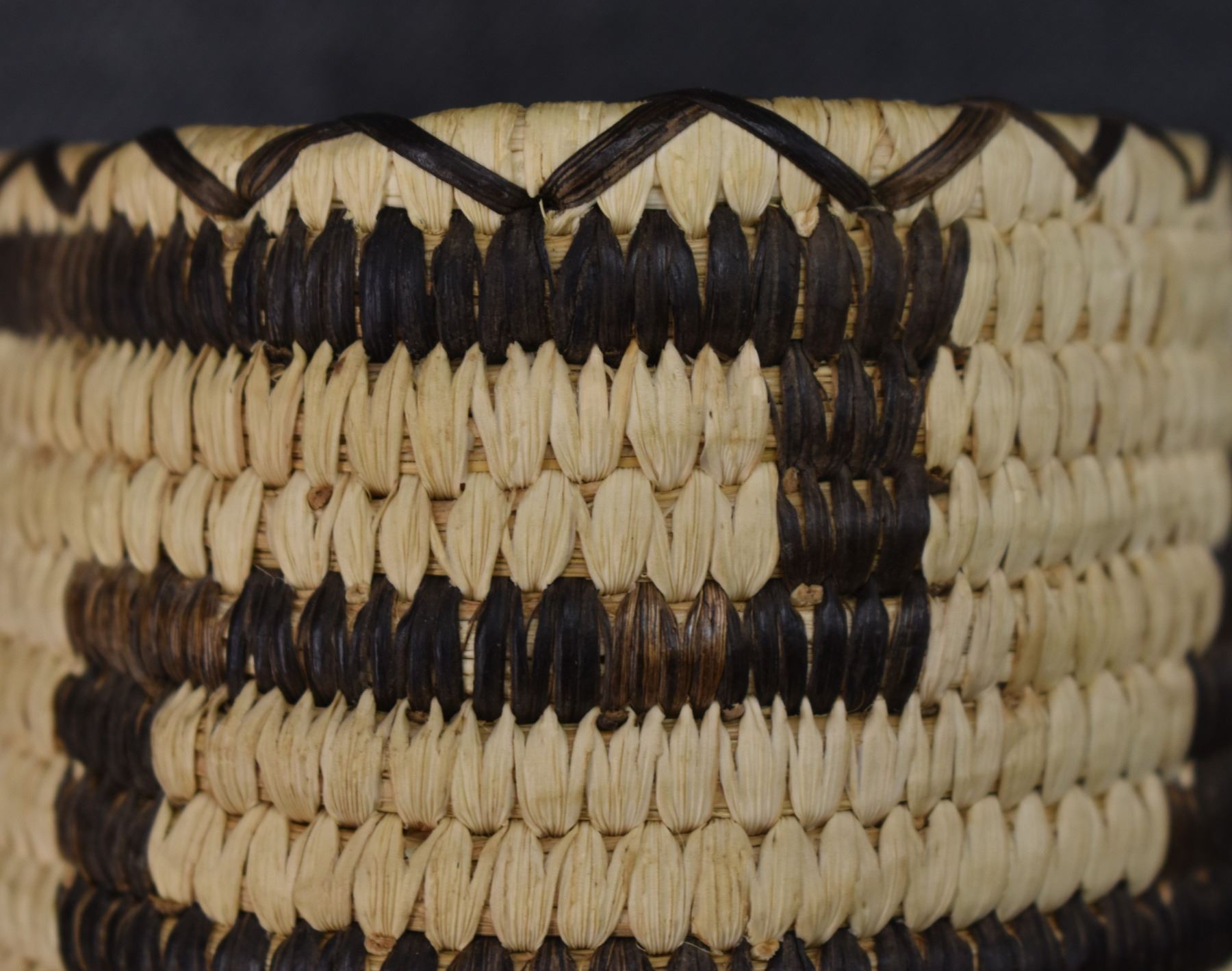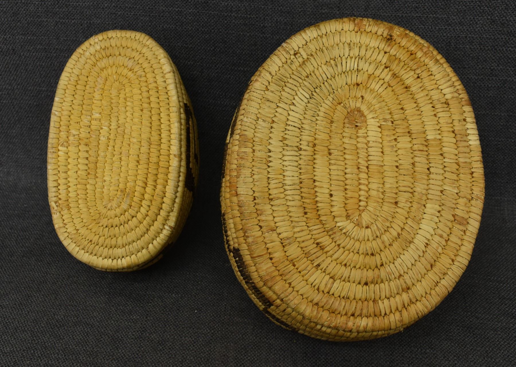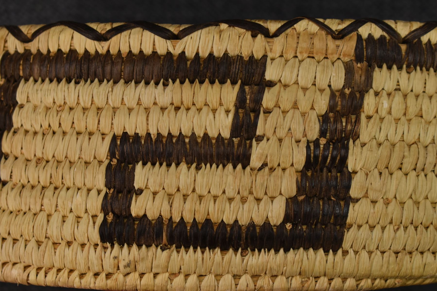 1970's Papago hand coiled baskets with geometric design. Basket 8" x 7.5" x 9.5" has stich loss, bowl 3" x 4.5" x 7"