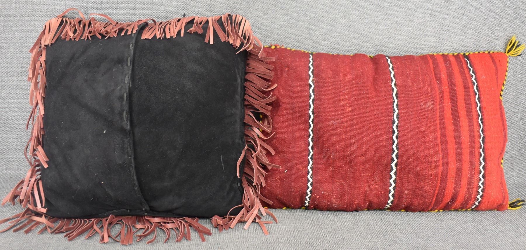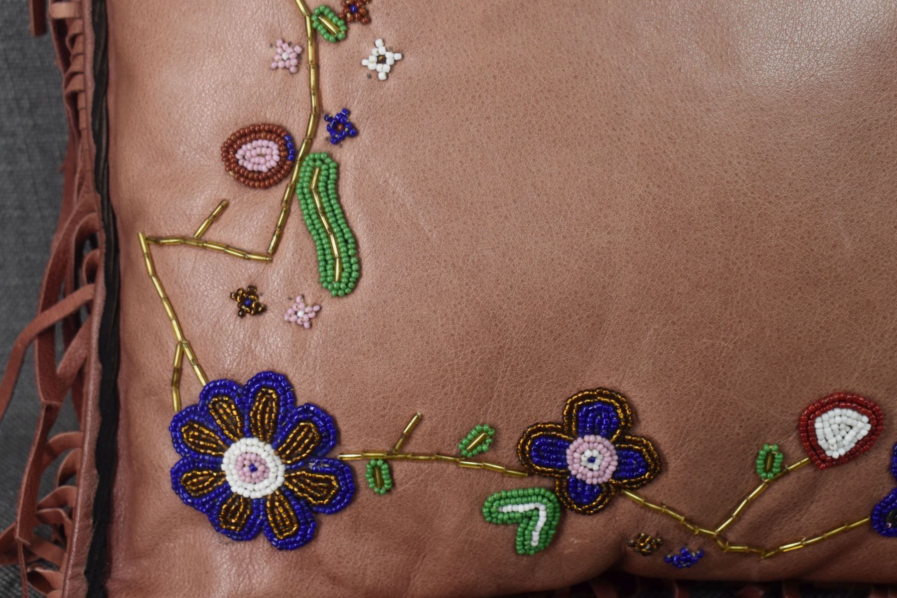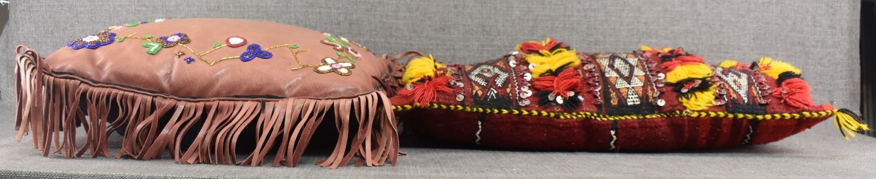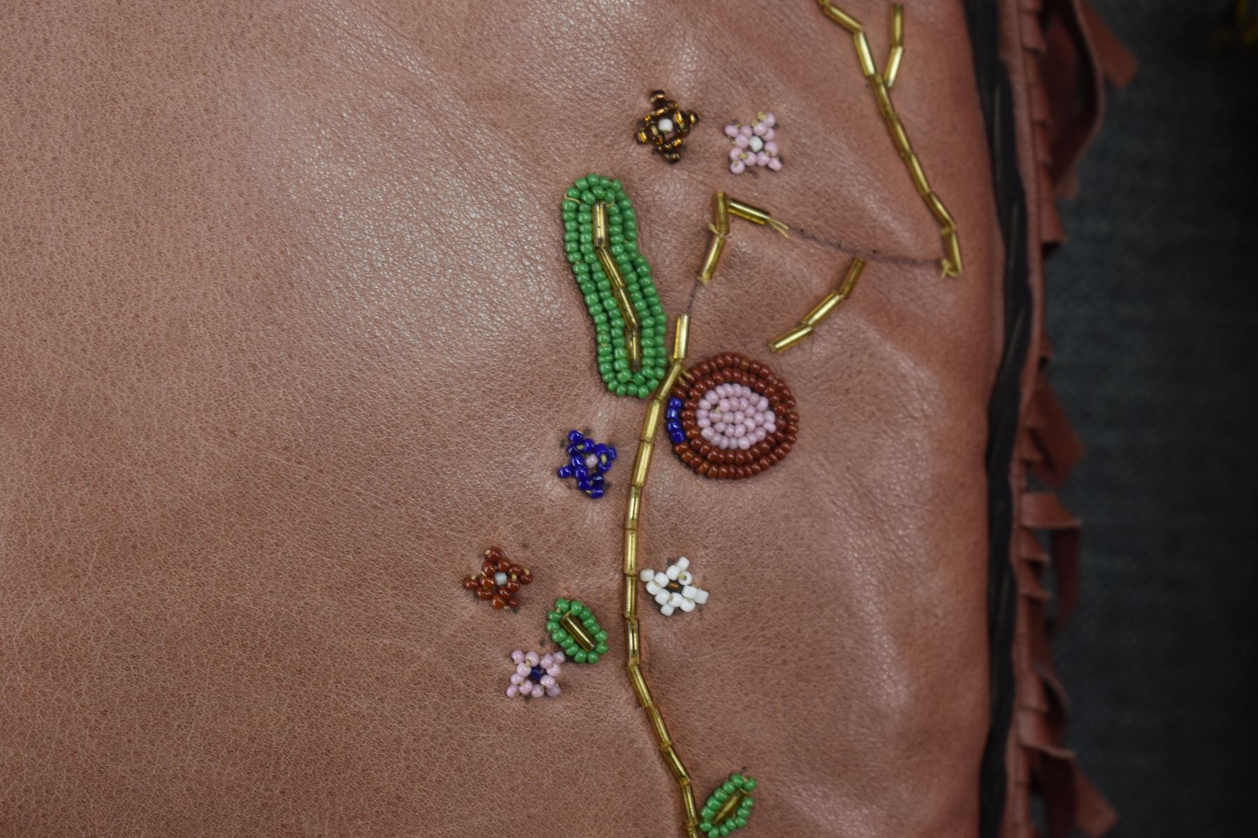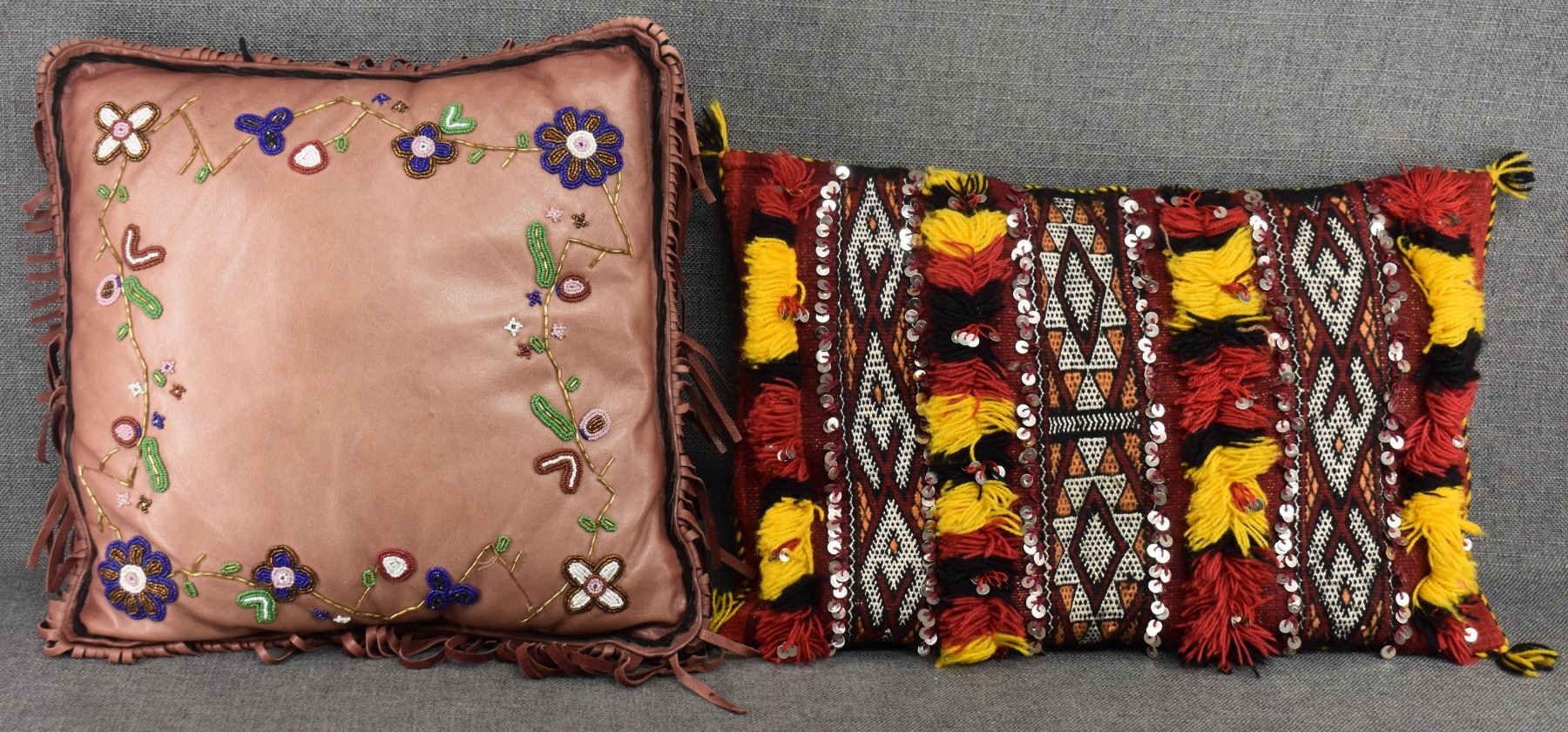 contemporary. Leather pillow with floral beaded design 14'' x 14'' and other textile with fringe, 18'' x 12''
