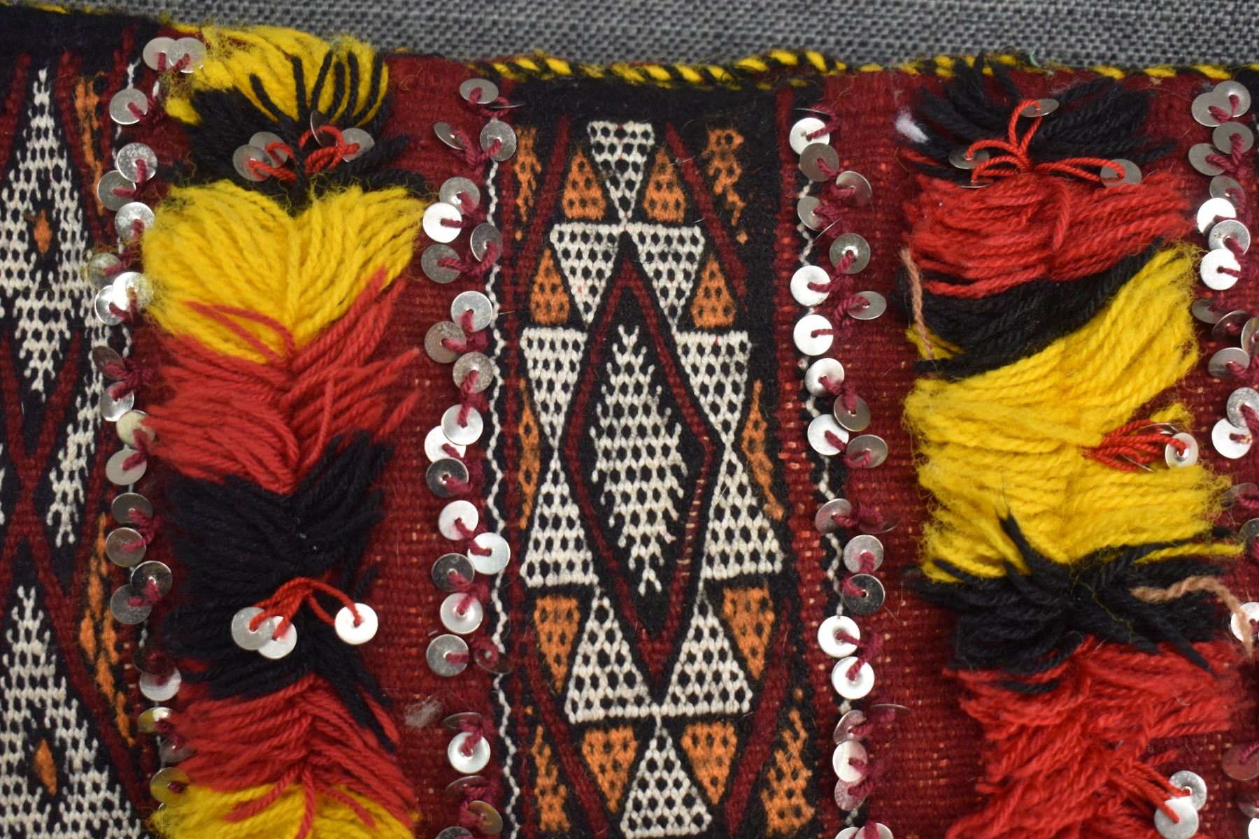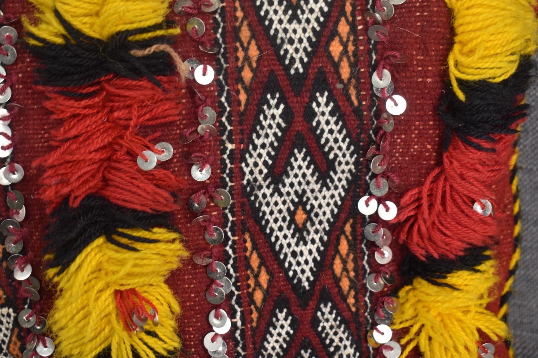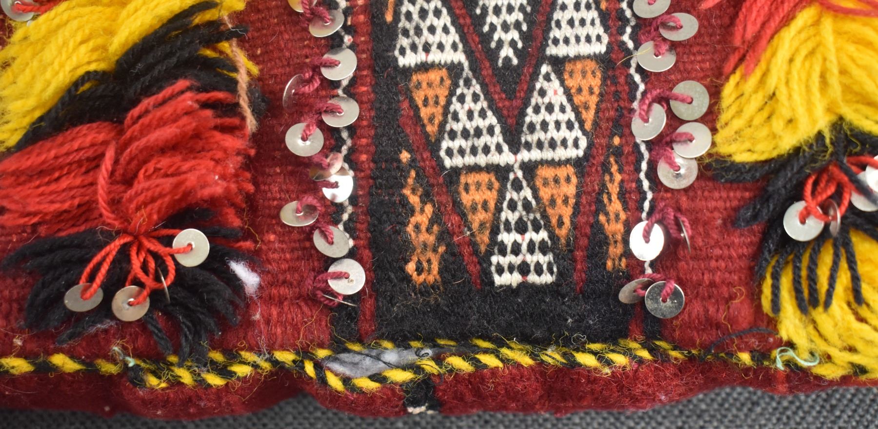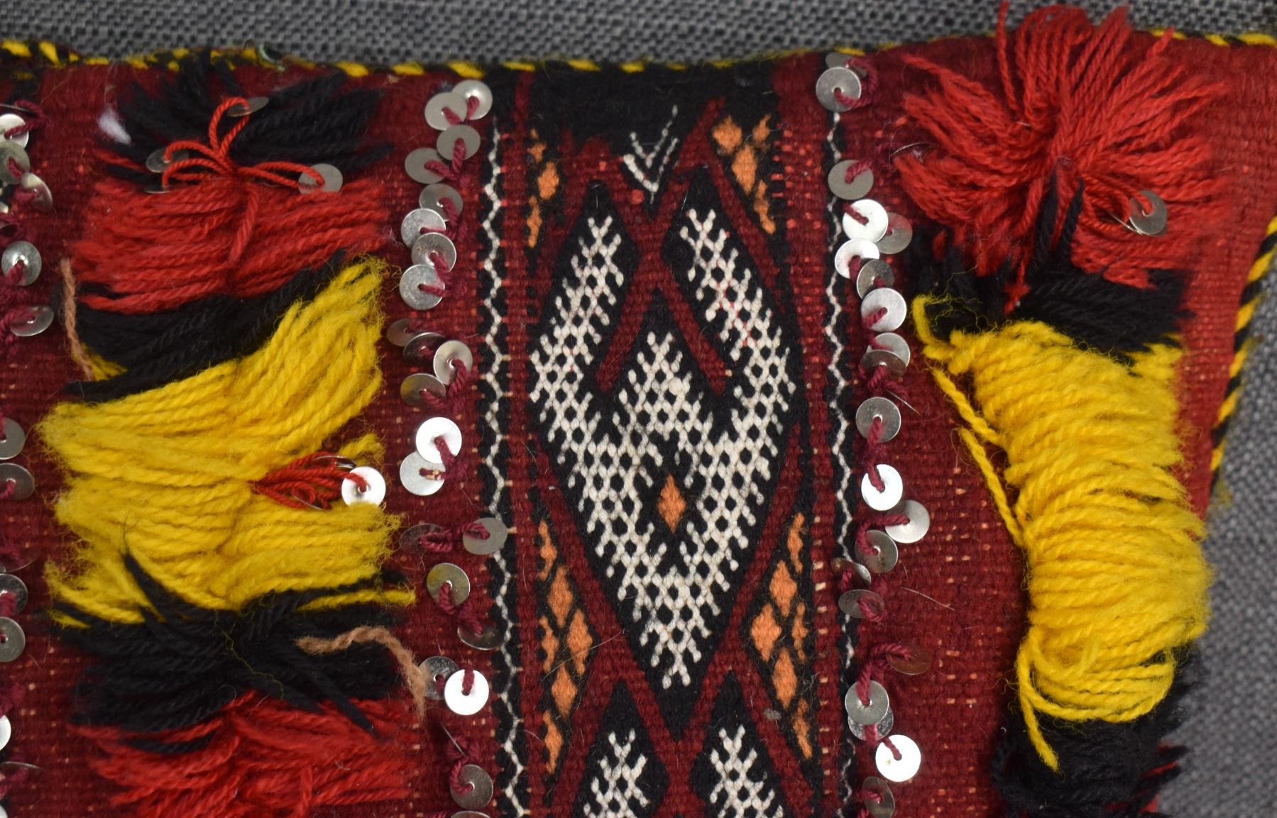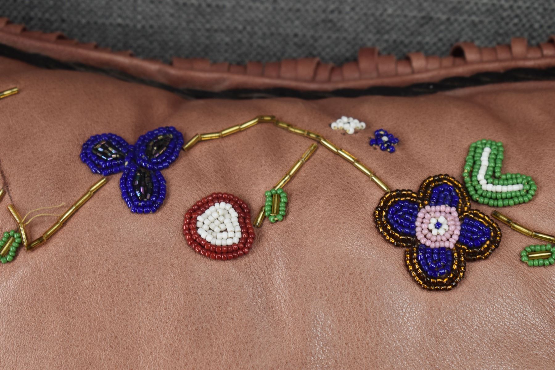 contemporary. Leather pillow with floral beaded design 14'' x 14'' and other textile with fringe, 18'' x 12''