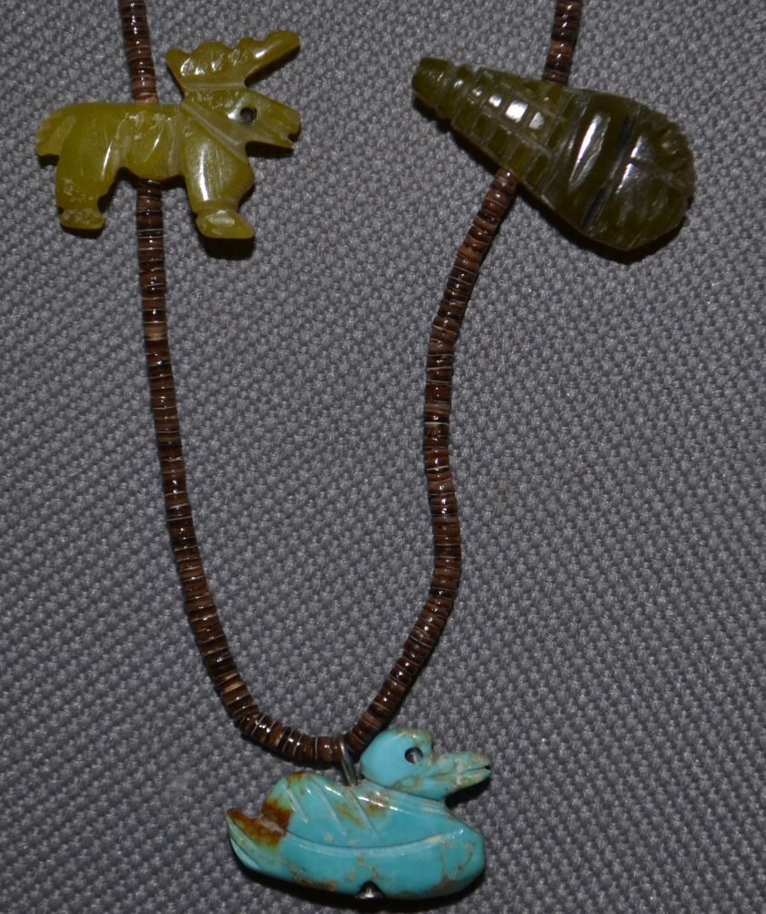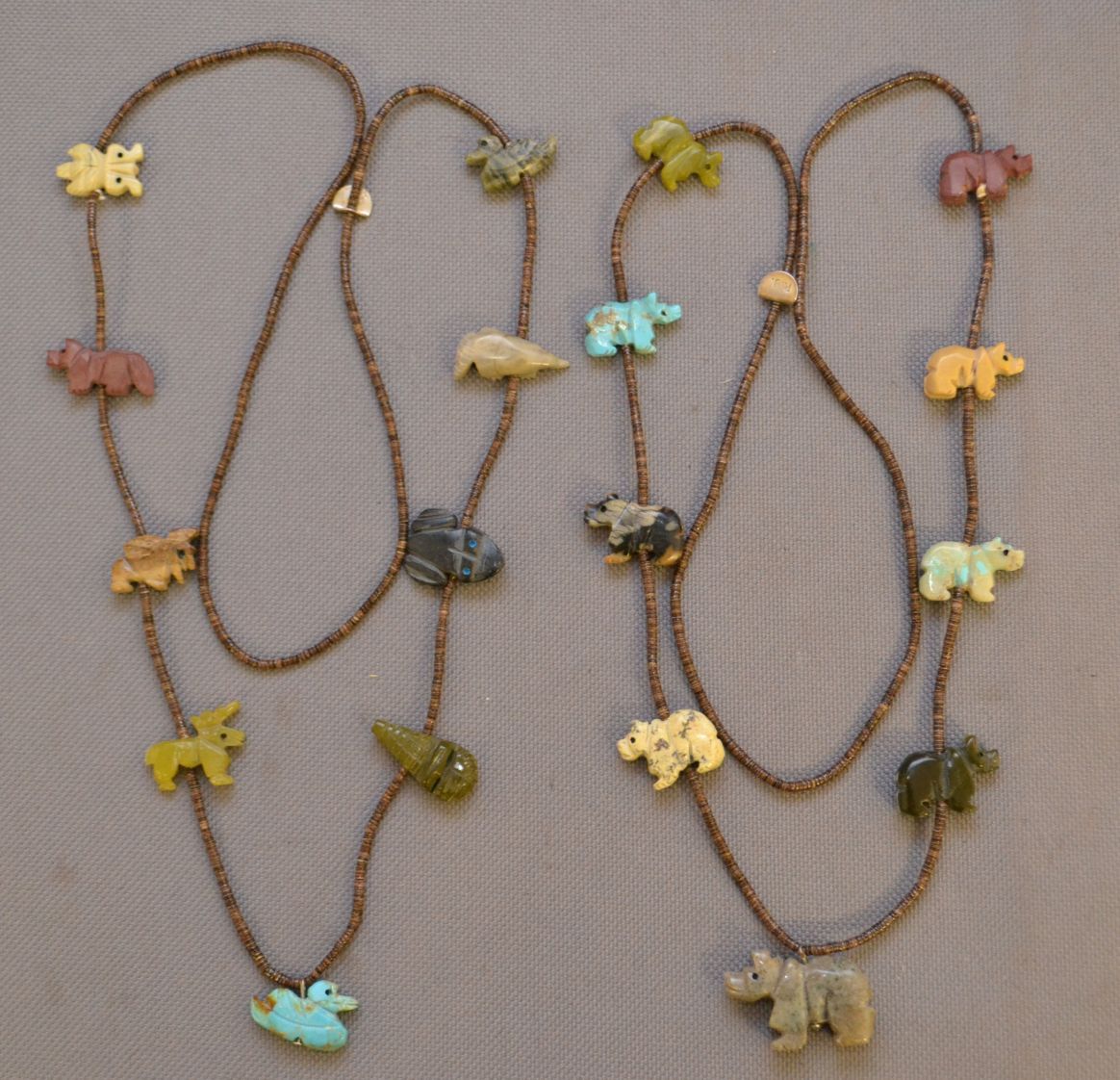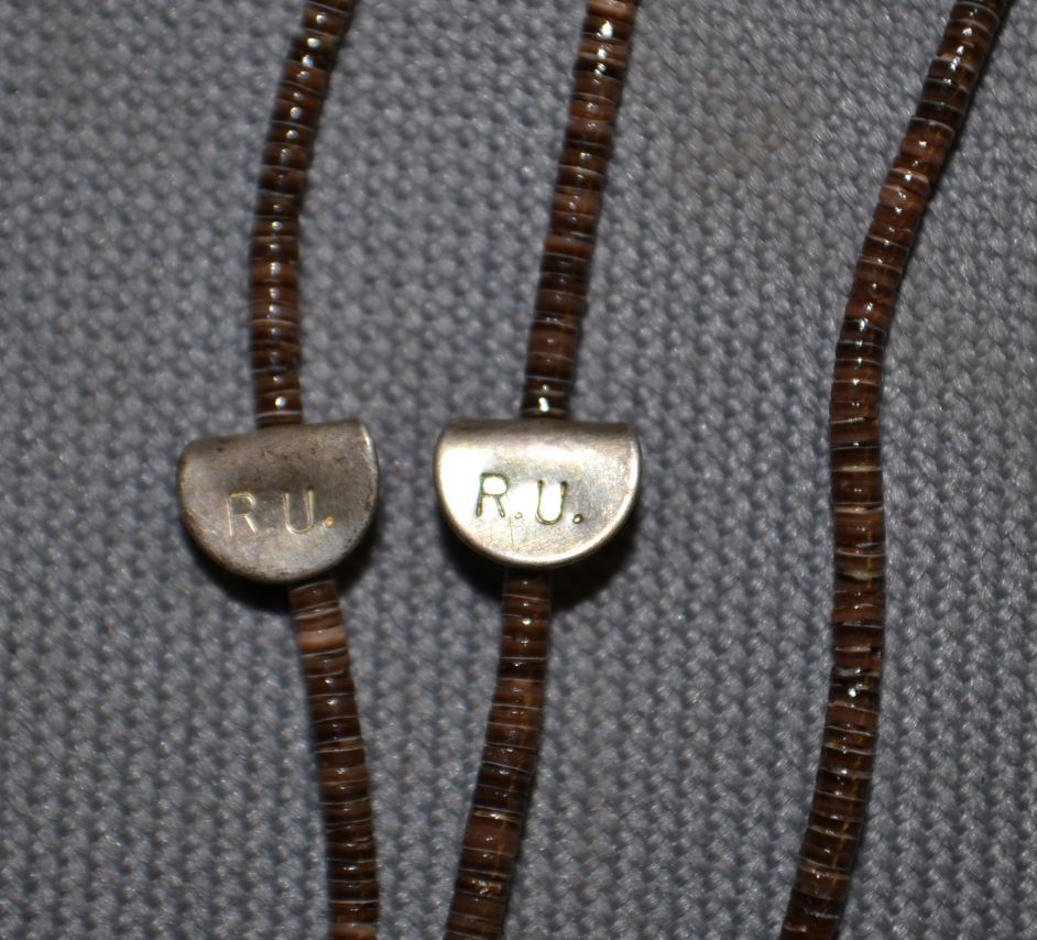 1970s 80s single-strand fetish necklaces with shell heshi signed R.U. (Ron Upshaw) 26" long each