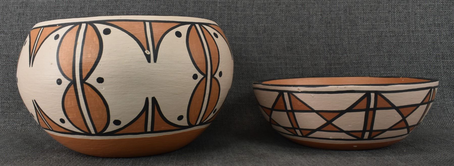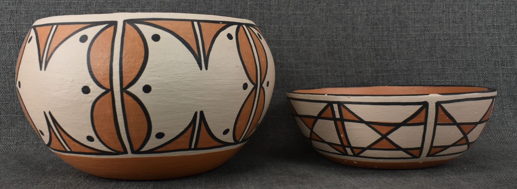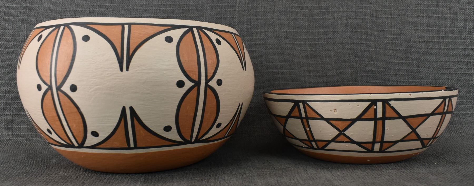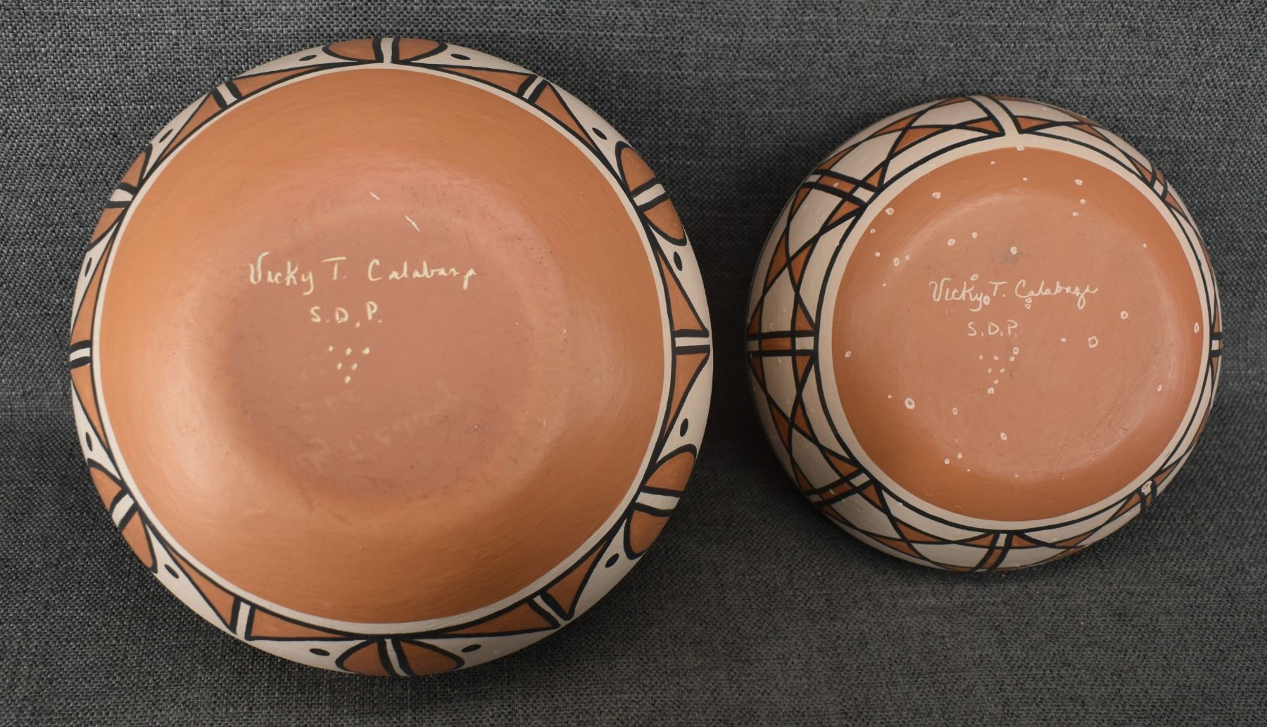 1990's Santo Domingo, hand coiled with polychrome painted design by Vicky Calabaza. Largest 5.75" x 9" both have pitting
