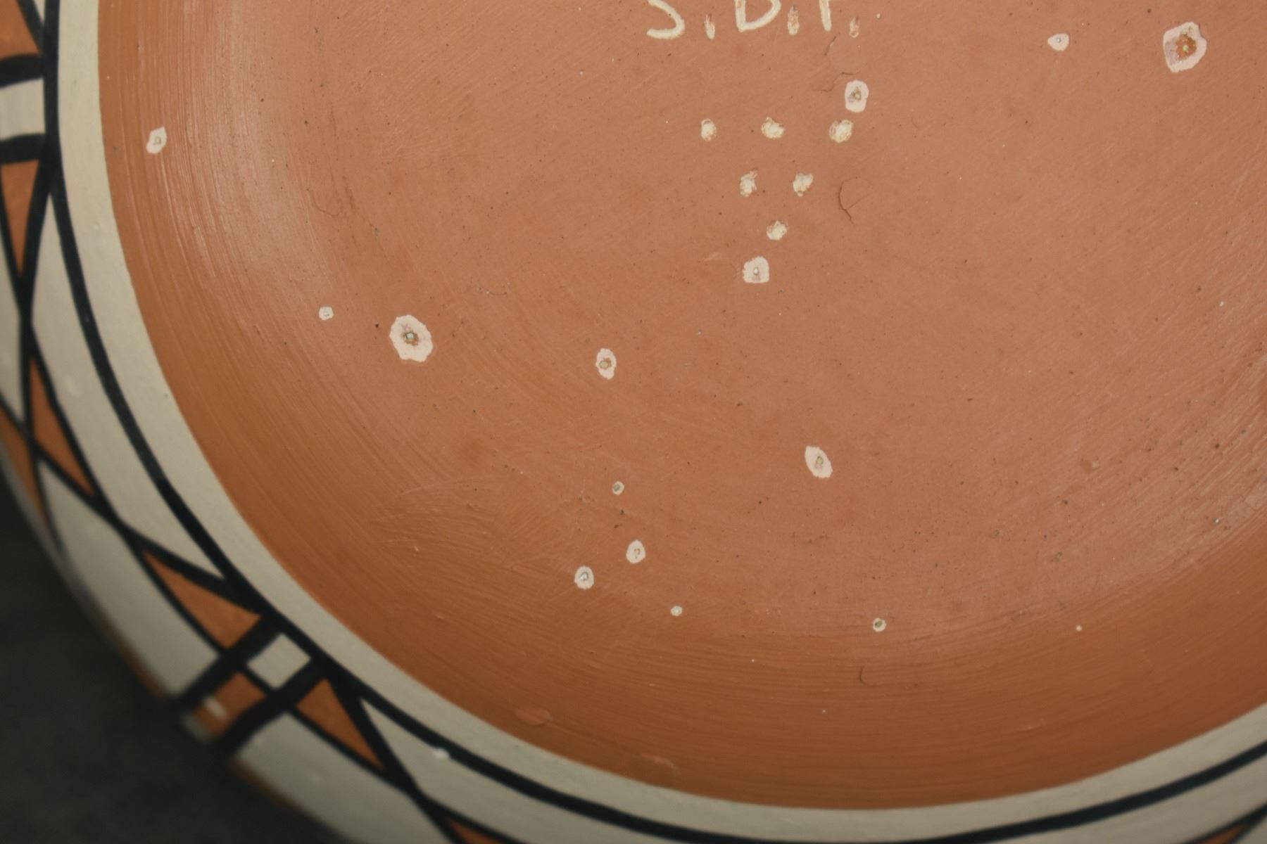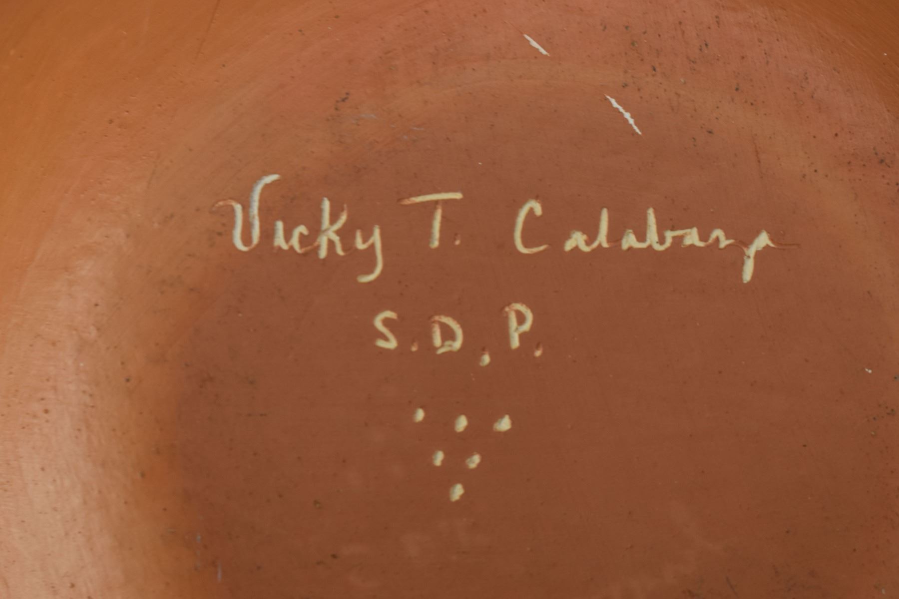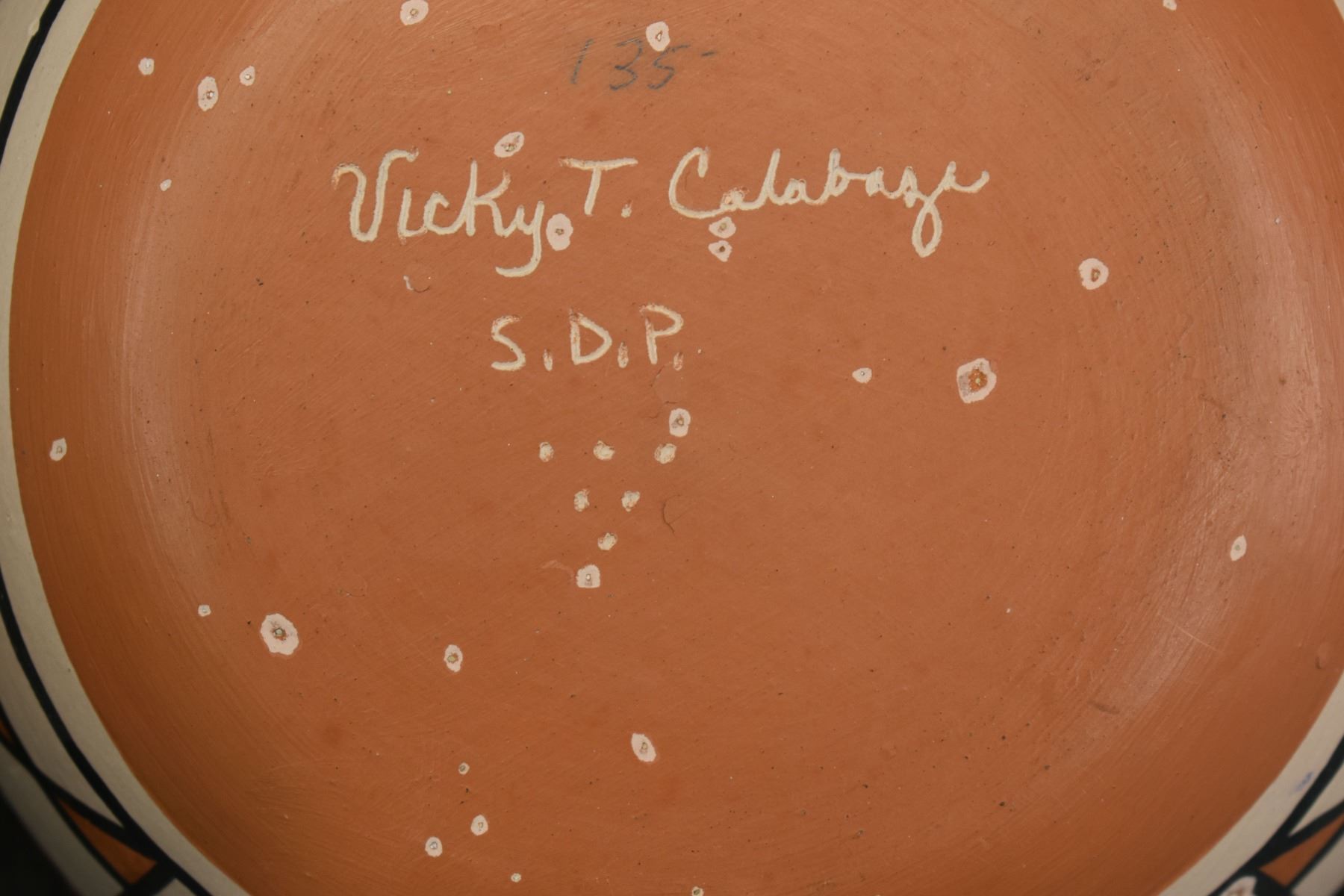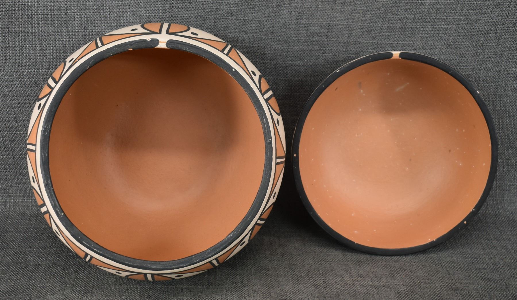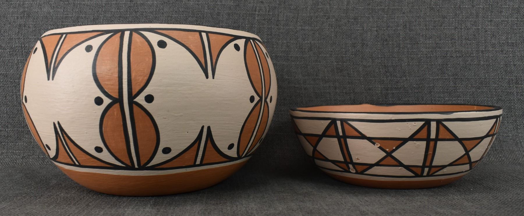 1990's Santo Domingo, hand coiled with polychrome painted design by Vicky Calabaza. Largest 5.75" x 9" both have pitting