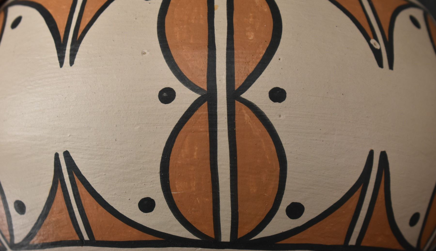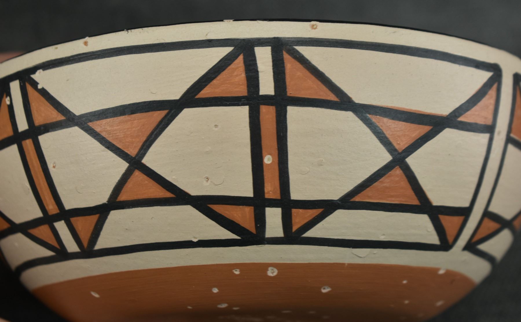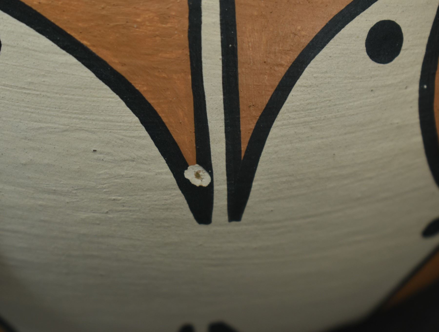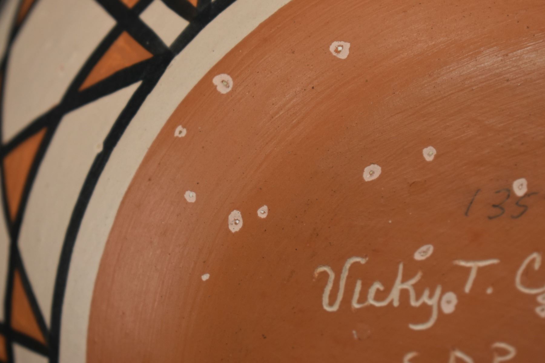 1990's Santo Domingo, hand coiled with polychrome painted design by Vicky Calabaza. Largest 5.75" x 9" both have pitting