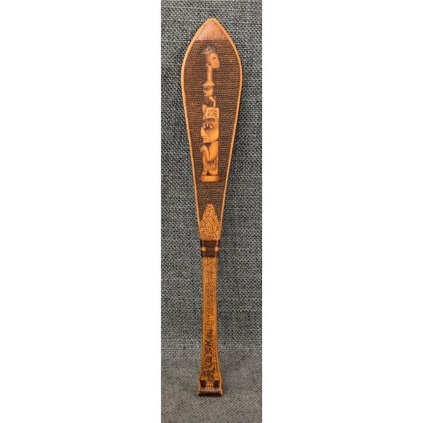 20th century North West Coast, wood with carved/wood-burned totem pole, spoon and geometric design 11.5" x 1.75"