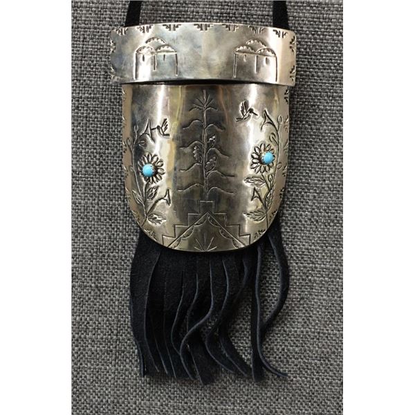 1990-2000's Navajo, sterling silver stamped cornstalk flower and raincloud design with turquoise stones leather bag 4.25" x 3.25" excl...