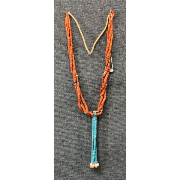 1950's Pueblo Indian, three strands of coral with turquoise and silver beads 30" long, turquoise and shell joclas 5.5" long
