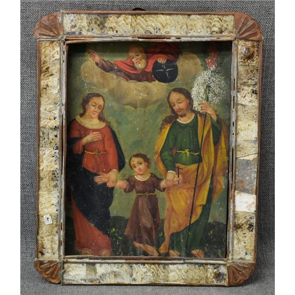 20th century, hand painted tin retablo depicting Mary, Jesus, and Joseph in Tin frame 14.75" x 12" x 1.25"