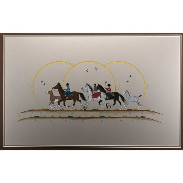2000's Navajo. Original on paper depicting girls on horse back. Signed J l King. 17'' x 28'' frame size 27'' x 38'...
