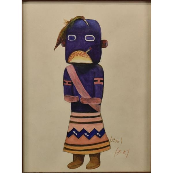 20th century Hopi. Original on paper depicting Kachina smoking, signed FK. 8'' x 11''