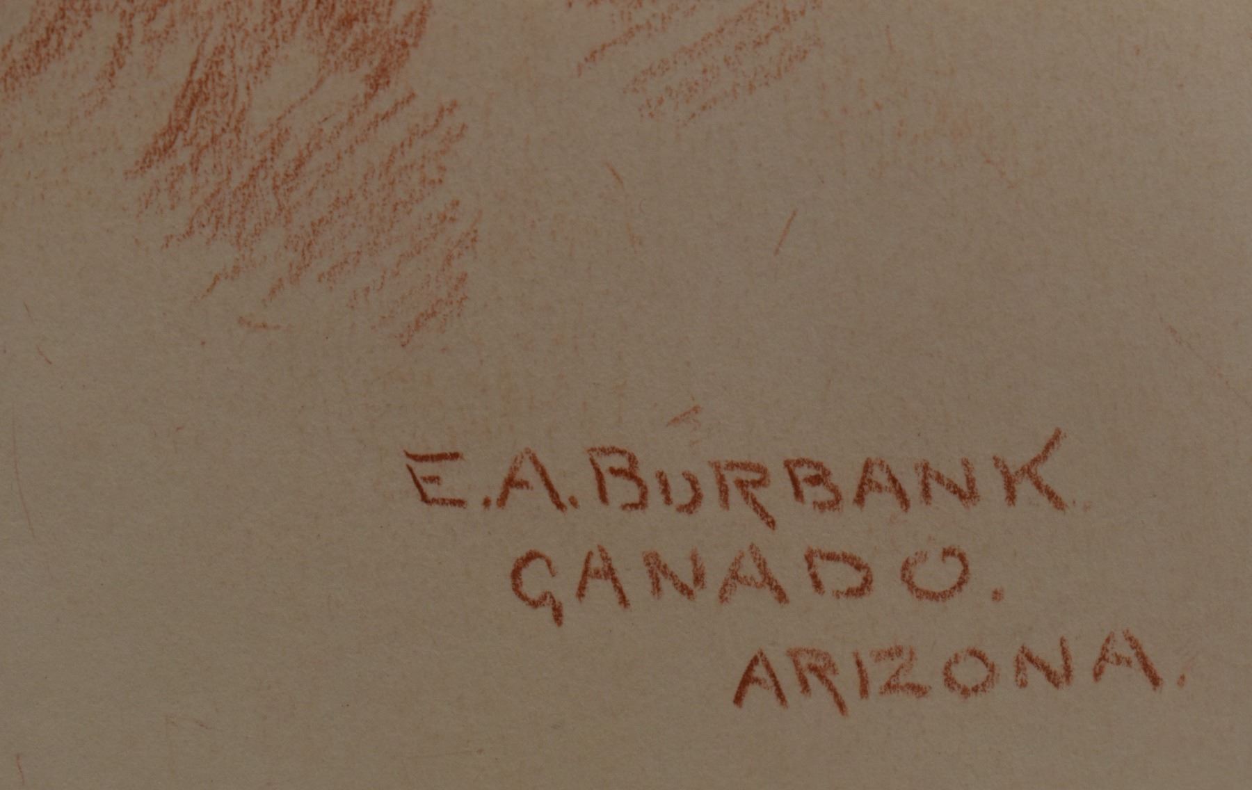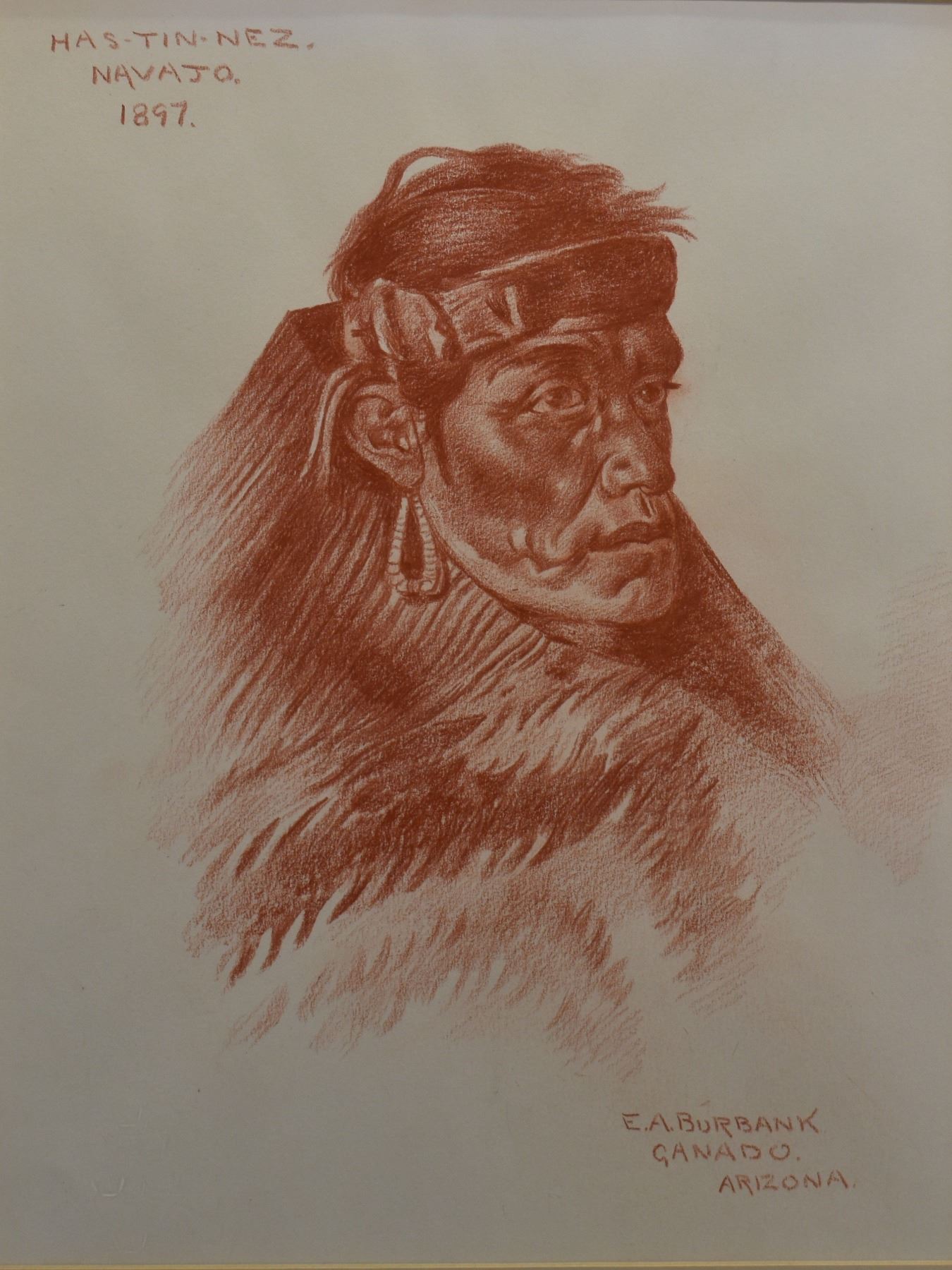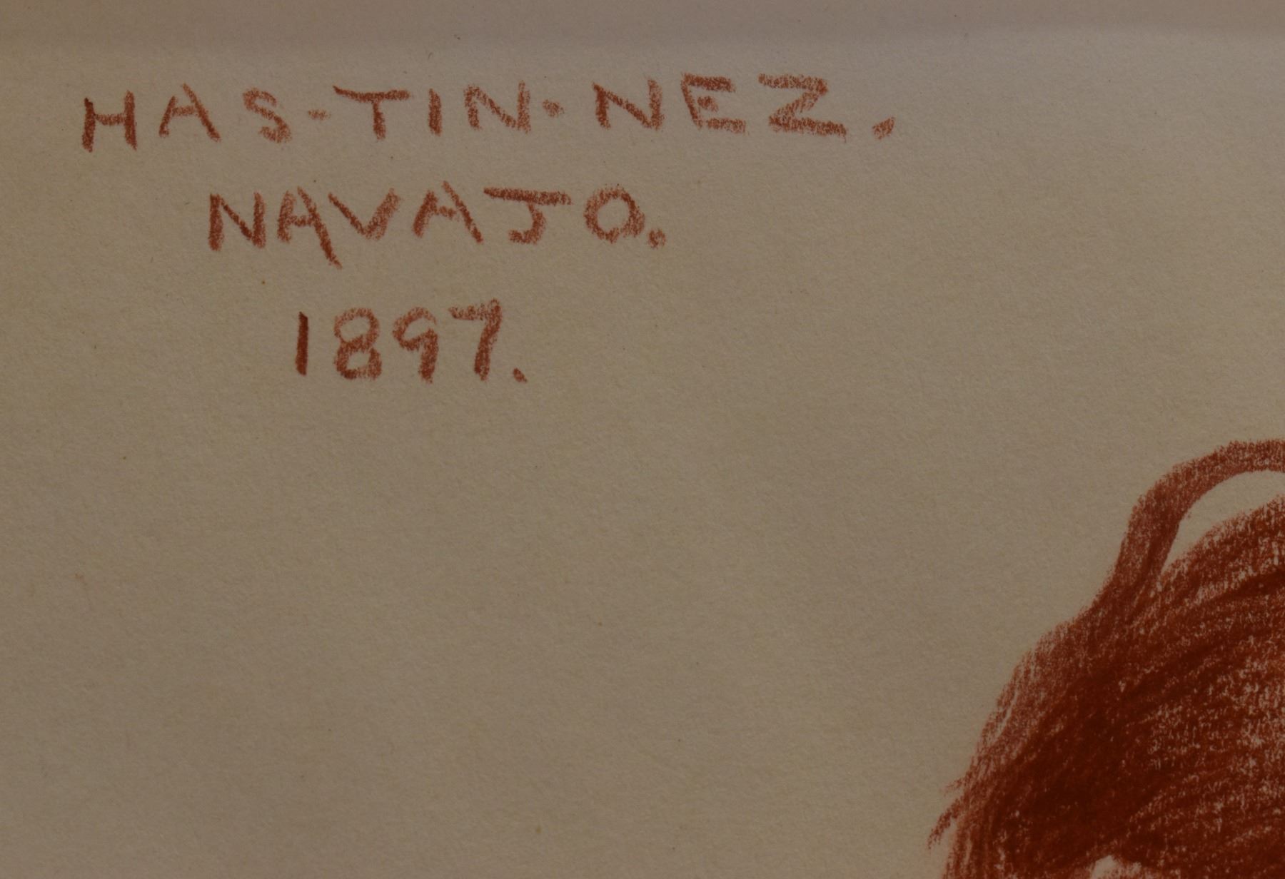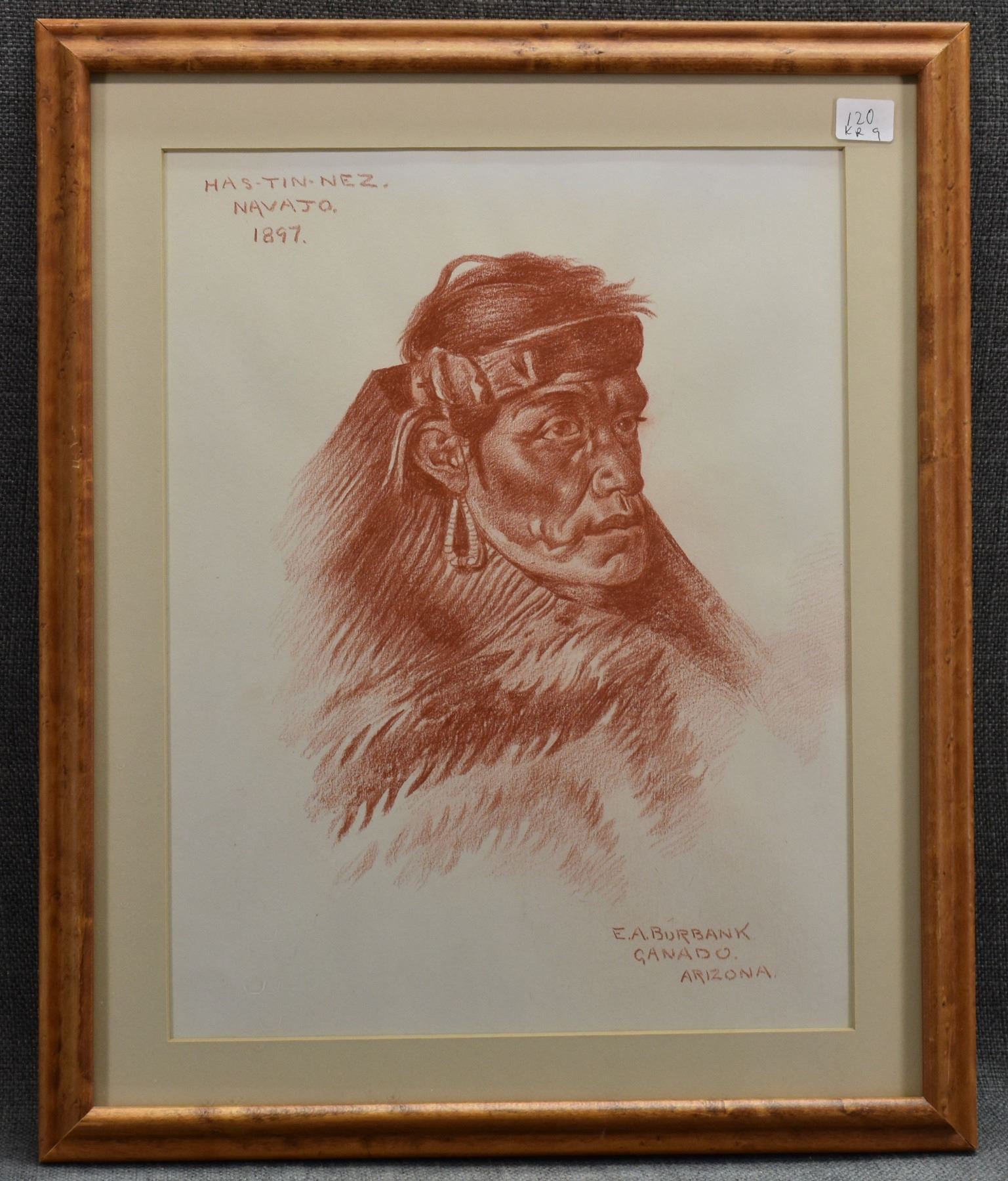 1897 western conte crayon. Original on paper depicting Navajo man titled Has-Tin-Nez signed E. A. Burbank. 13.25" x 10.25" framed to 17" x 15"