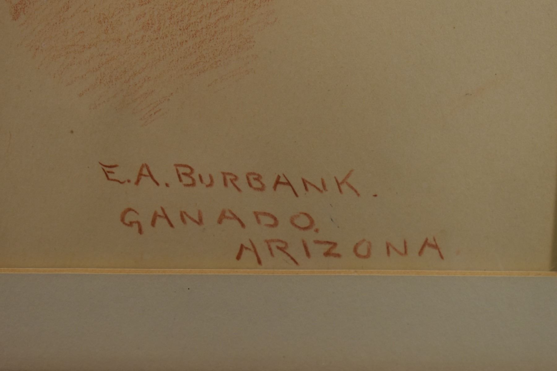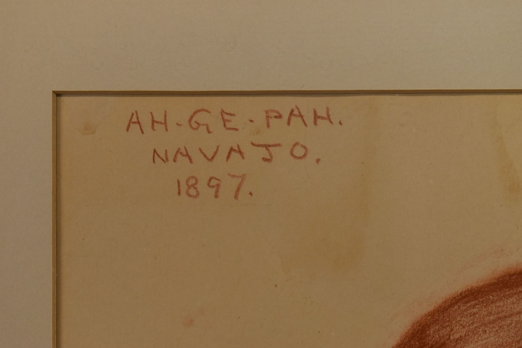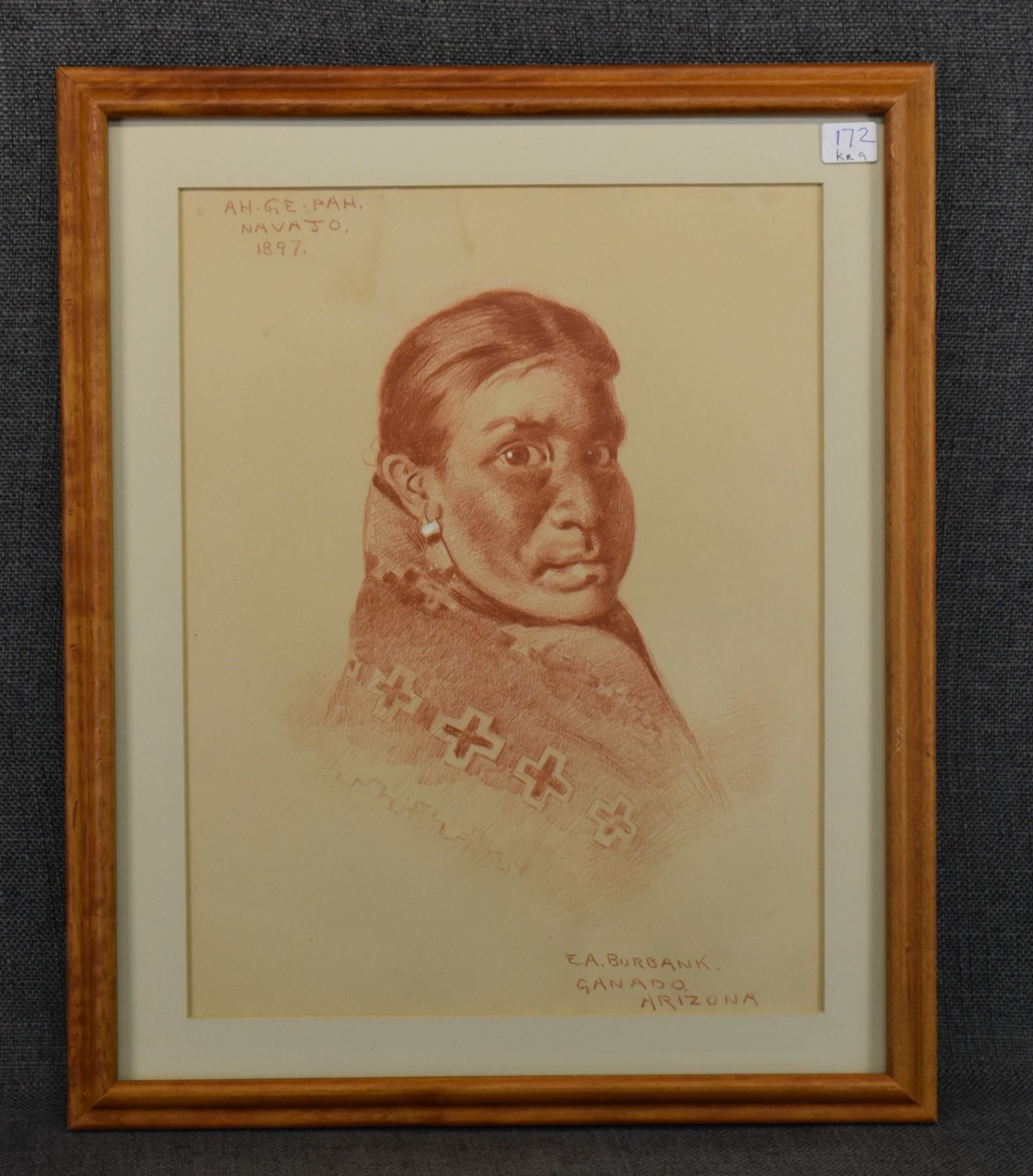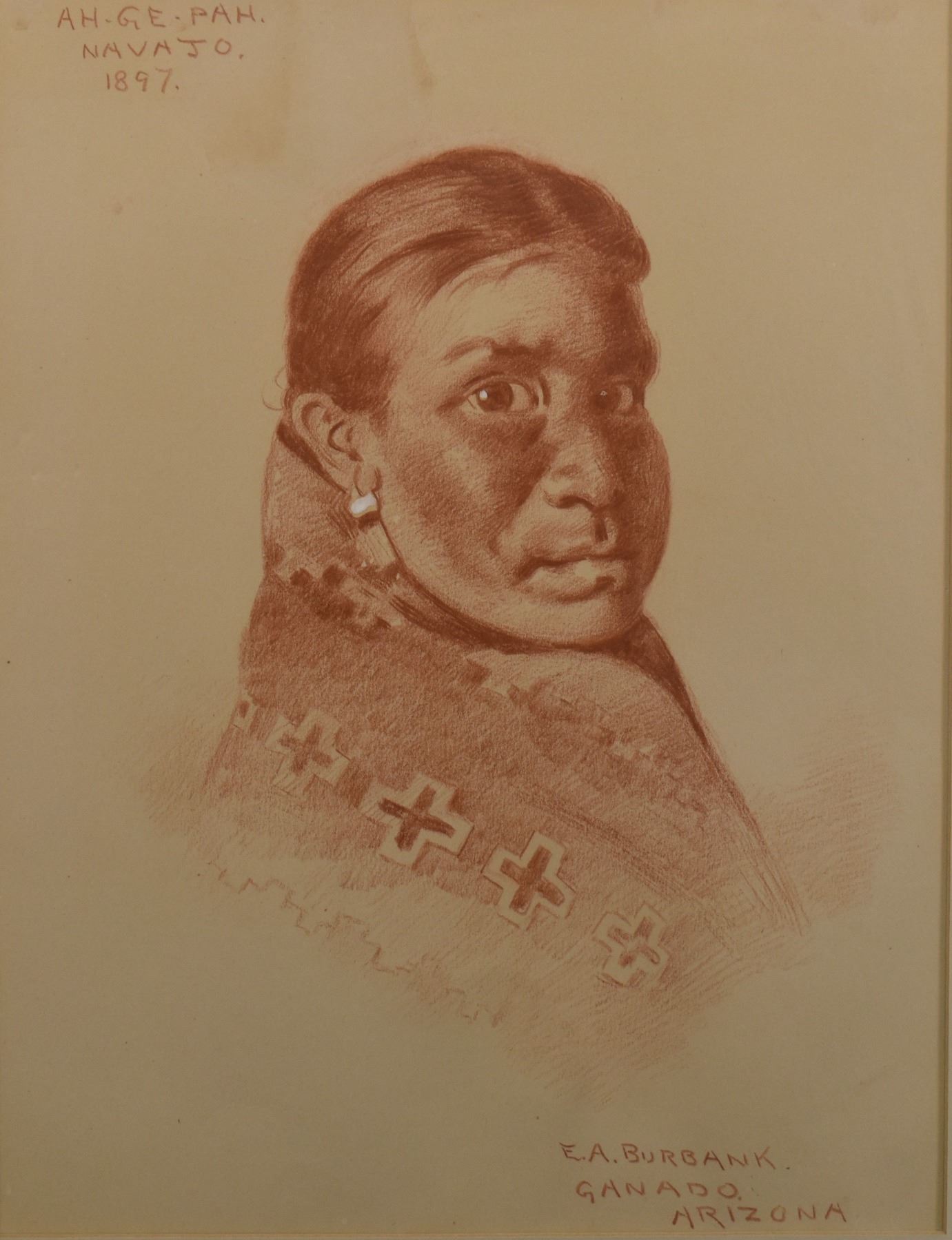 1897 western conte crayon. Original on paper depicting Navajo woman titled AH-GE -PAH, signed E. A. Burbank. 13.25" x 10.5" framed to 17" x 14"