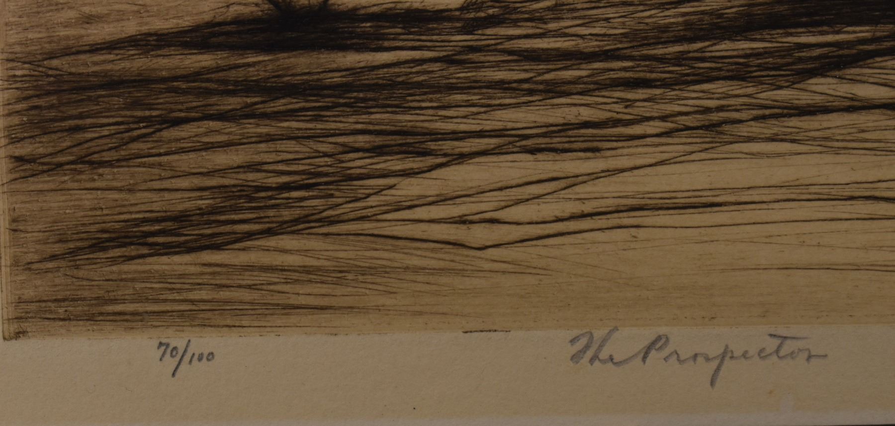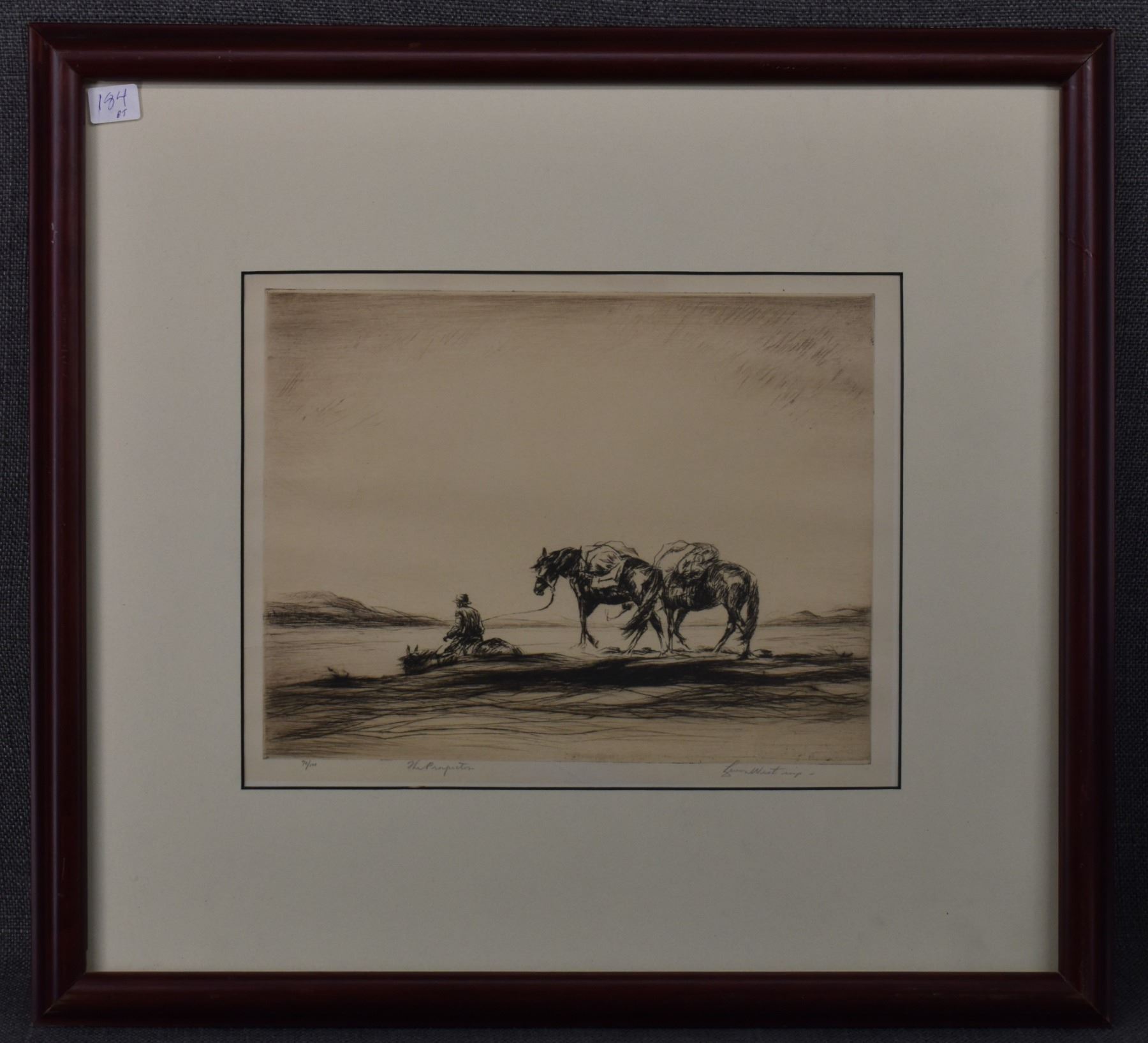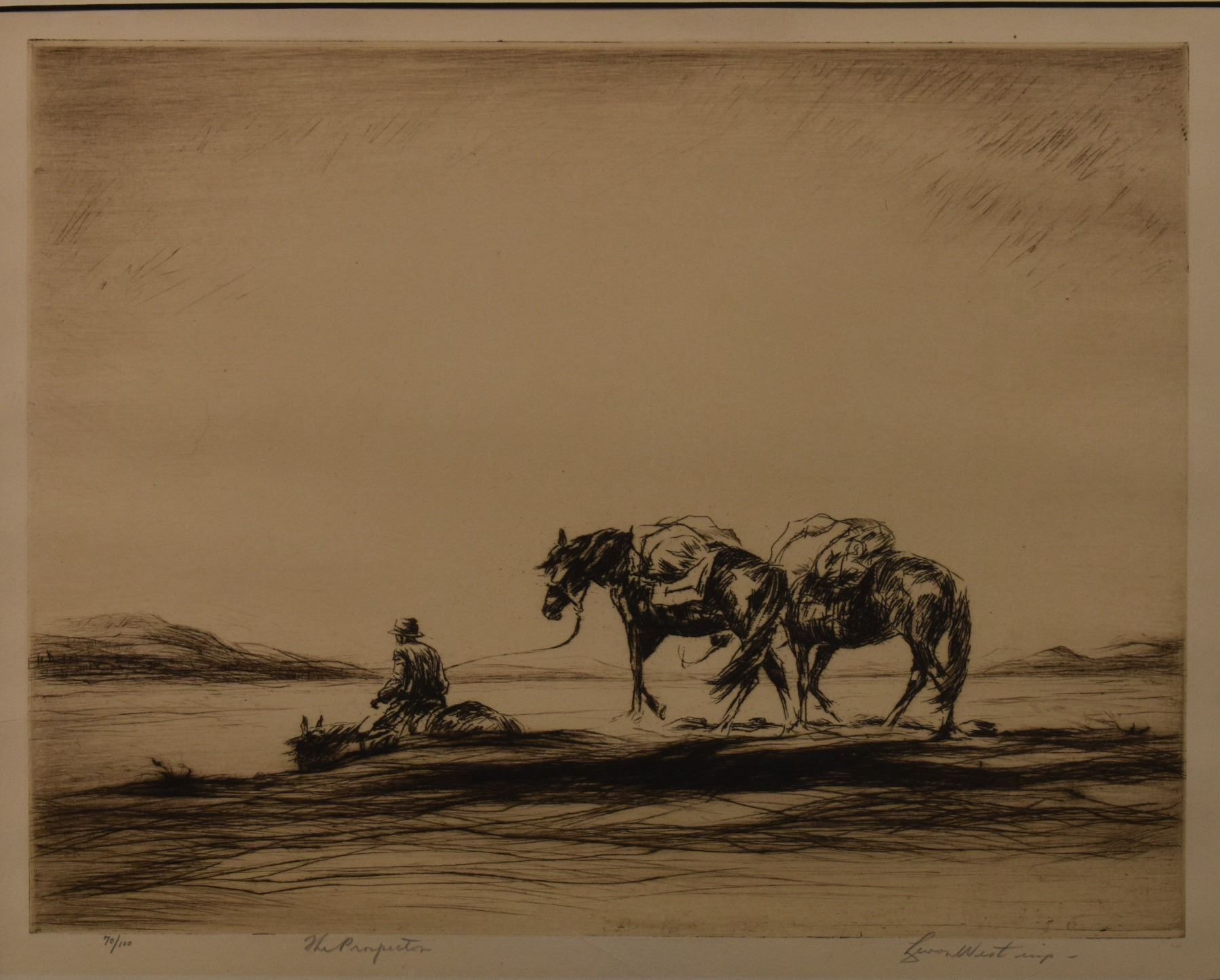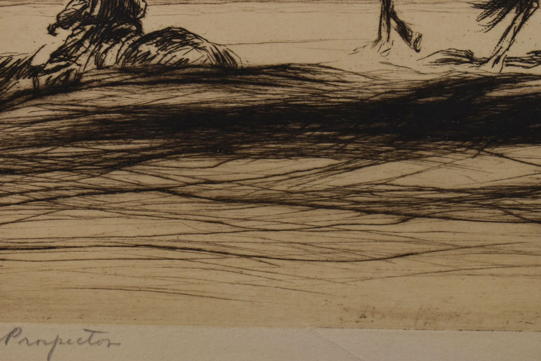1928 etching titled "The Prospector" by Levon West number 70/100. 9" x 11.5" framed to 17.5" x 19.5"