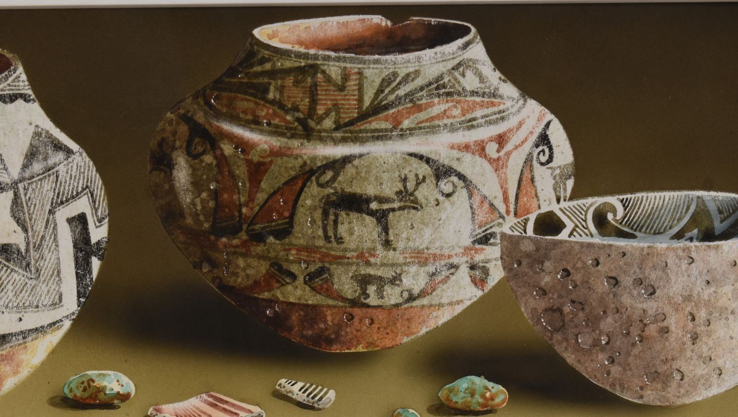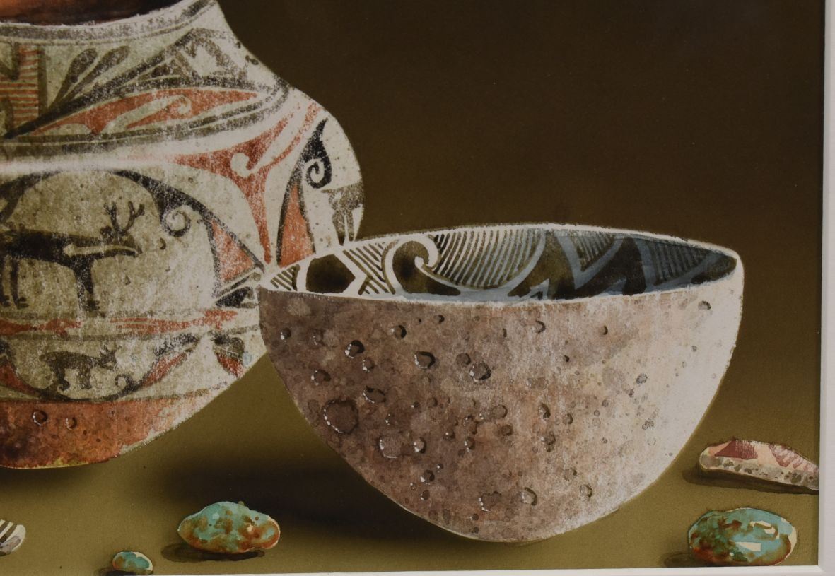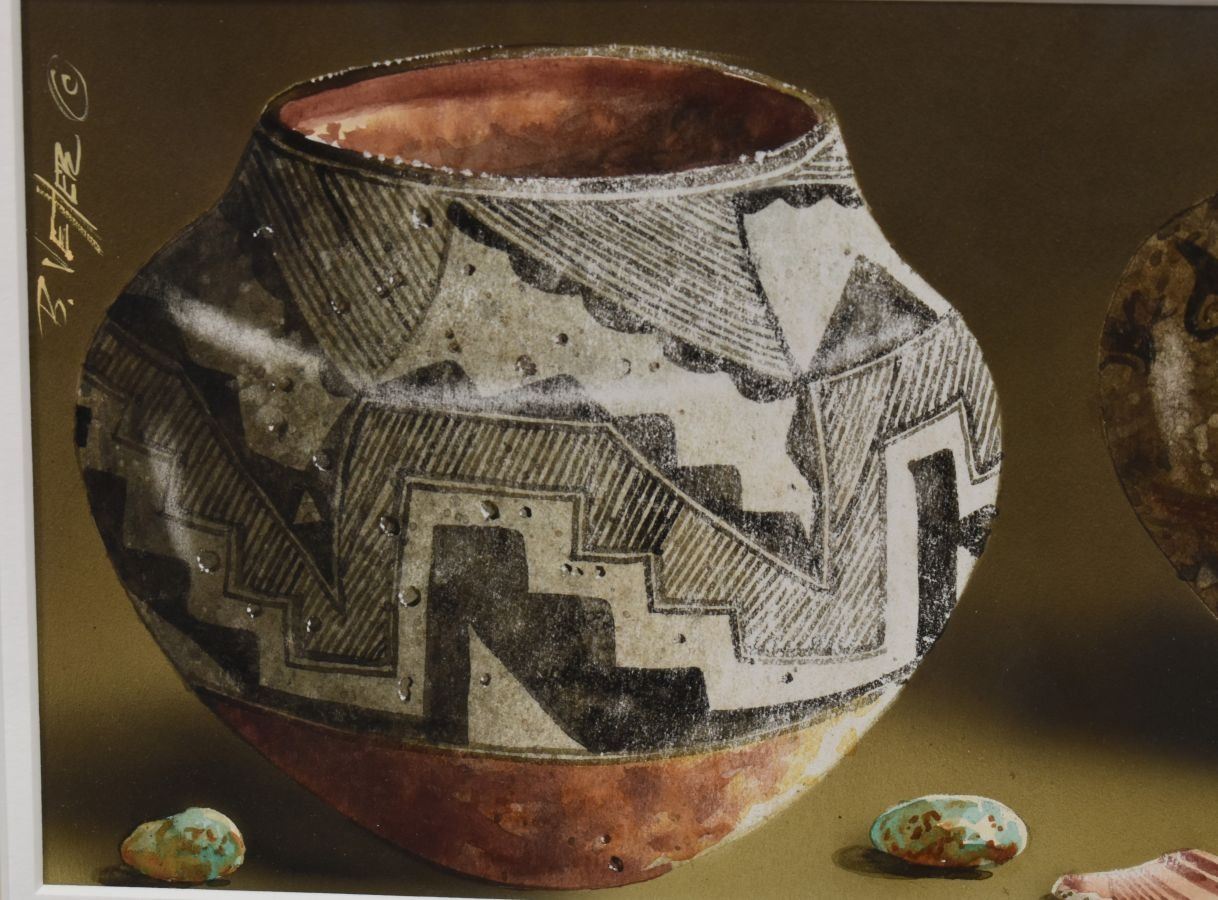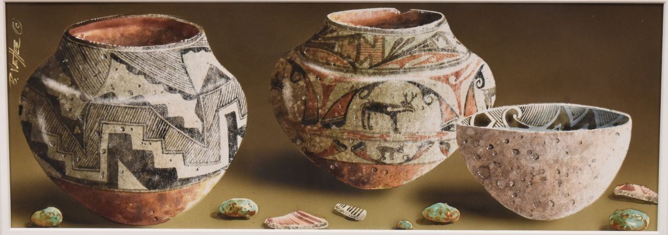 1990's Western. Original on paper depicting native pottery signed B Vetter. 7'' x 18'' frame size 14'' x 26''