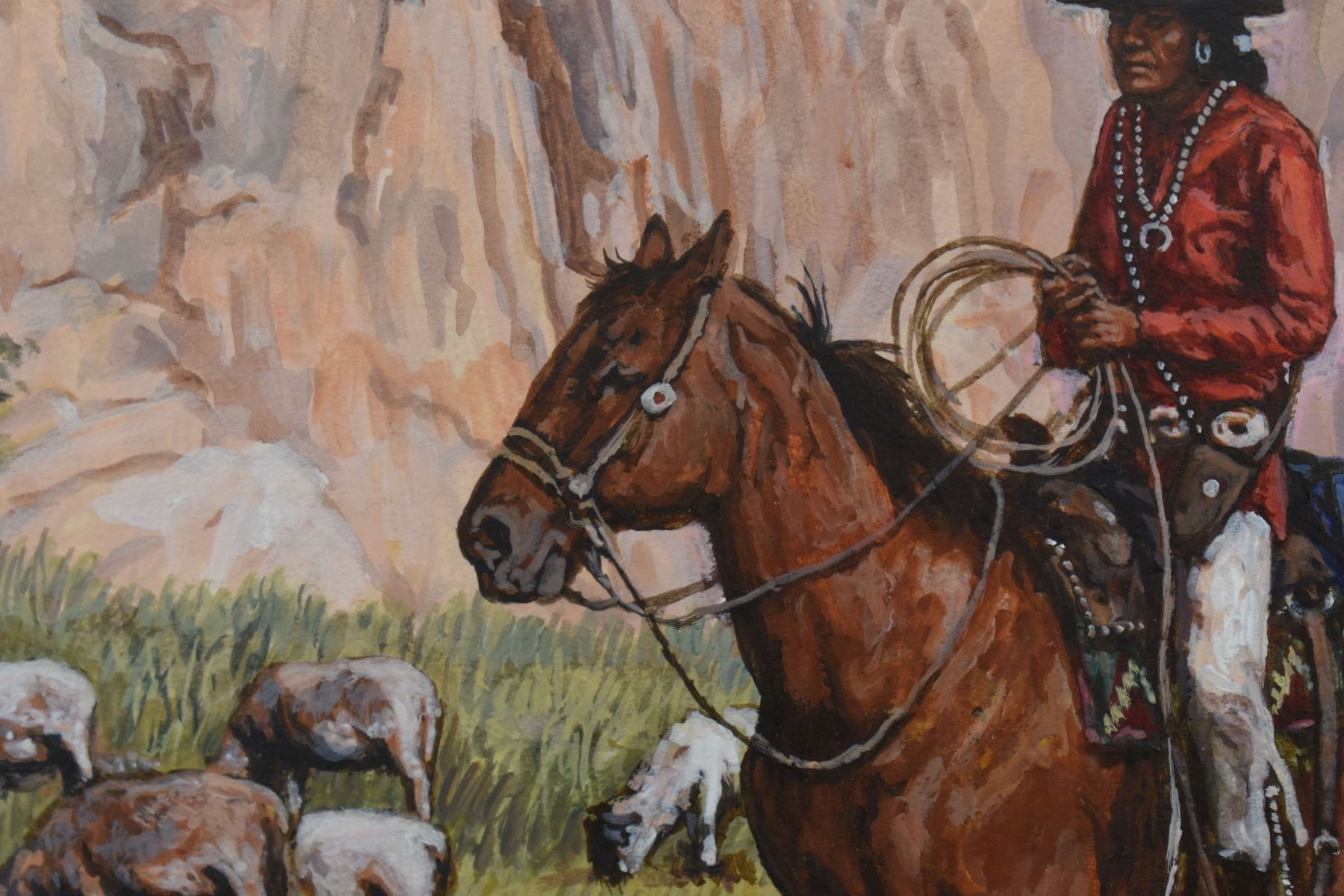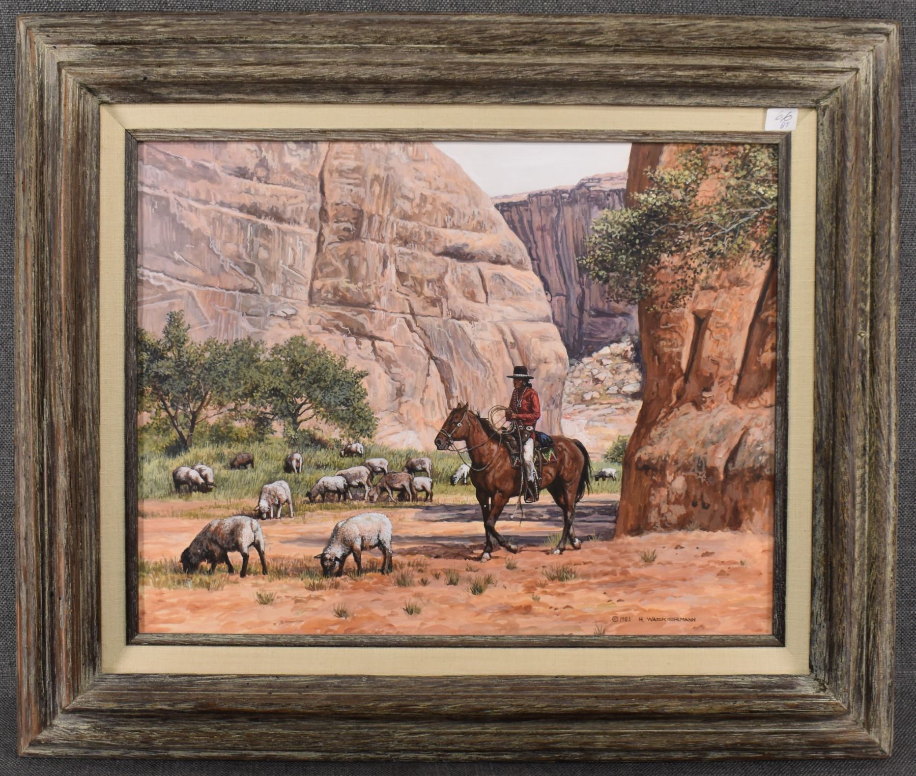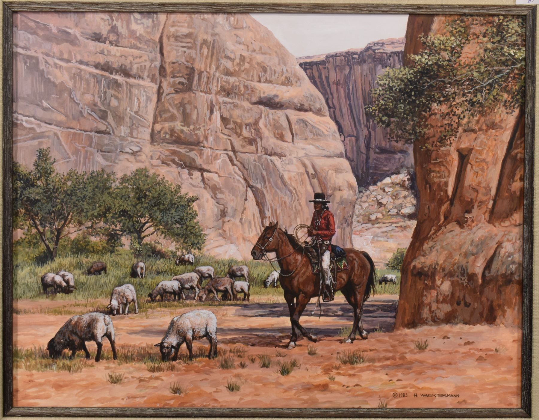1983 western. Original on artist board depicting Navajo sheepherder, signed H. Wackermann. 14'' x 18'' frame size 21'' x 25''