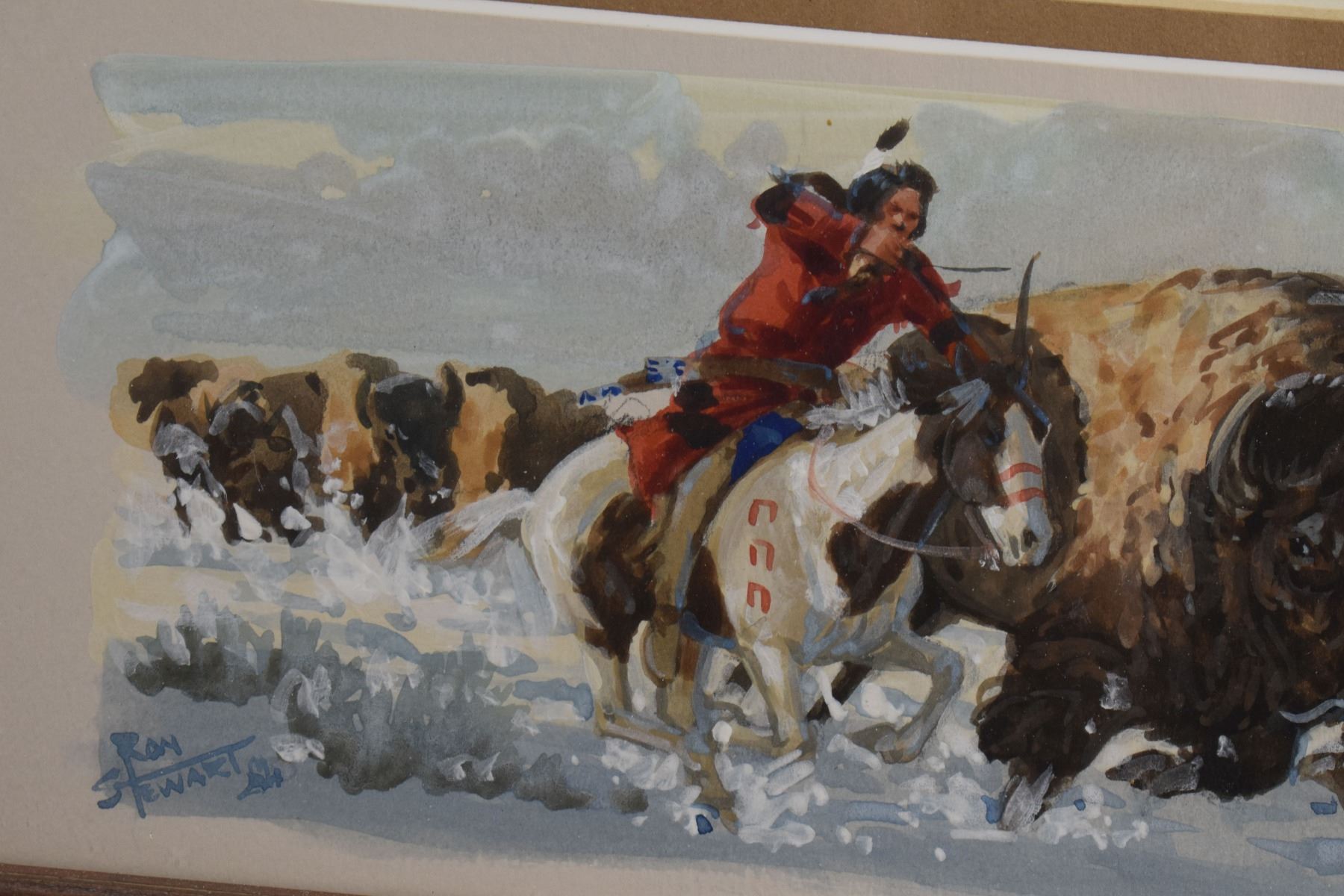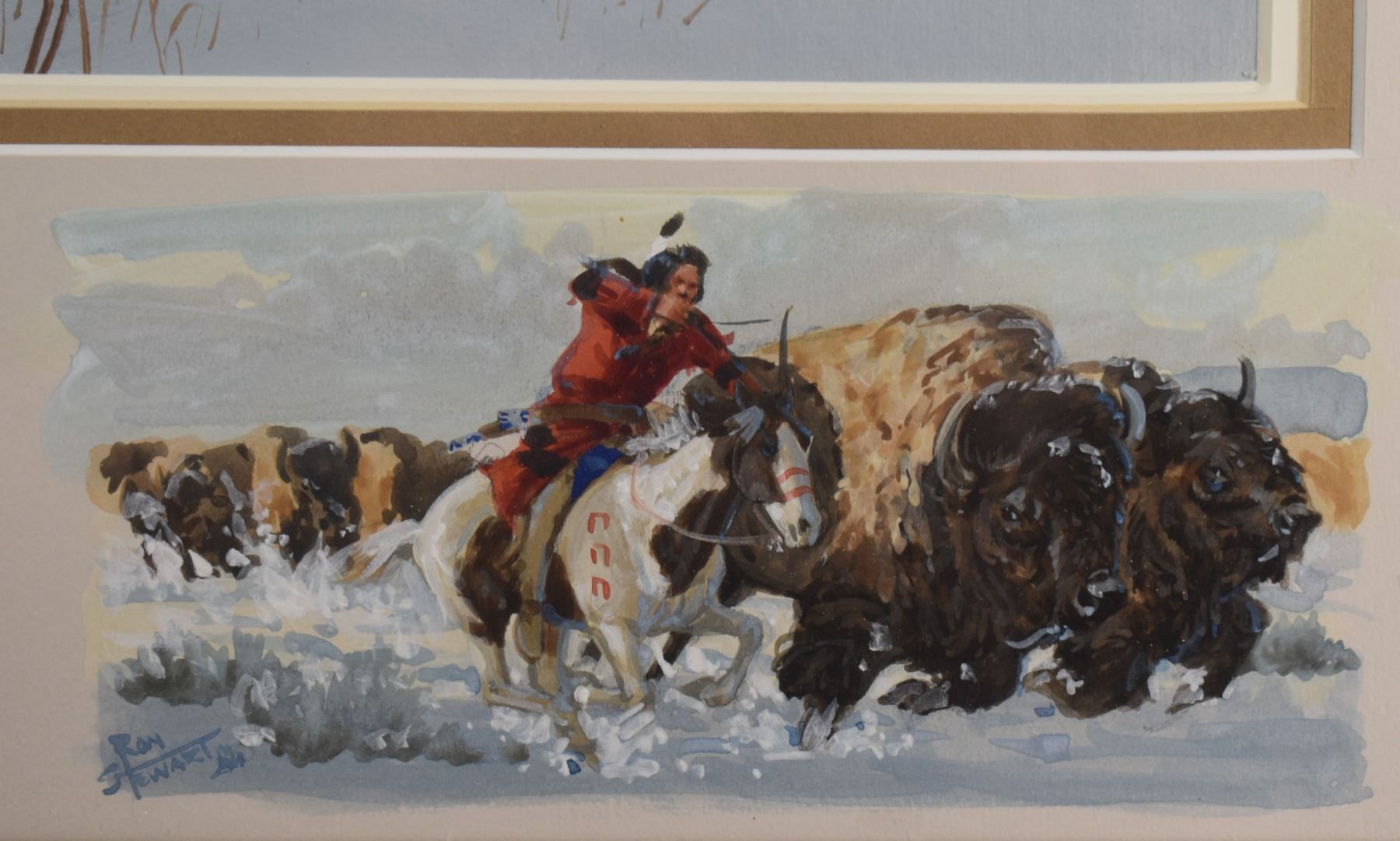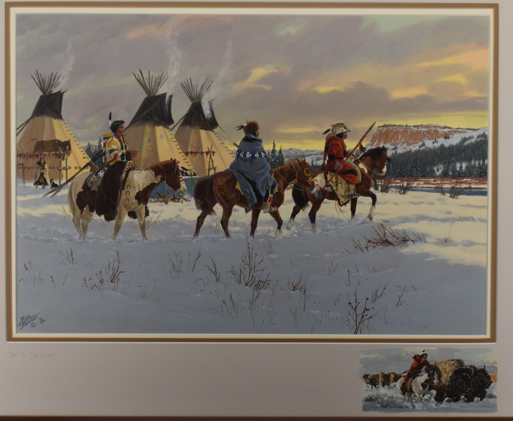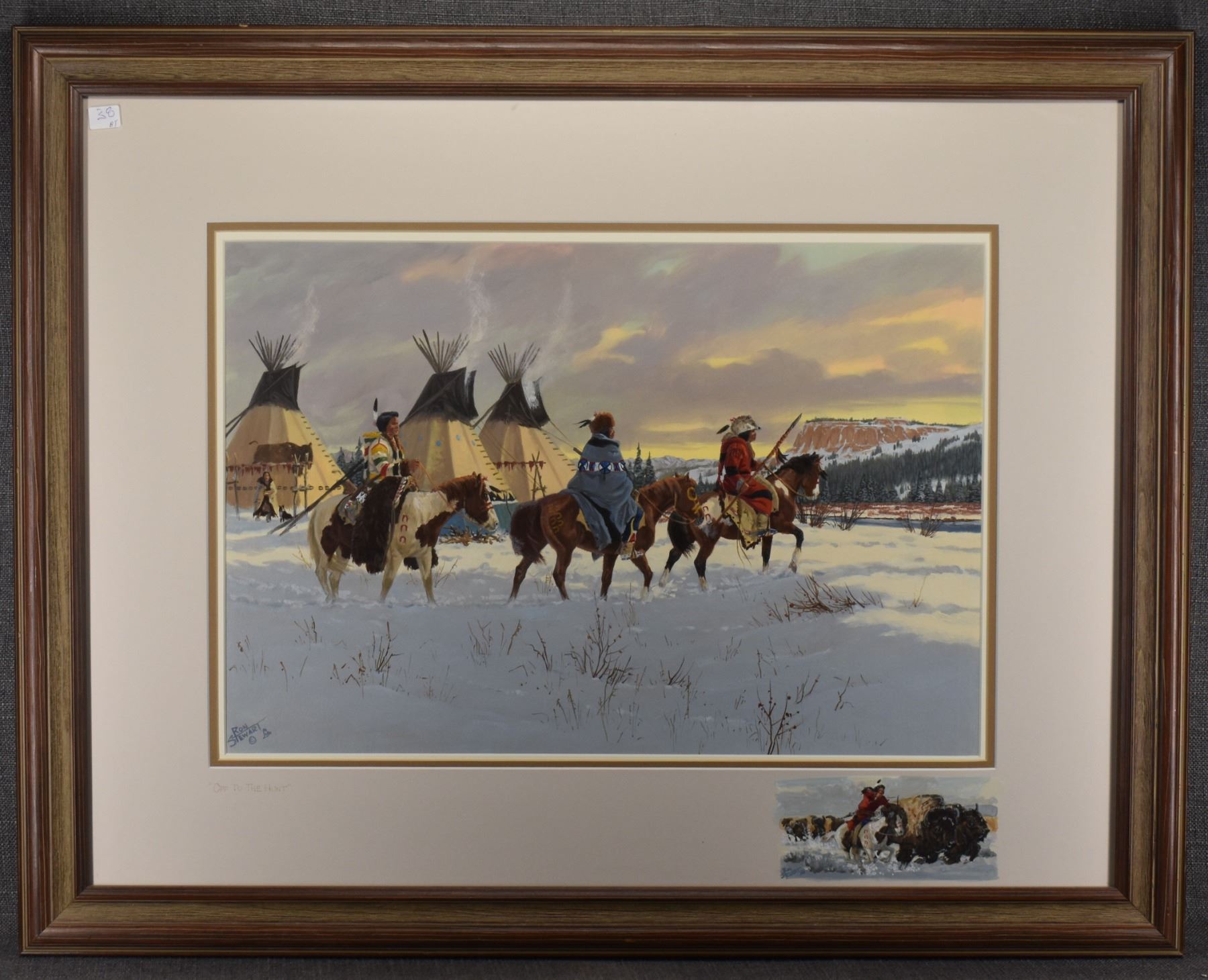 1970's Western. Original on paper depicting Native Hunting party. Signed Ron Stewart. 15'' x 21'' and original 3'' x 6'' hunt scene in bottom right corner, frame size 26'' x 34''