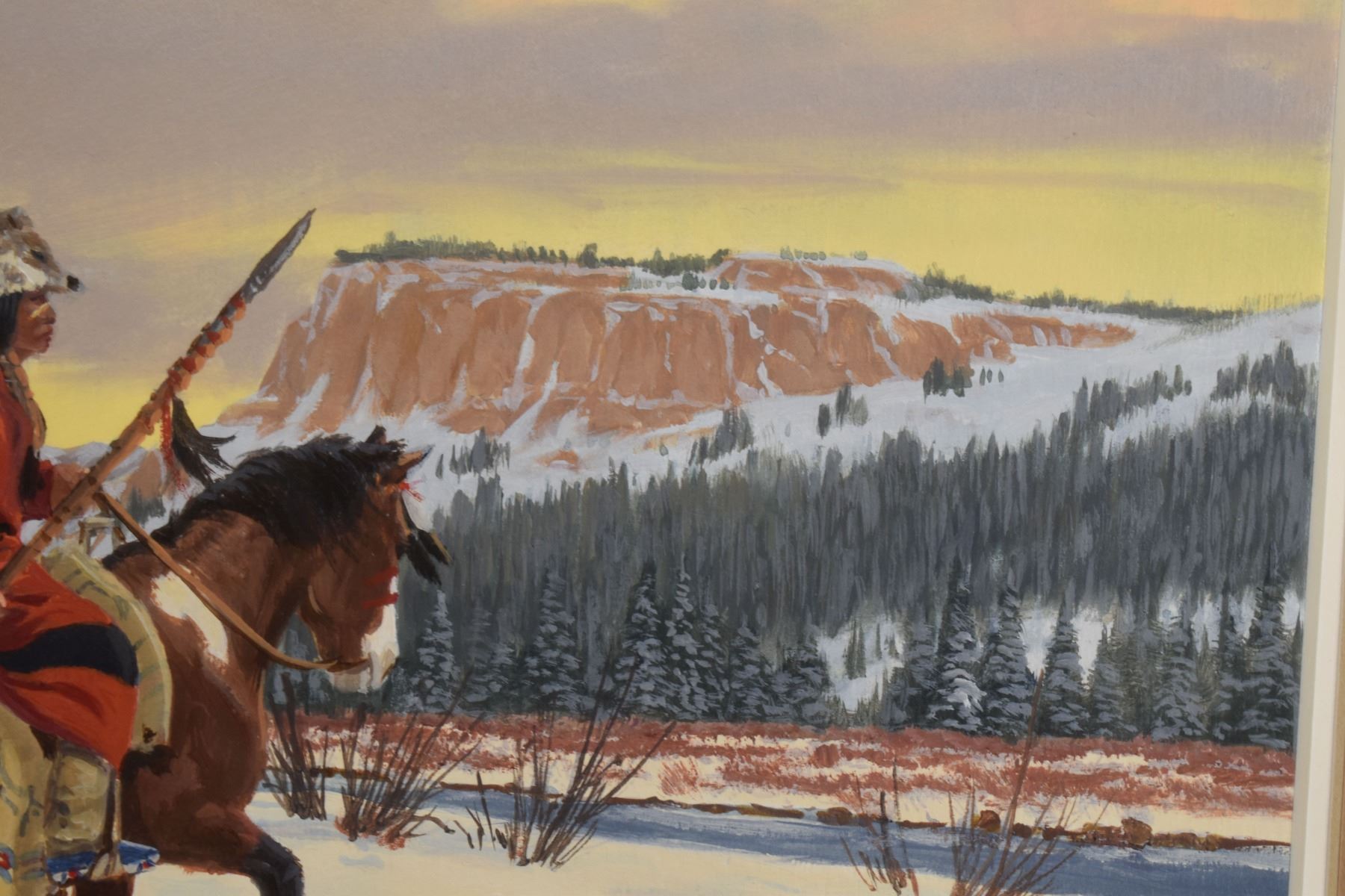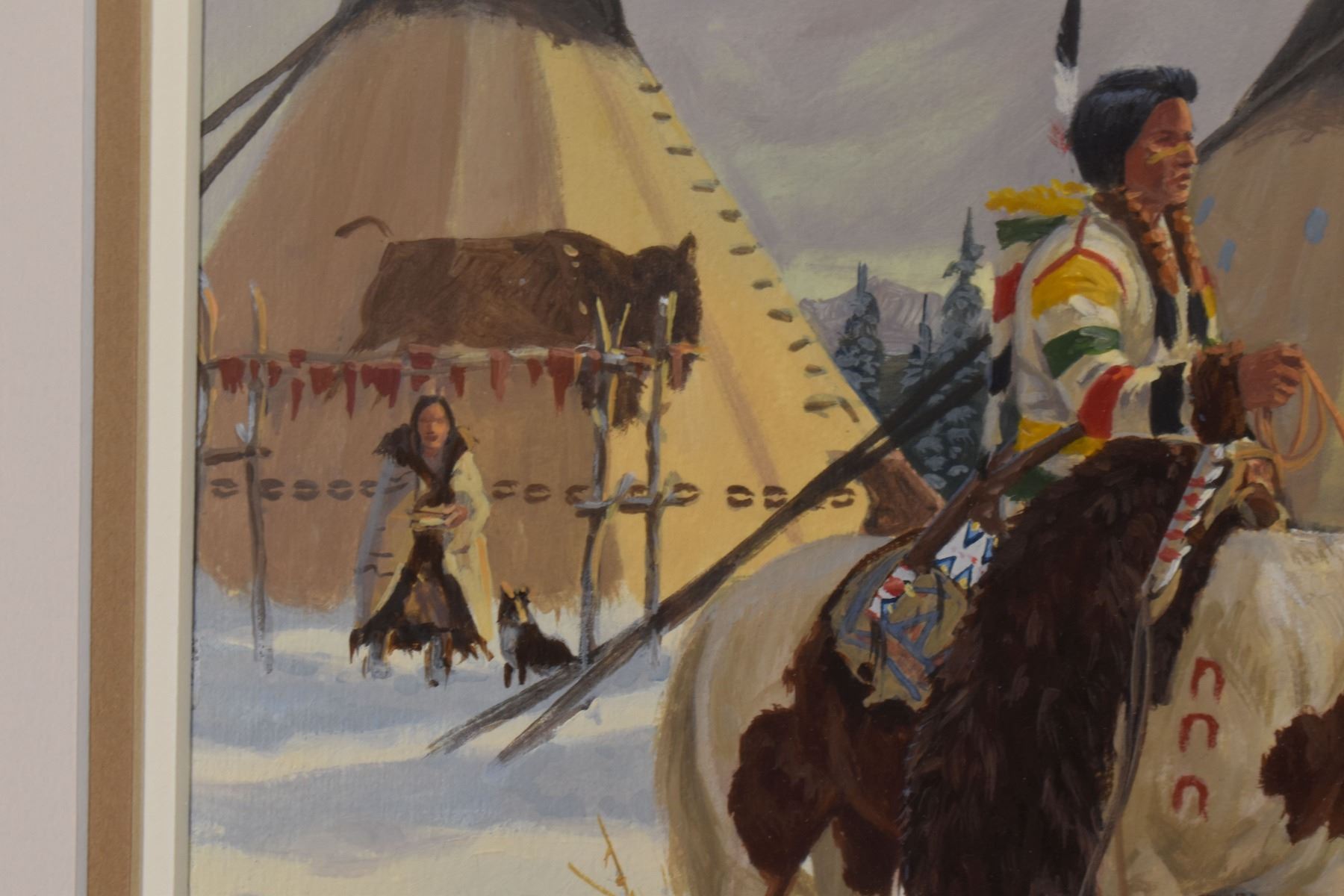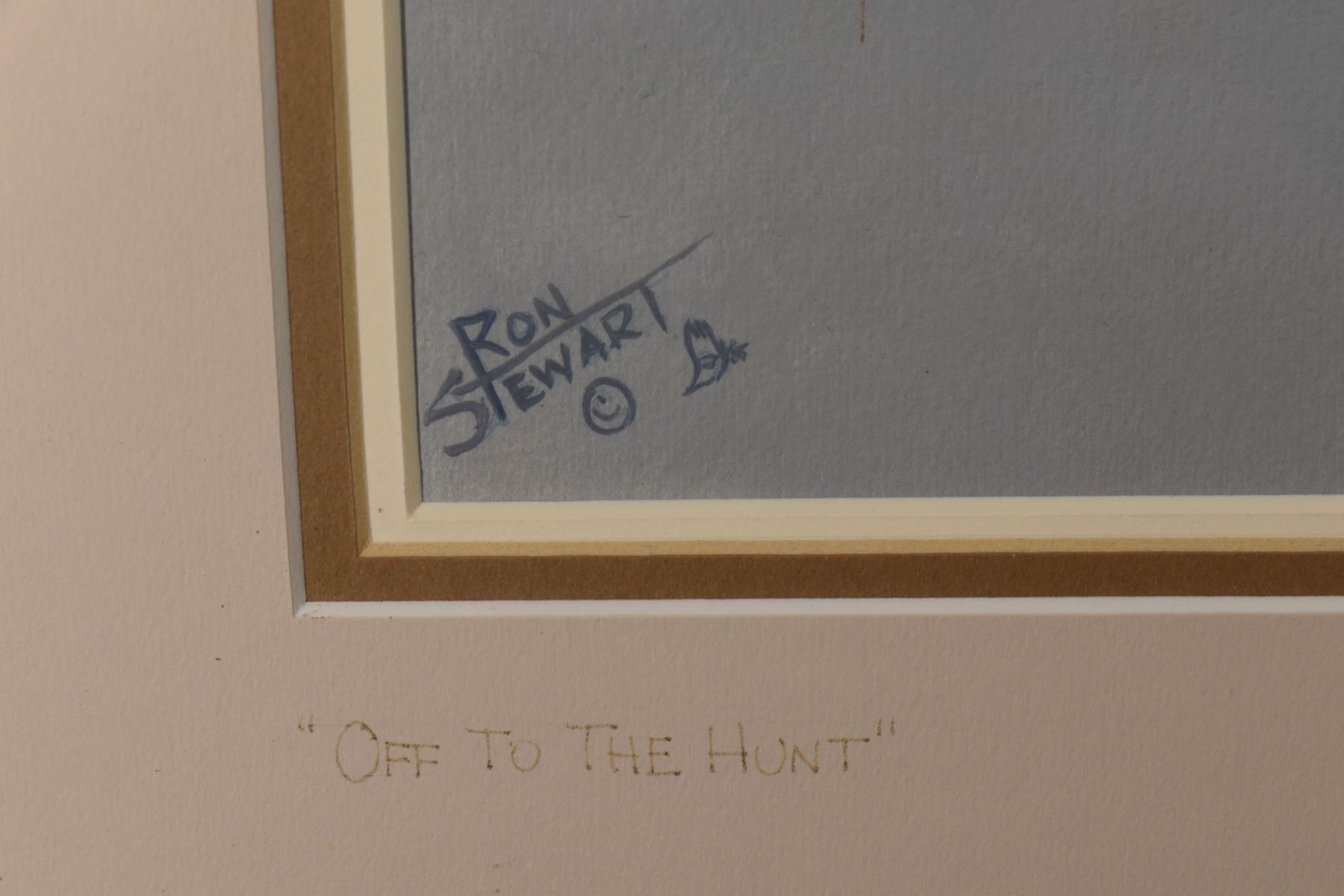 1970's Western. Original on paper depicting Native Hunting party. Signed Ron Stewart. 15'' x 21'' and original 3'' x 6'' hunt scene in bottom right corner, frame size 26'' x 34''