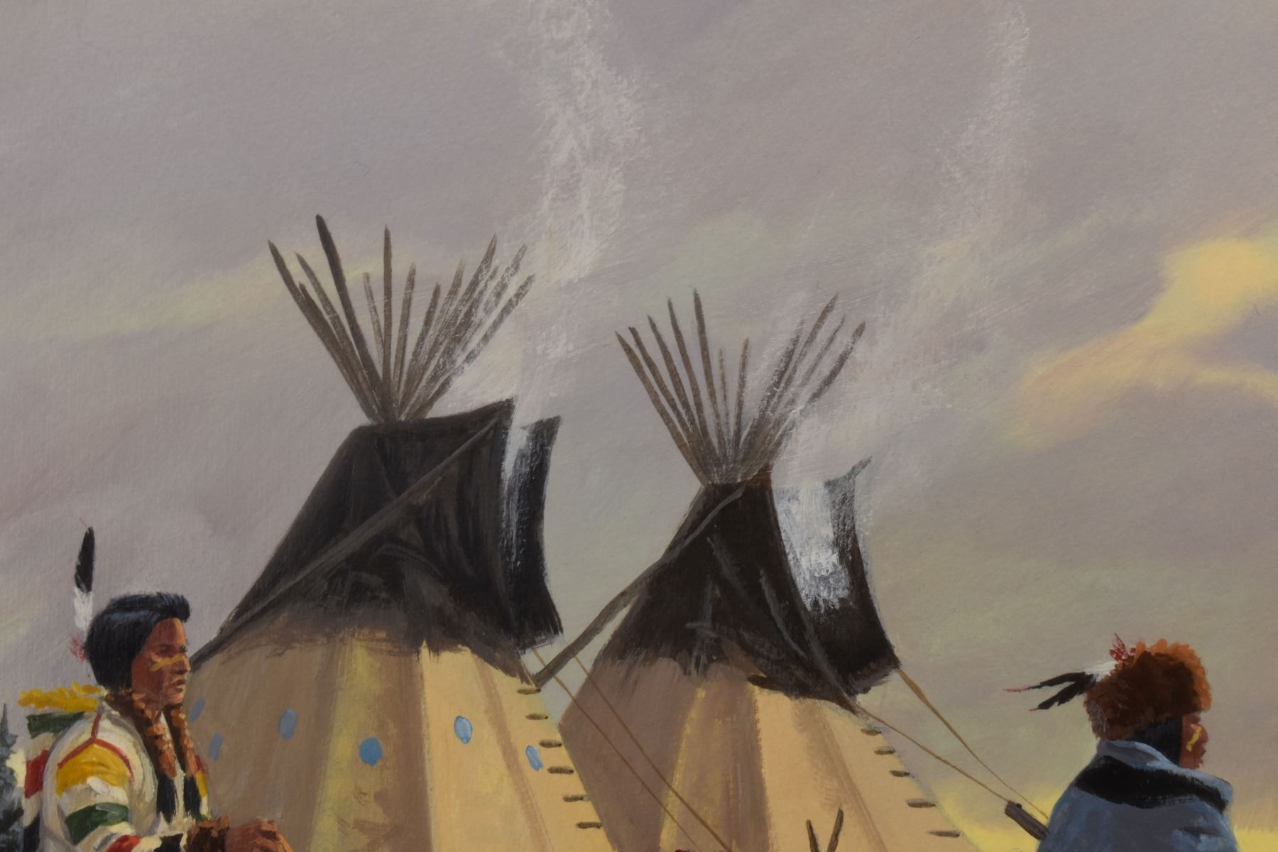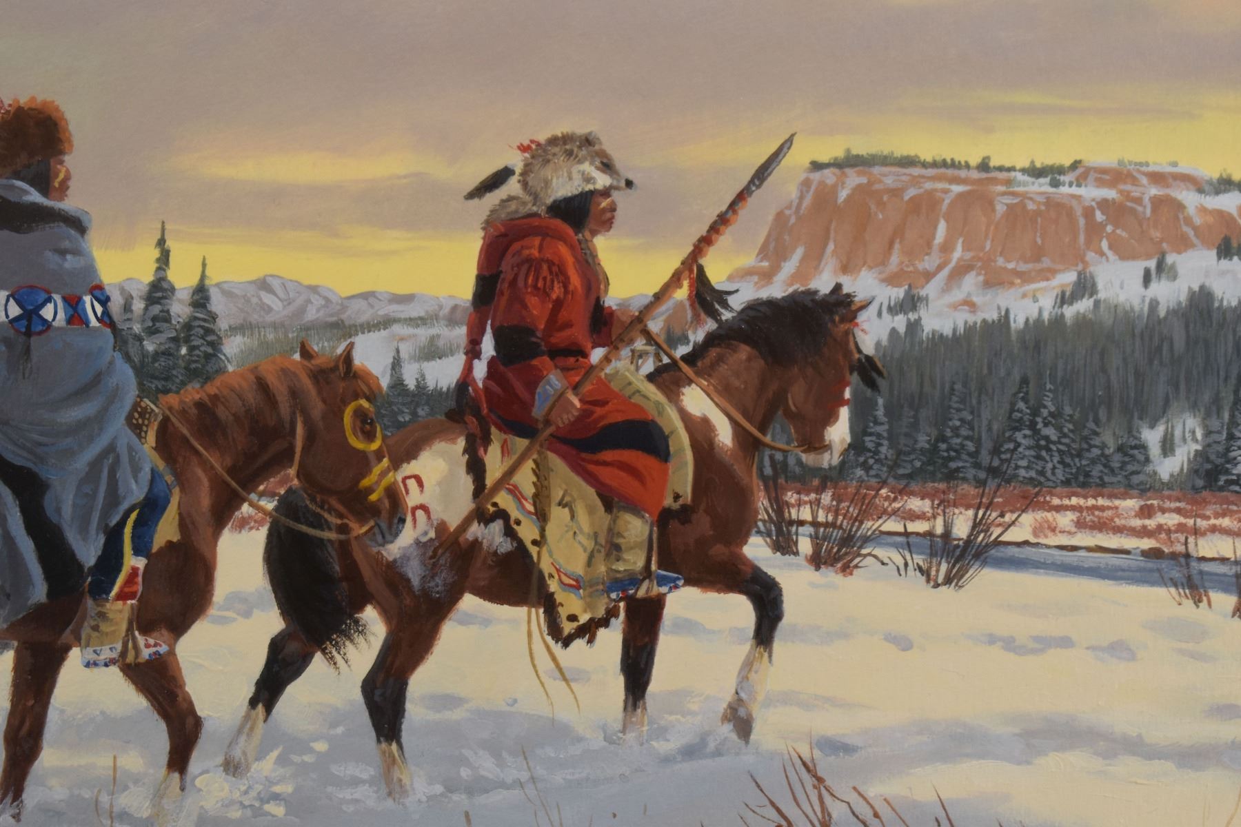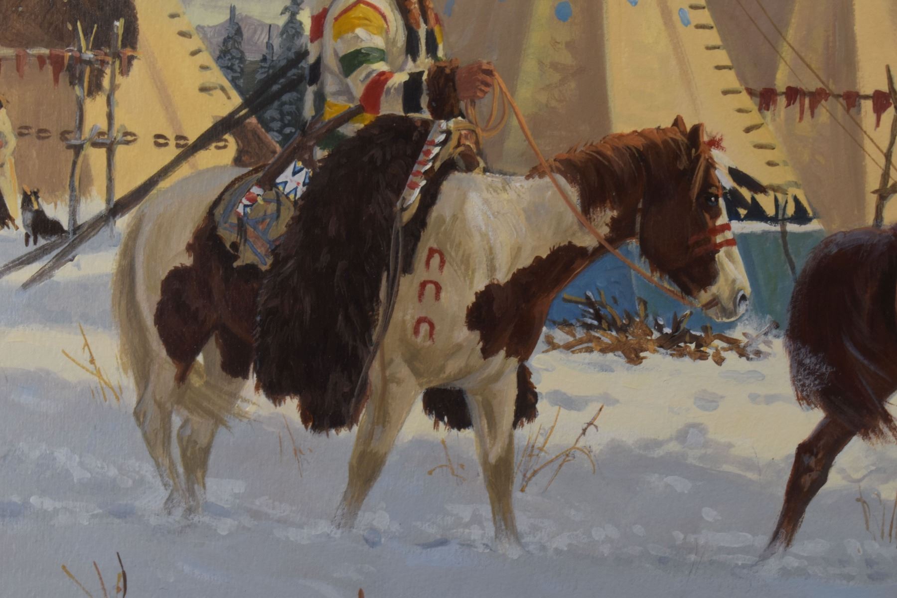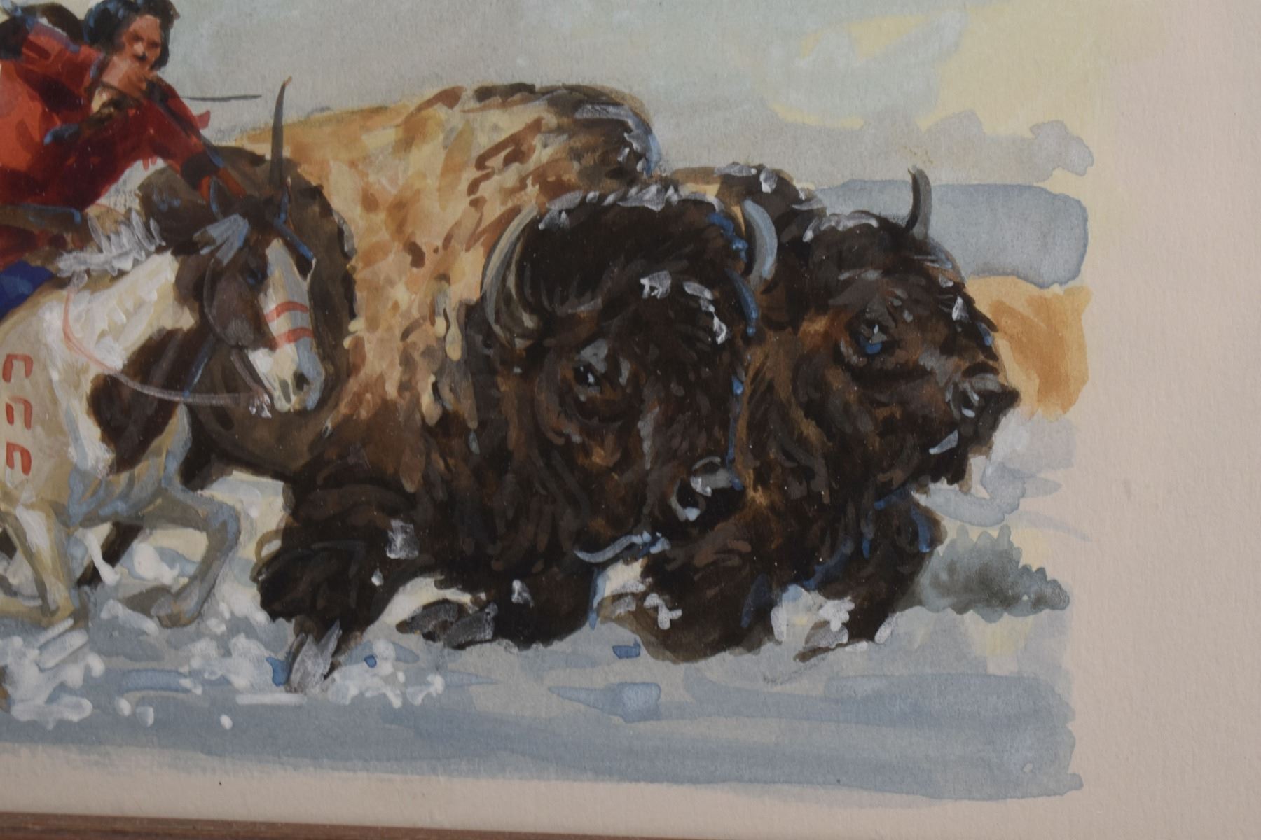 1970's Western. Original on paper depicting Native Hunting party. Signed Ron Stewart. 15'' x 21'' and original 3'' x 6'' hunt scene in bottom right corner, frame size 26'' x 34''