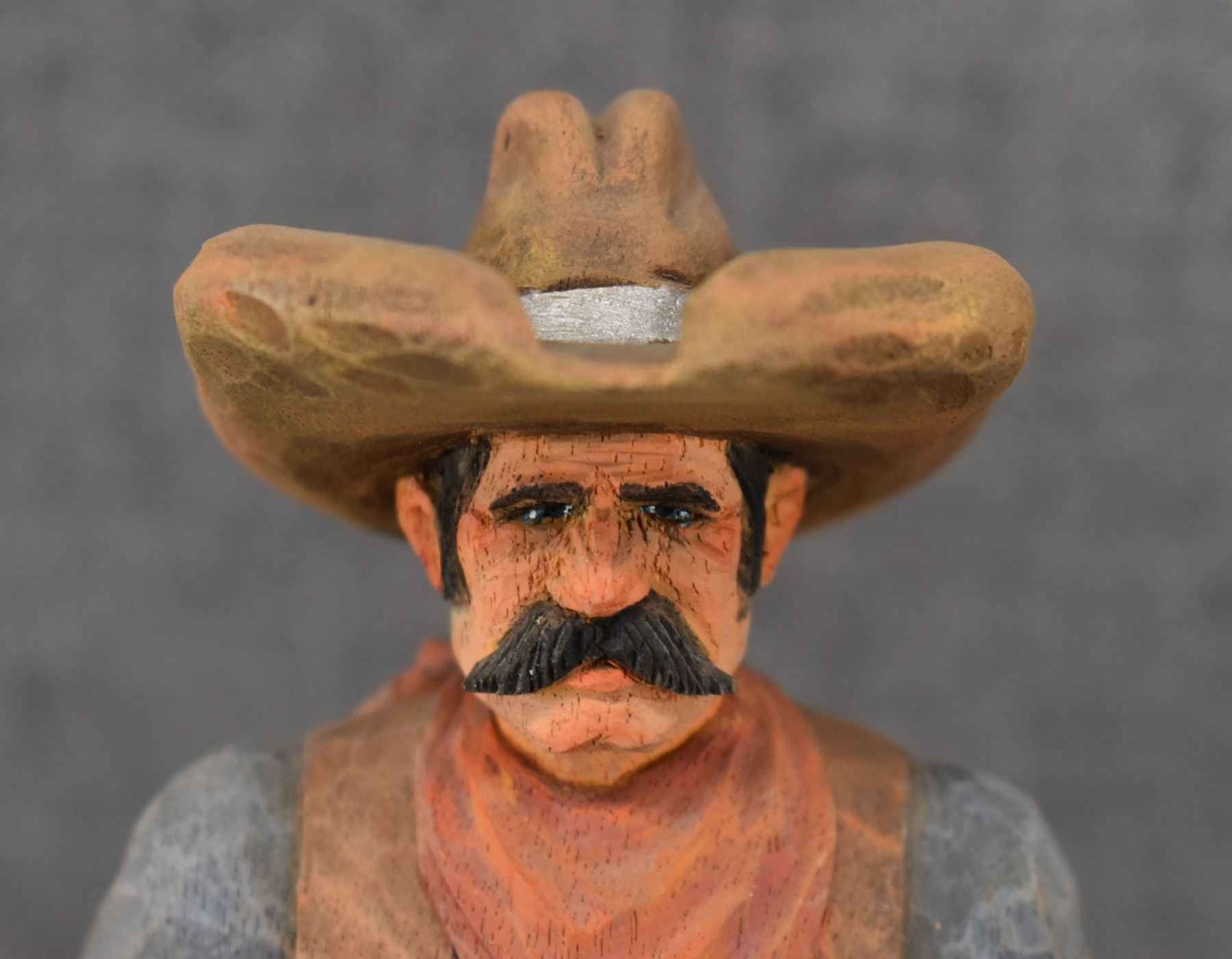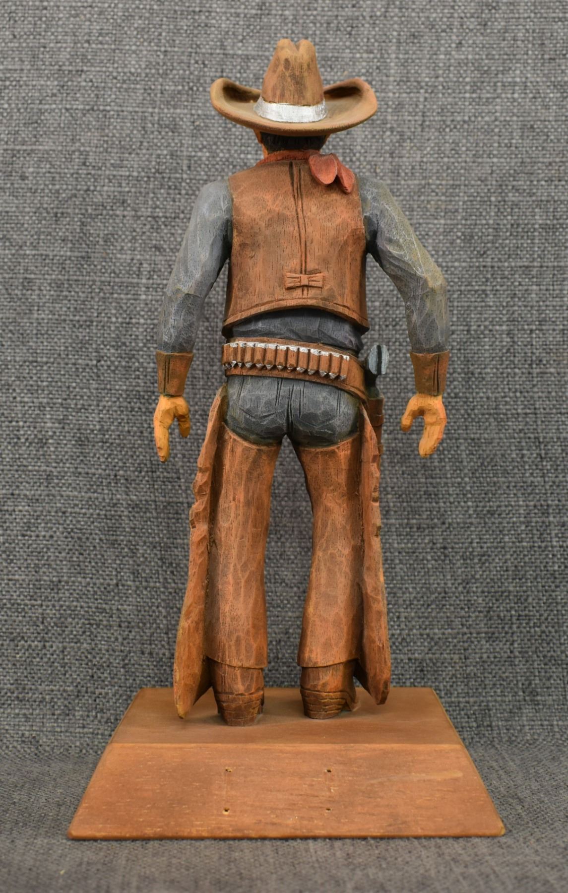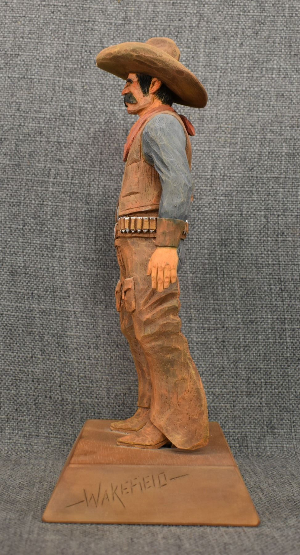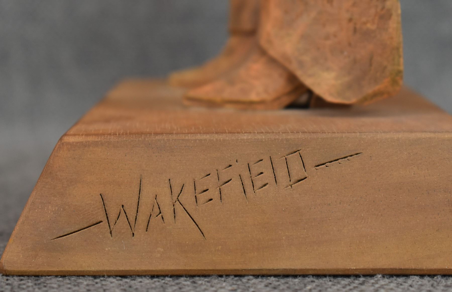 1963. western. hand carved and painted wood depicting cowboy signed Cecil Wakefield. 11'' tall