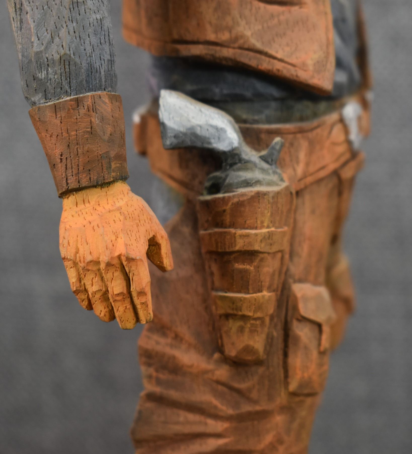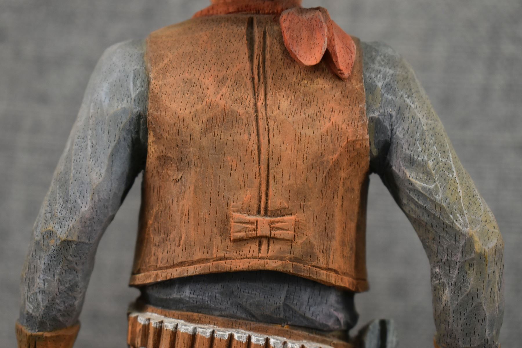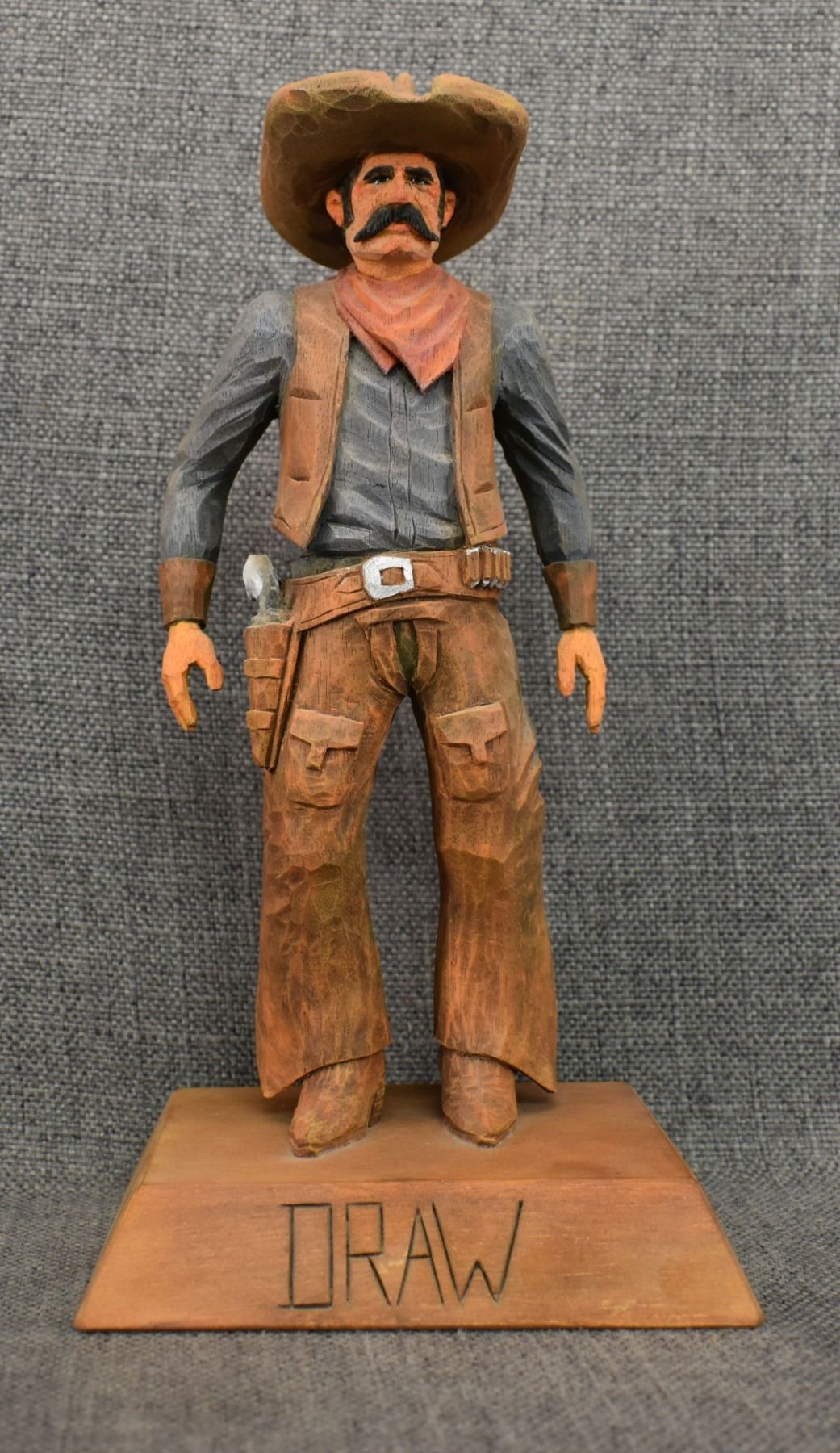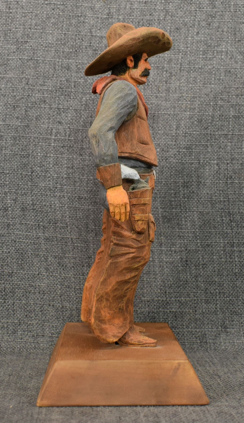 1963. western. hand carved and painted wood depicting cowboy signed Cecil Wakefield. 11'' tall