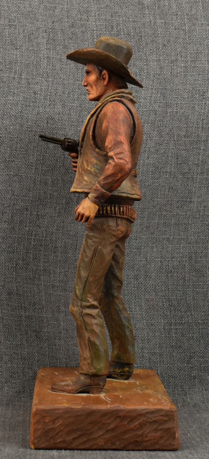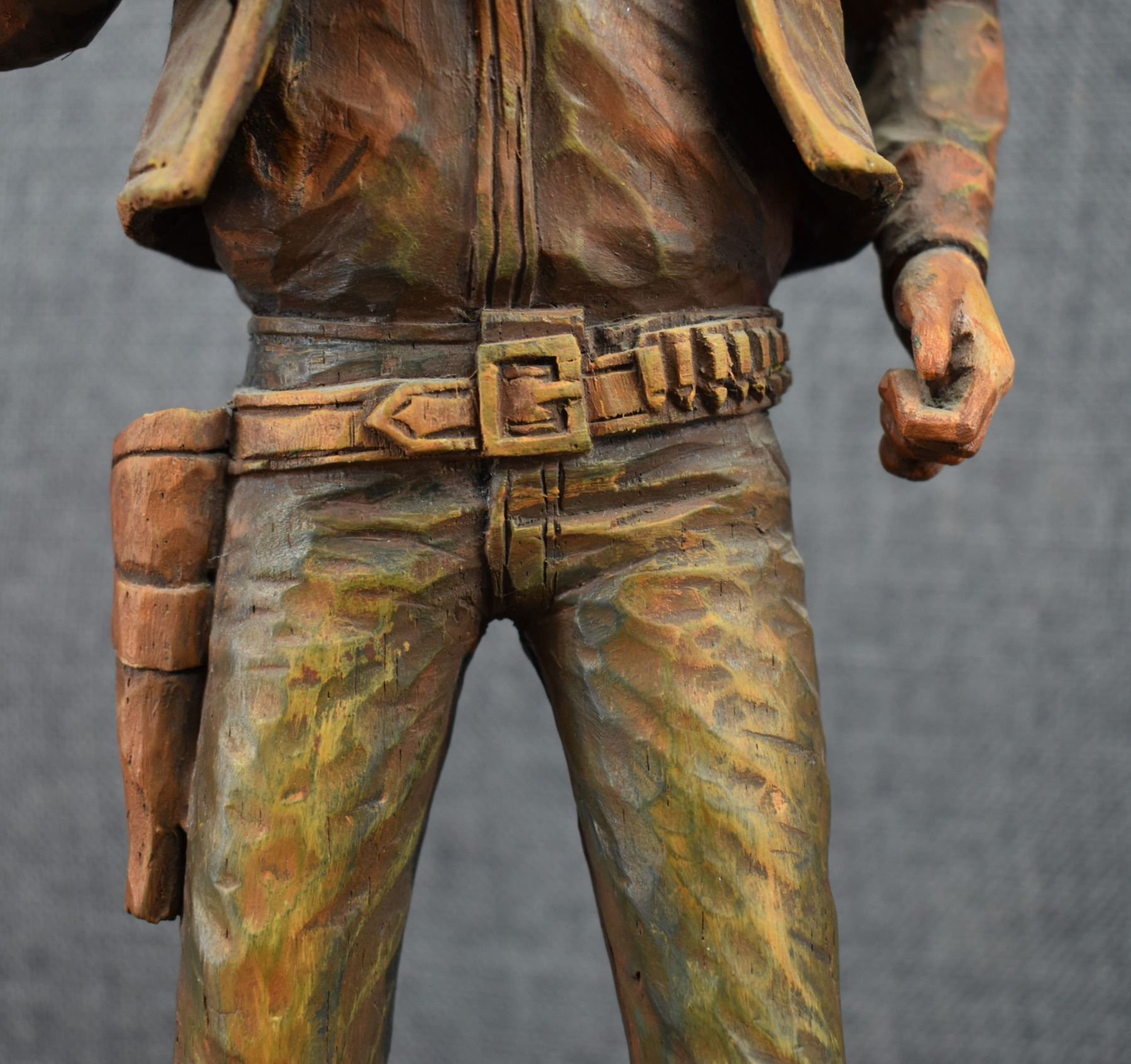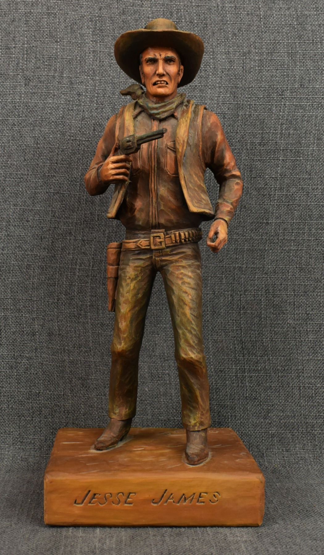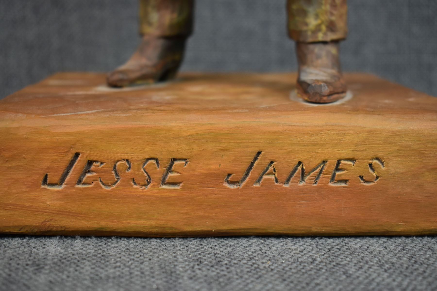 1960's Western. Hand carved wood depicting Jessie James. Signed Dee Flagg. 15'' tall